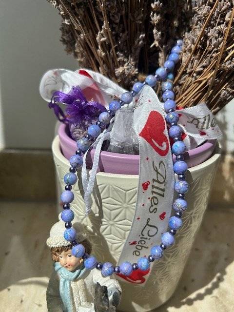 Mărgelele sunt înșirate pe sârmă siliconată de 0,45 mm grosime, iar închiderea se face cu închizătoare magnetică din aliaj de culoarea bronzului.