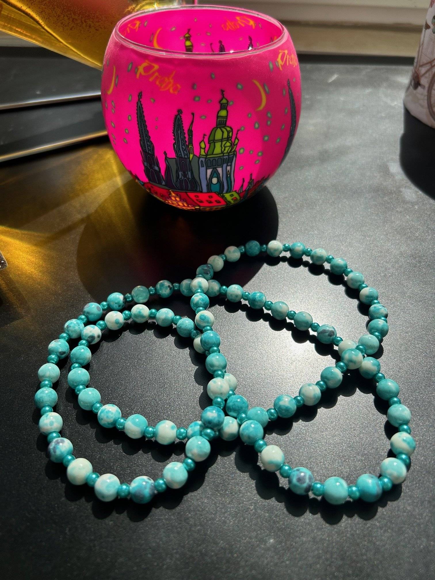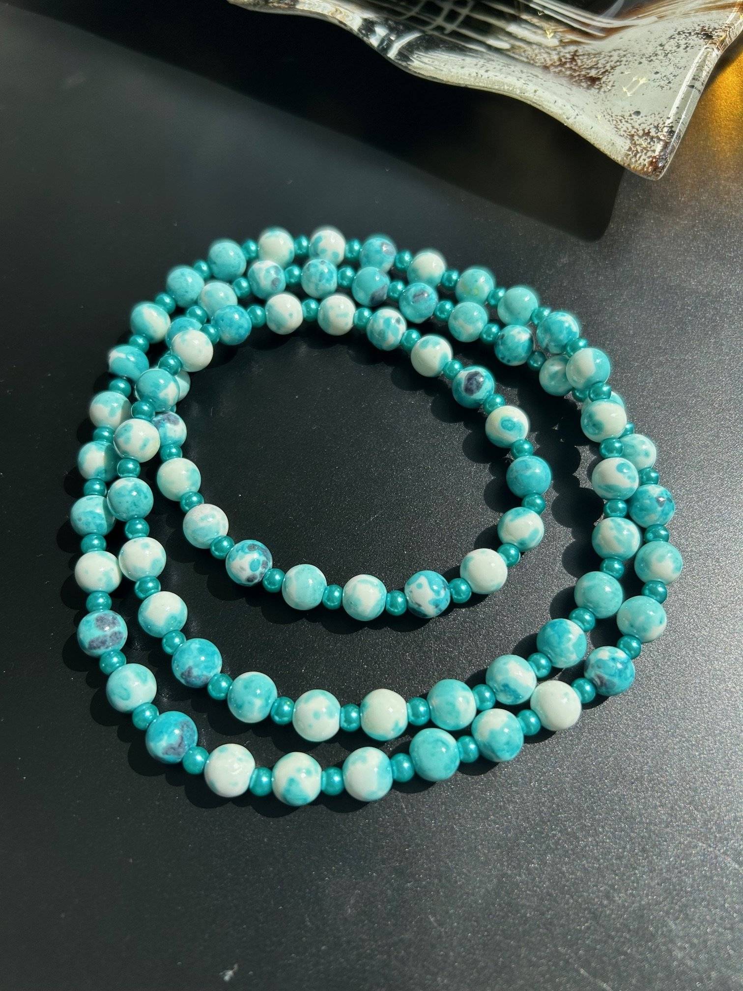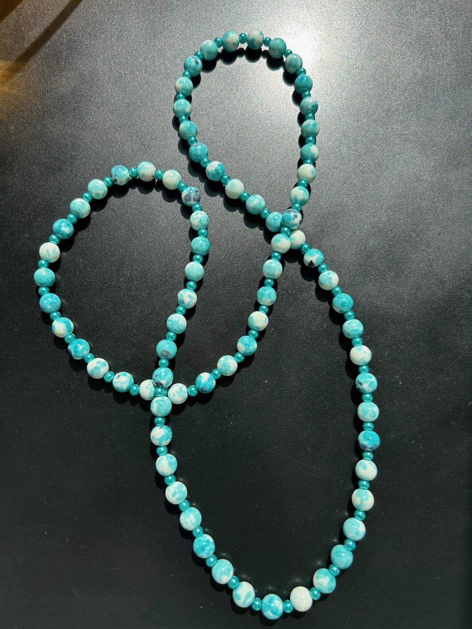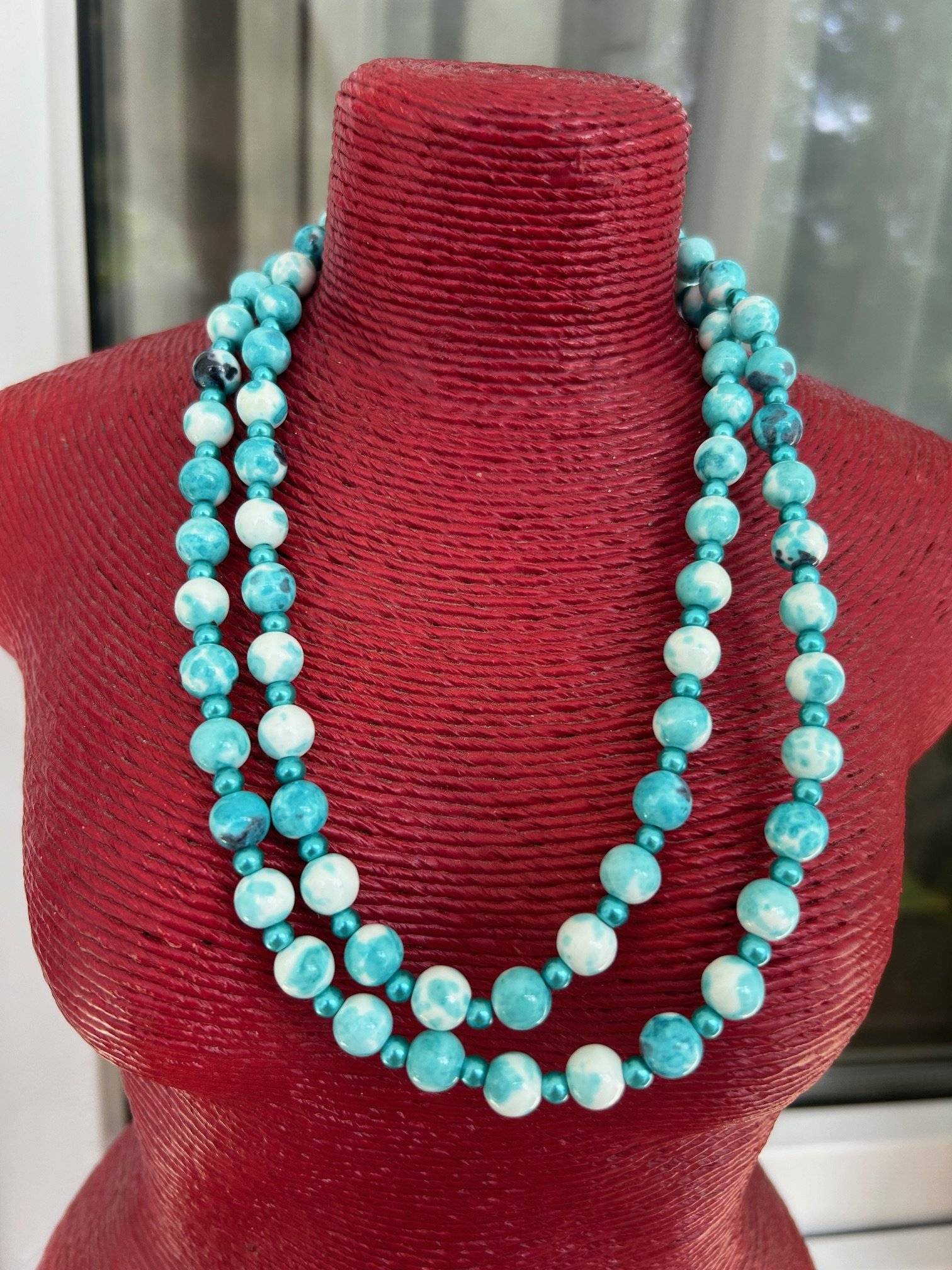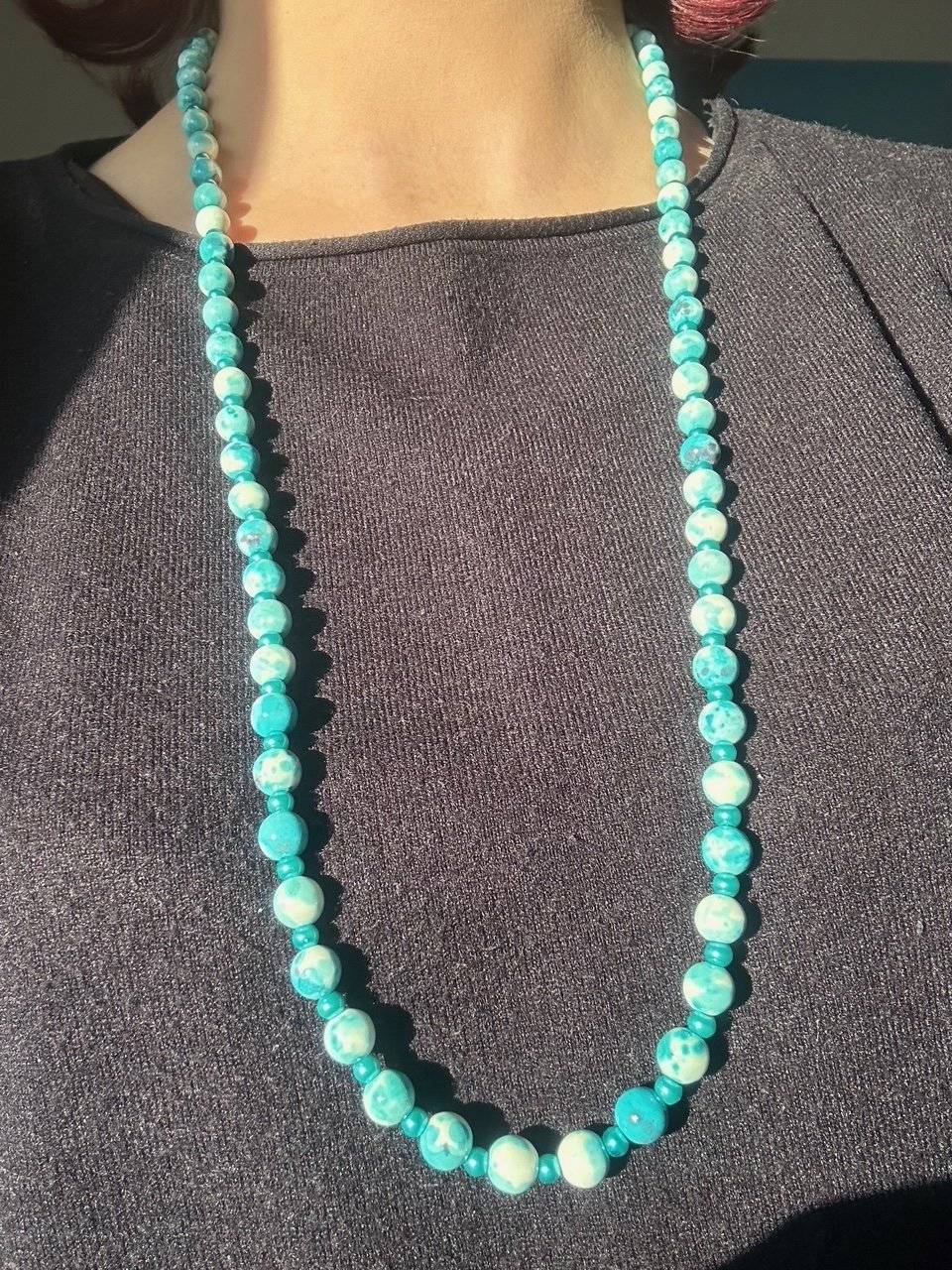 - piatră sintetică sakura jade albastră, sfere cu dimensiunea de 8 mmLungimea colierului este de cca. 84 cm.