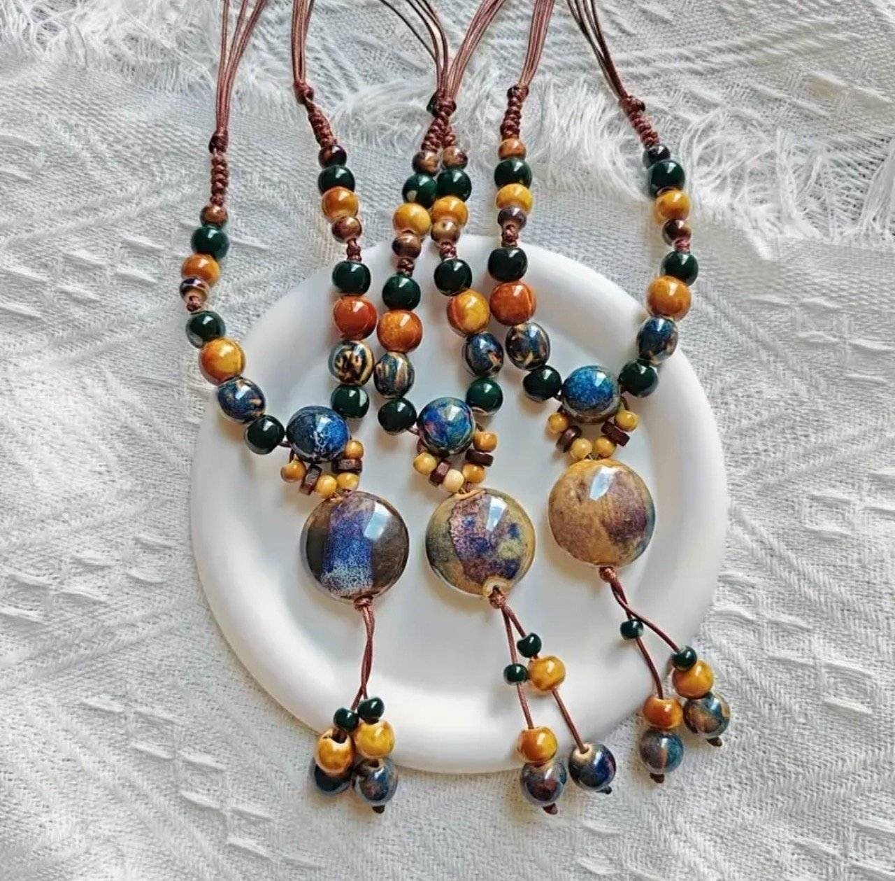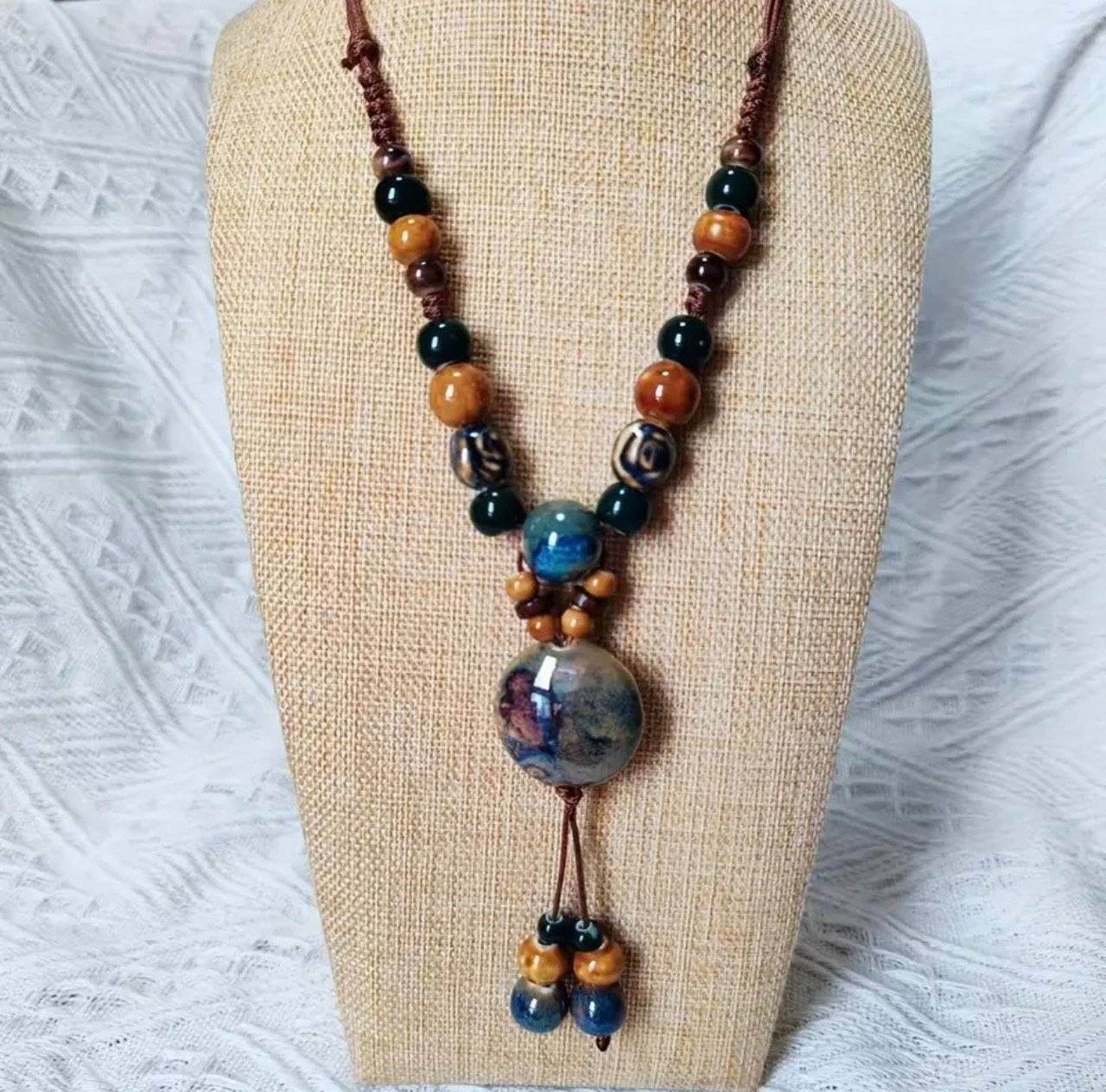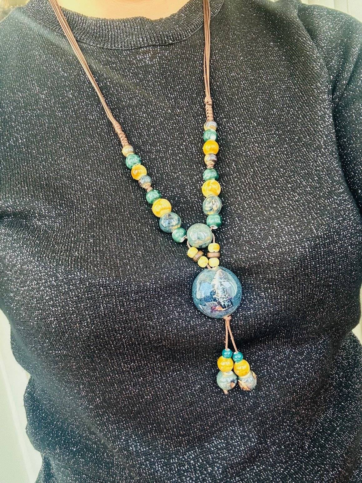 Vă prezentăm un rafinat colier din mărgele ceramice de diferite mărimi, în nuanțe bleumarin și crem, care sunt montate pe fir textil multistrat cu dimensiune reglabilă.