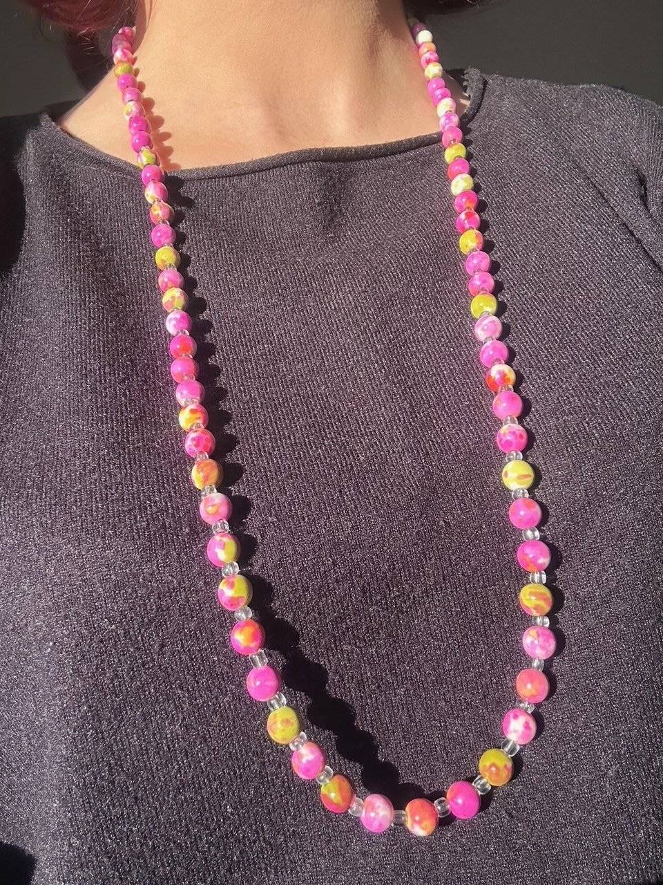 - piatră sintetică sakura jade compoziție alb/roz/muștar, sfere cu dimensiunea de 8 mmLungimea colierului este de cca. 86 cm.