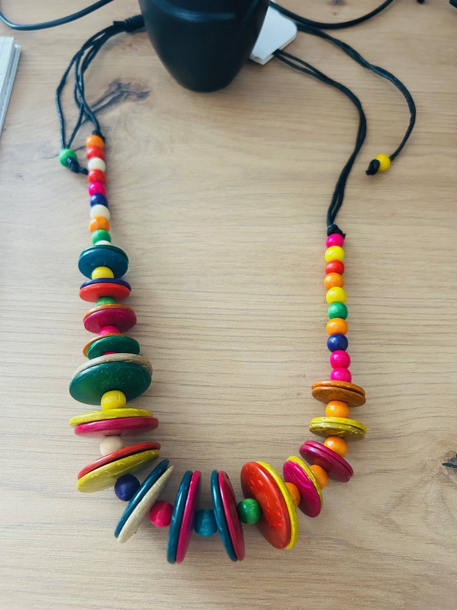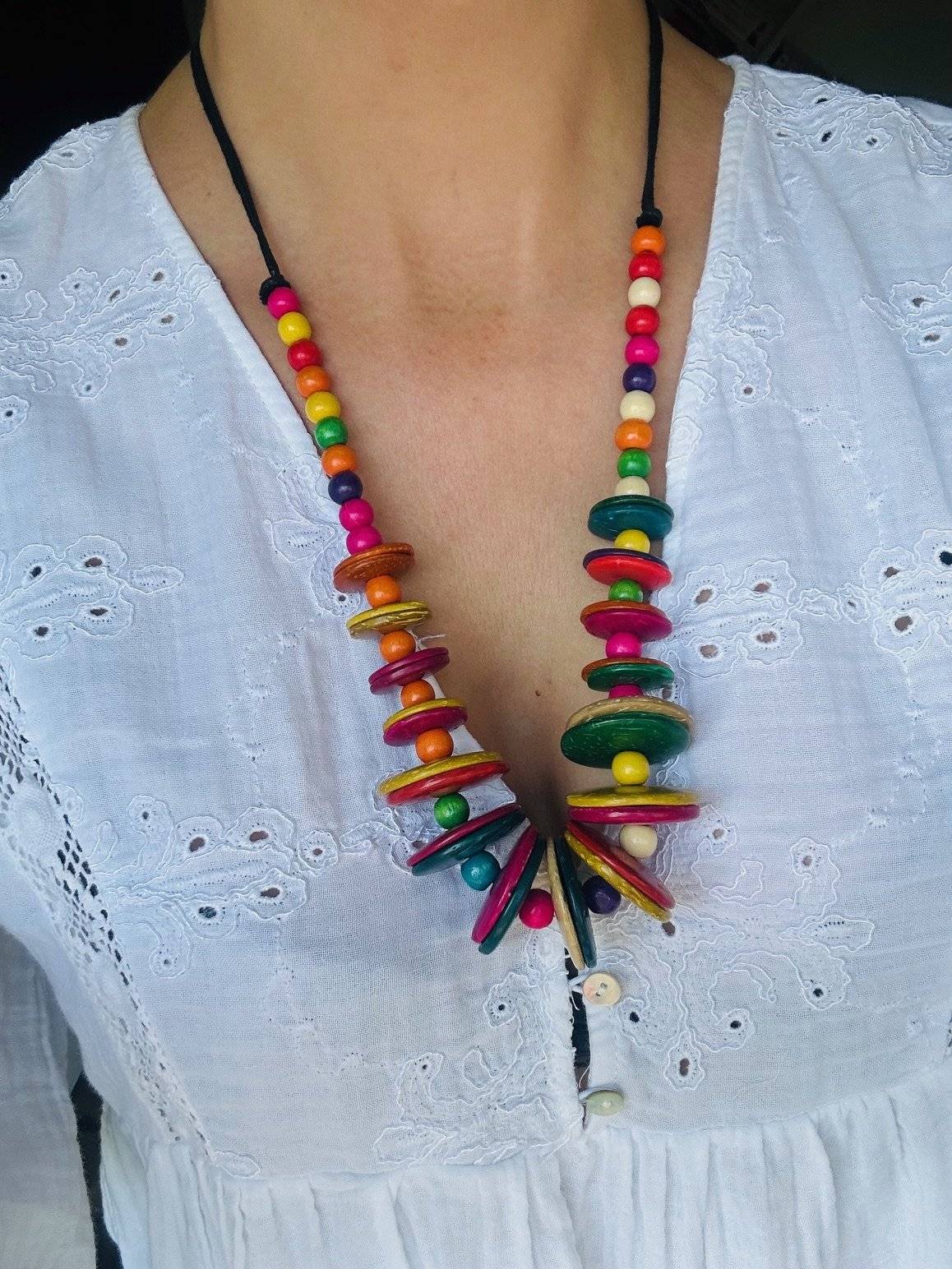 Colier-fantezie confecționat din discuri late și mărgele mici de lemn vopsit în diverse culori.