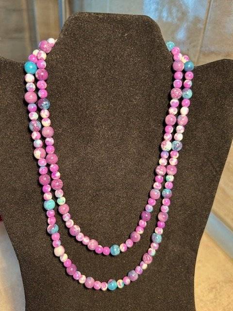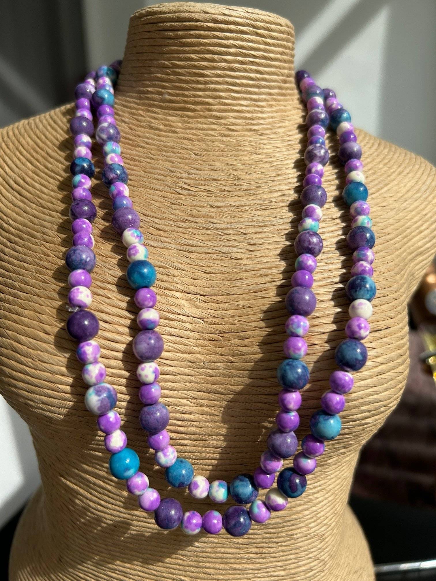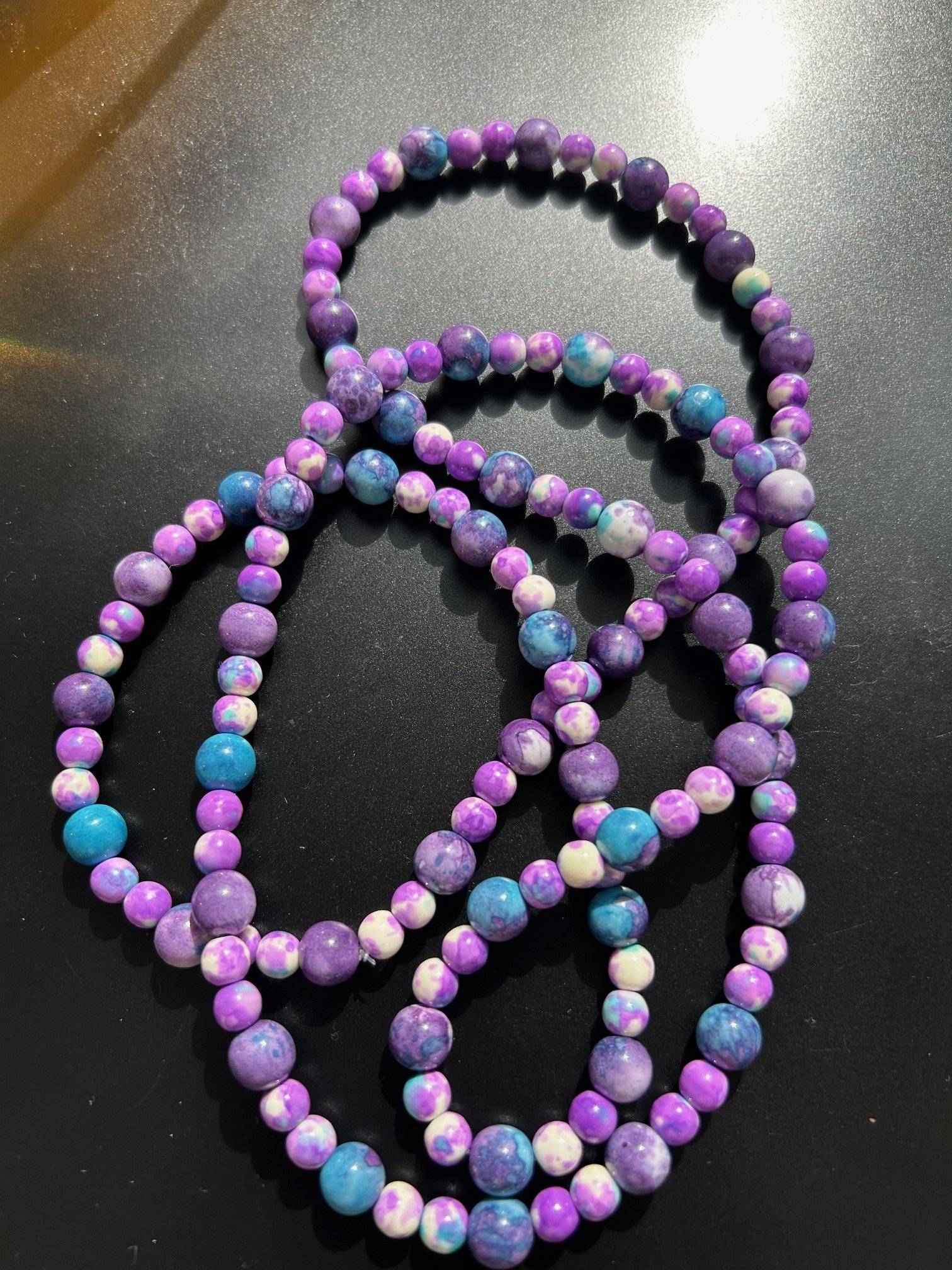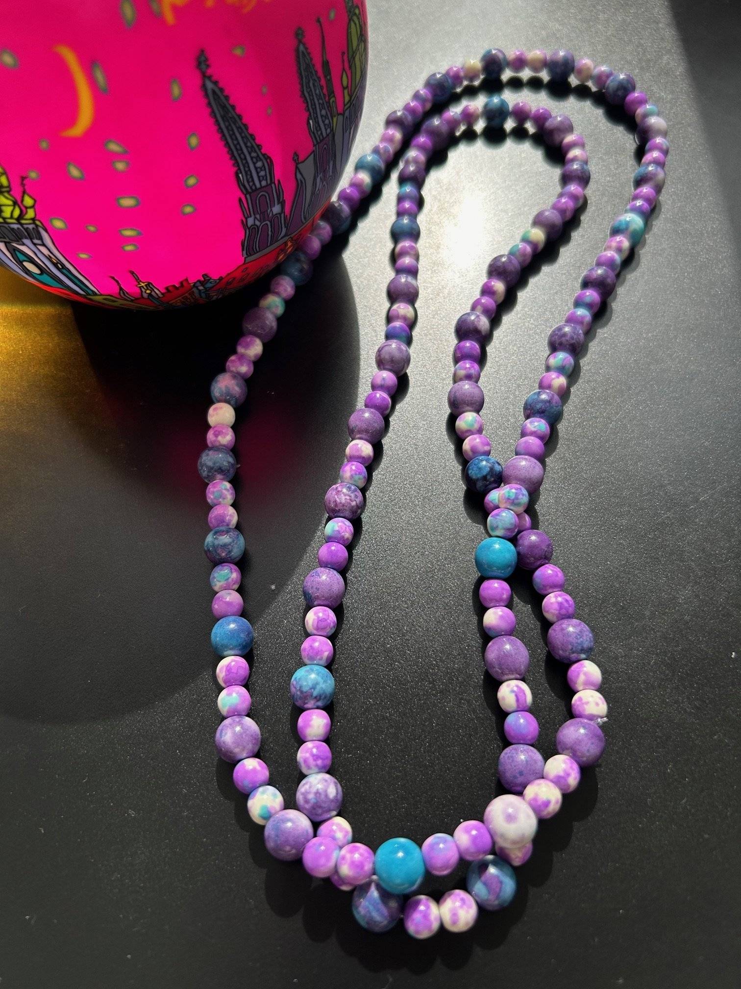 Colierul de mărgele este alcătuit din piatră sintetică sakura jade, compozit culoare mov/albastru/violet, sfere cu dimensiunea de 6 și 8 mm.