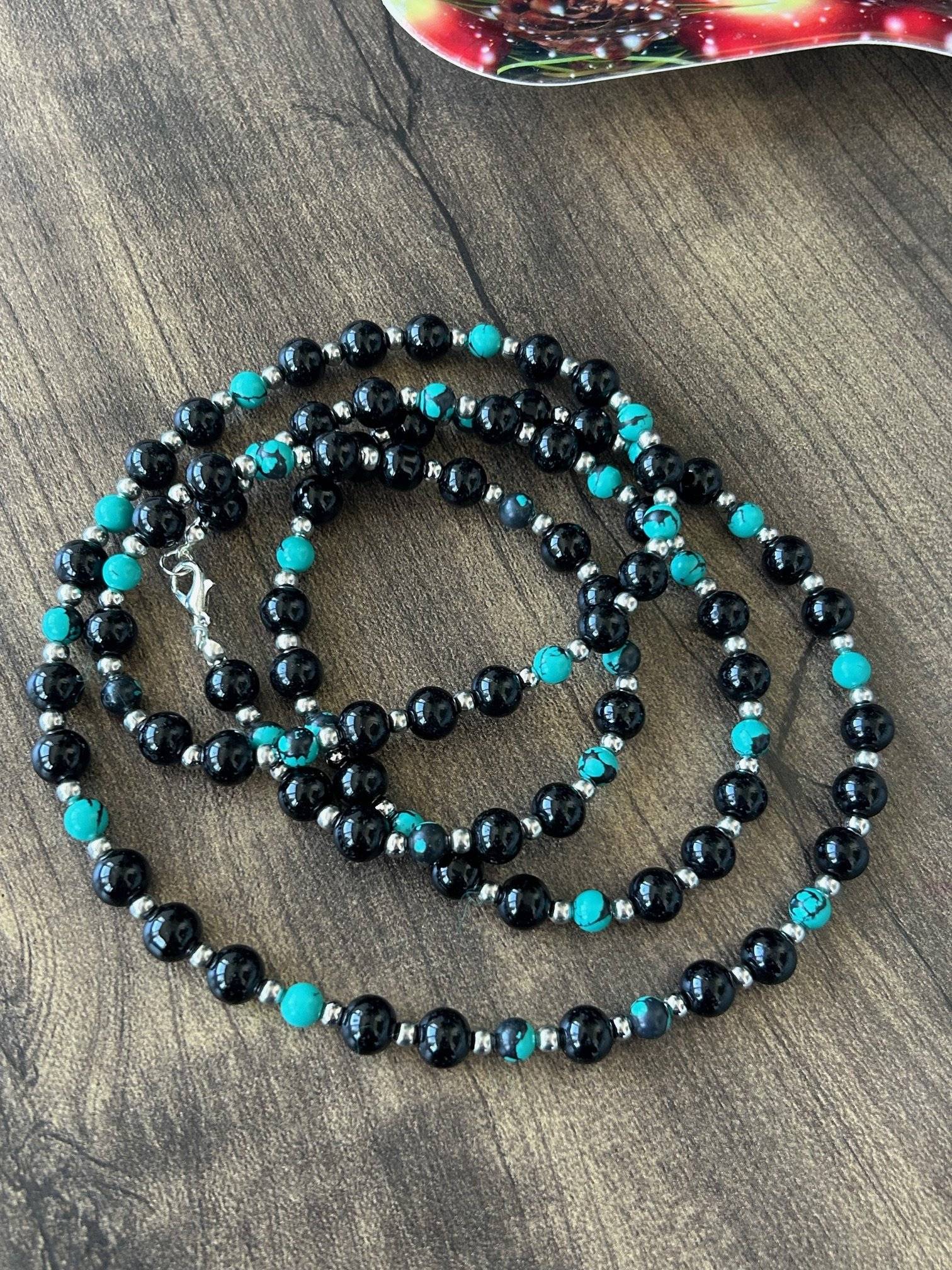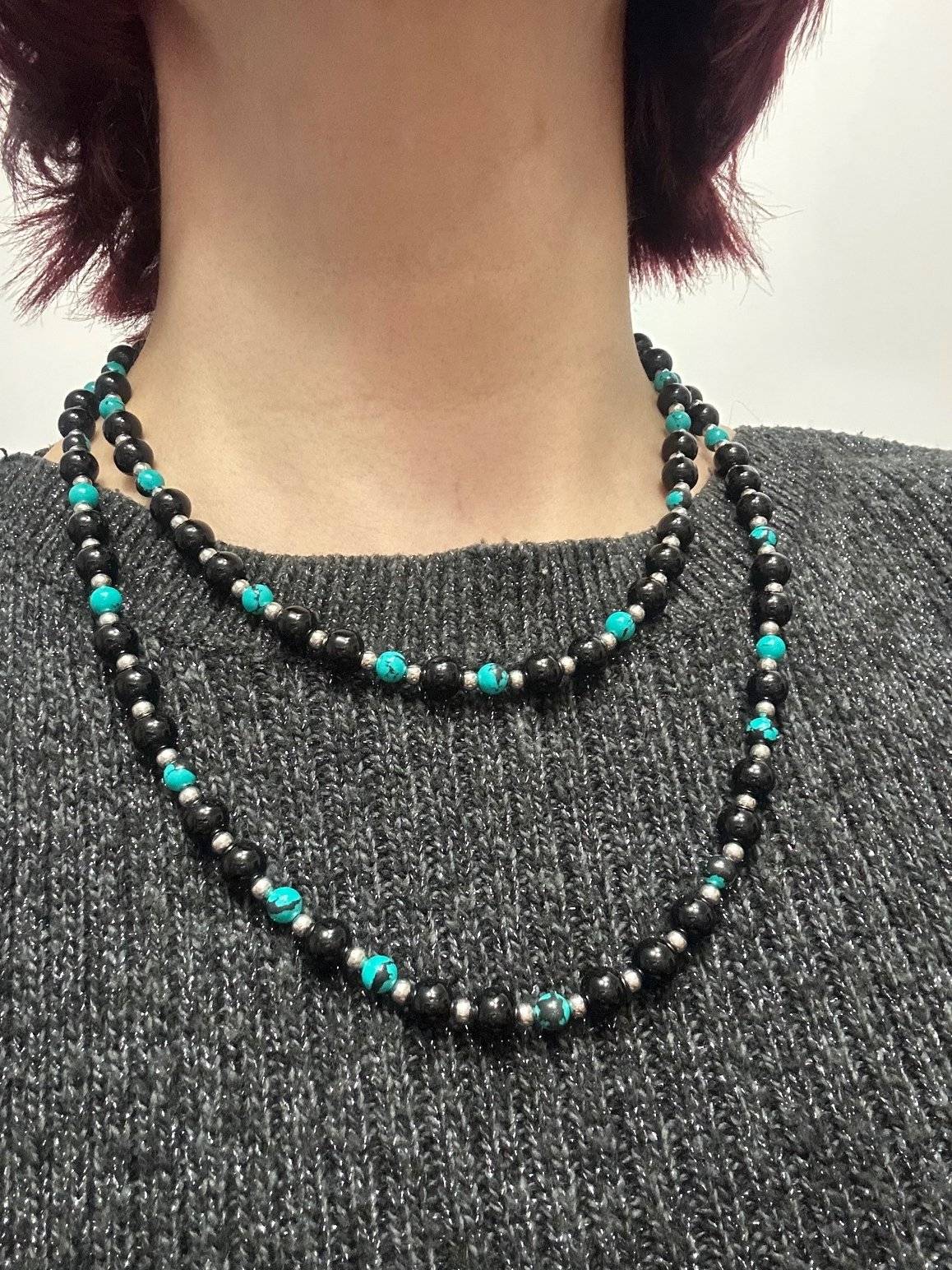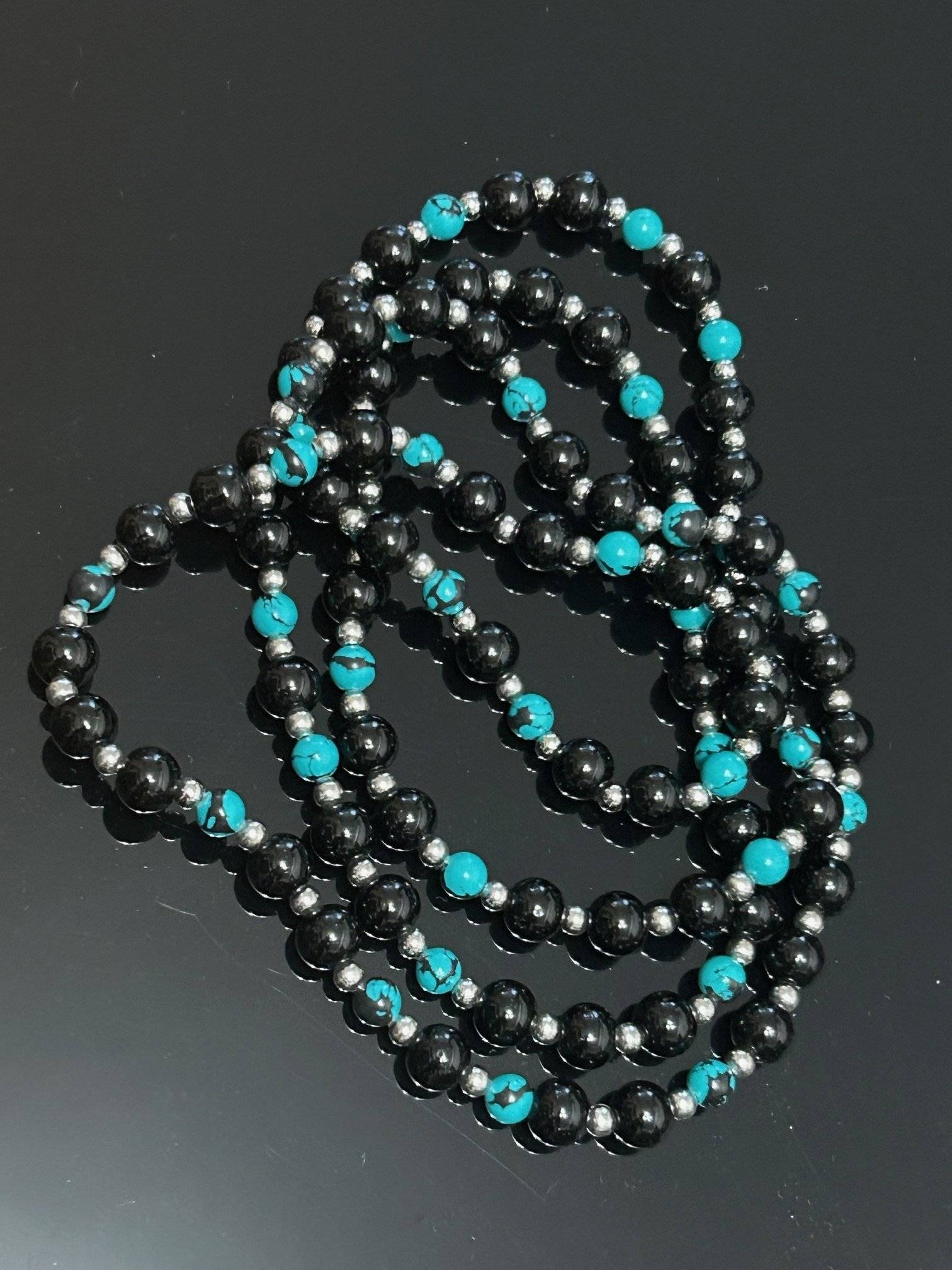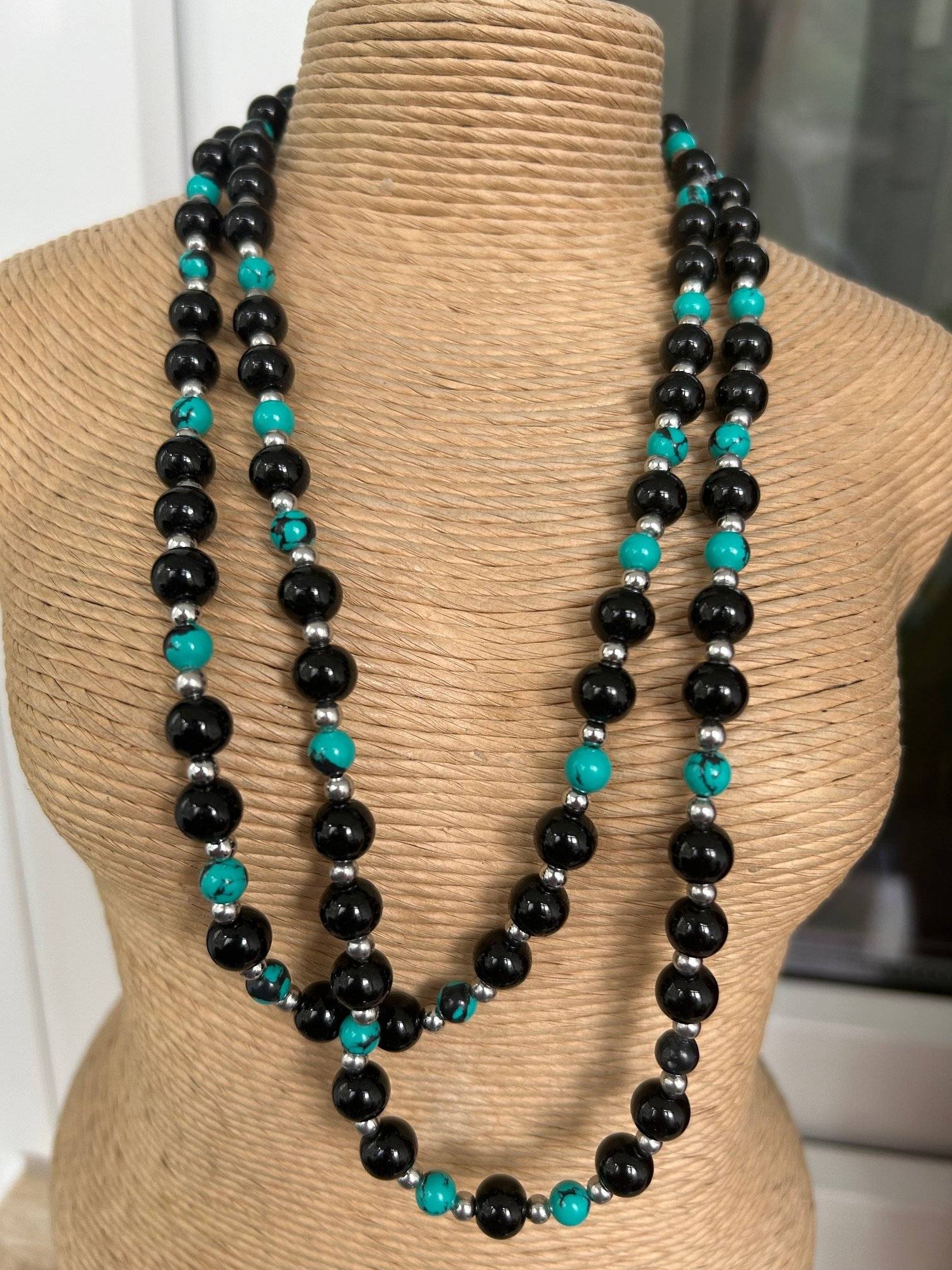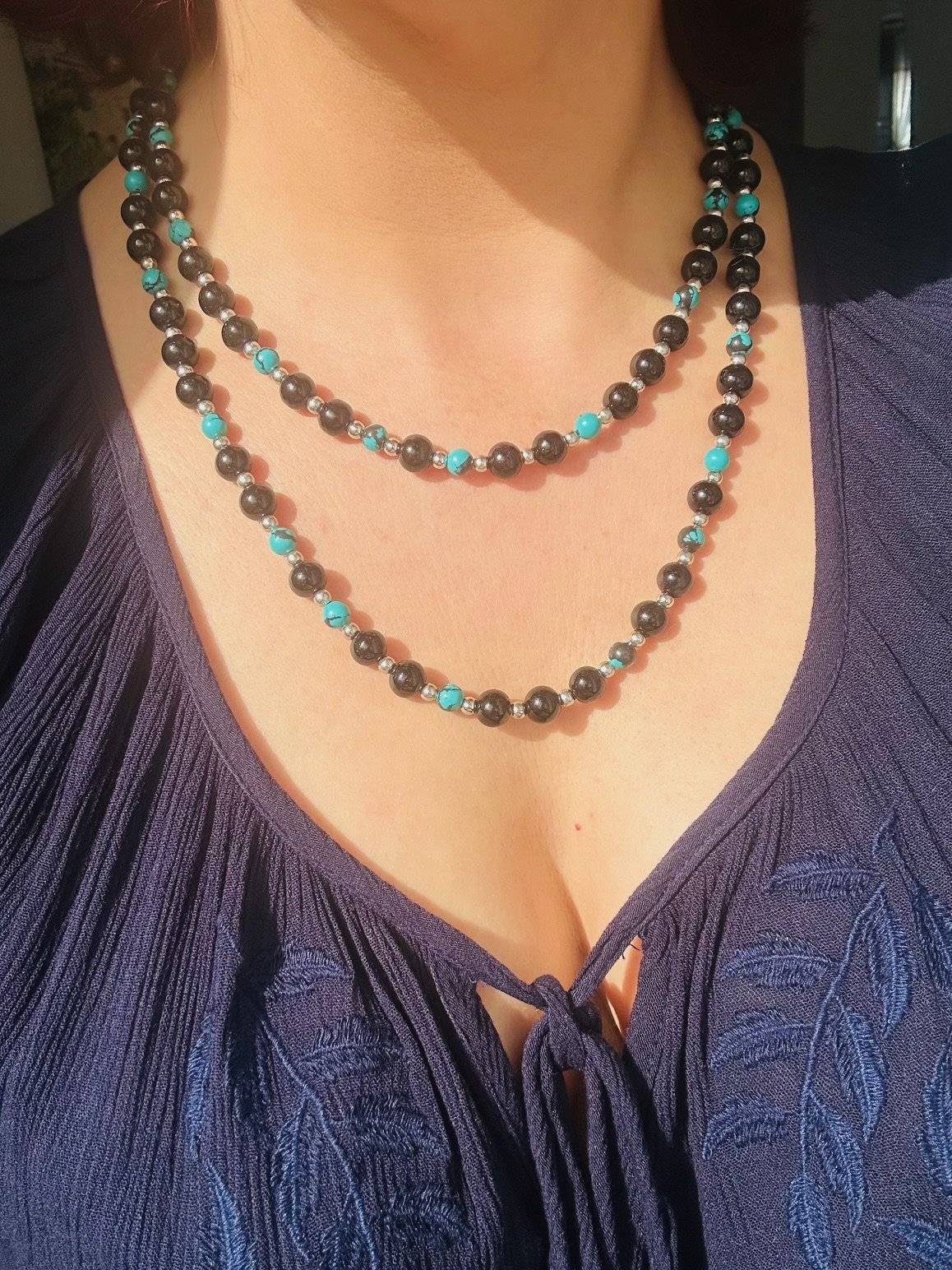 - compozit turcoaz, sfere cu dimensiunea de 6 mmLungimea colierului este de cca. 100 cm, putând fi purtat dublat la gât.