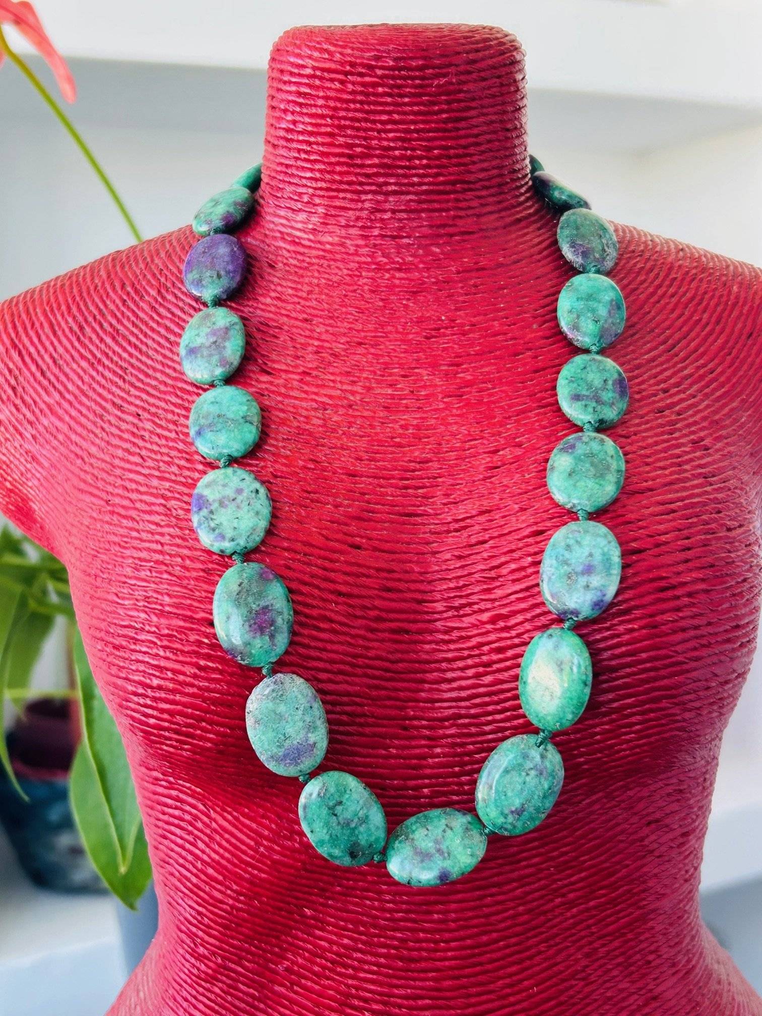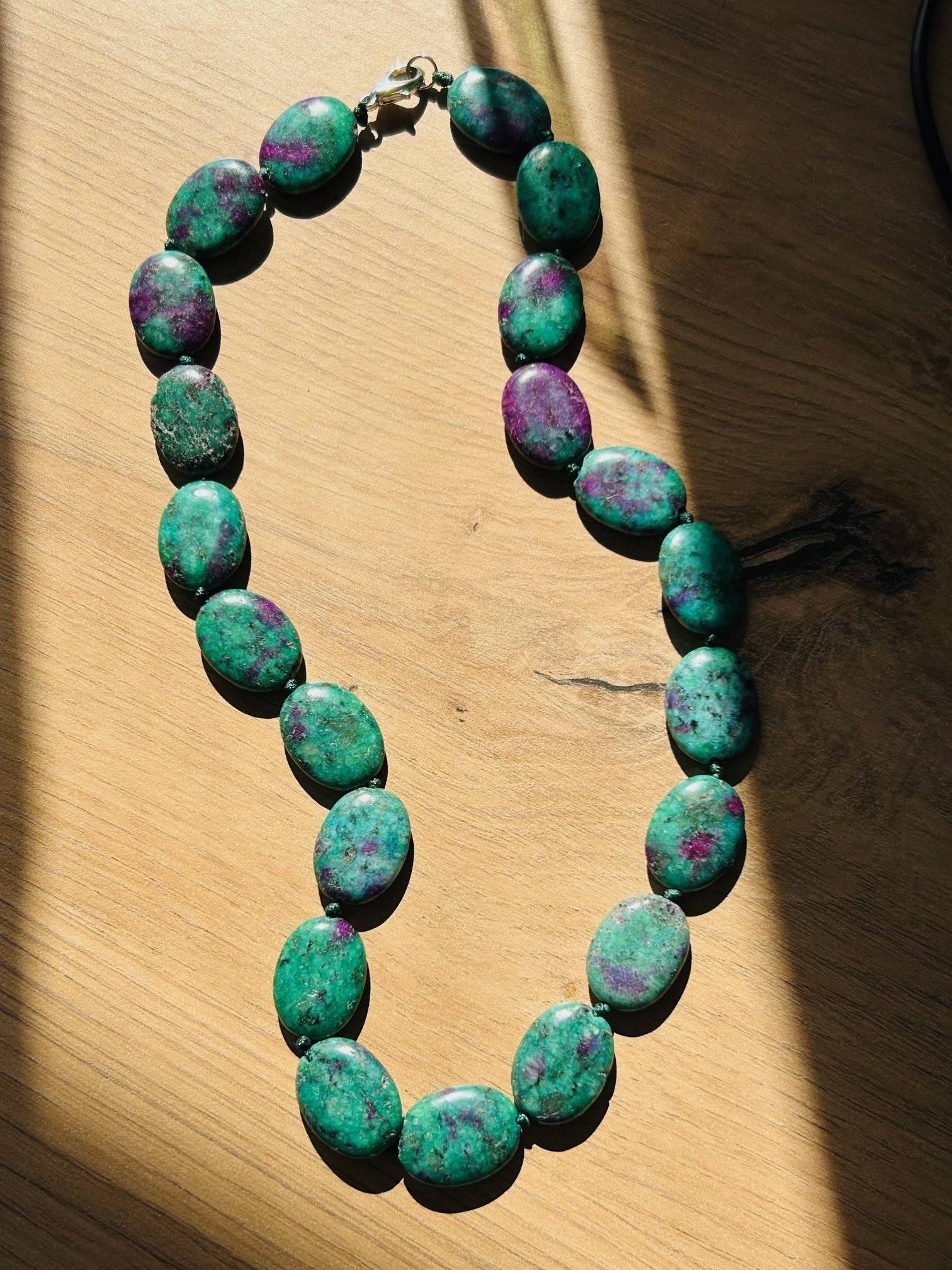 Colier din pietre ovale rulate de rubin in zoisit, înșirate pe fir textil multistrat cu noduri între pietre.