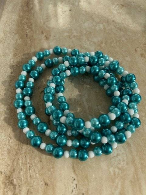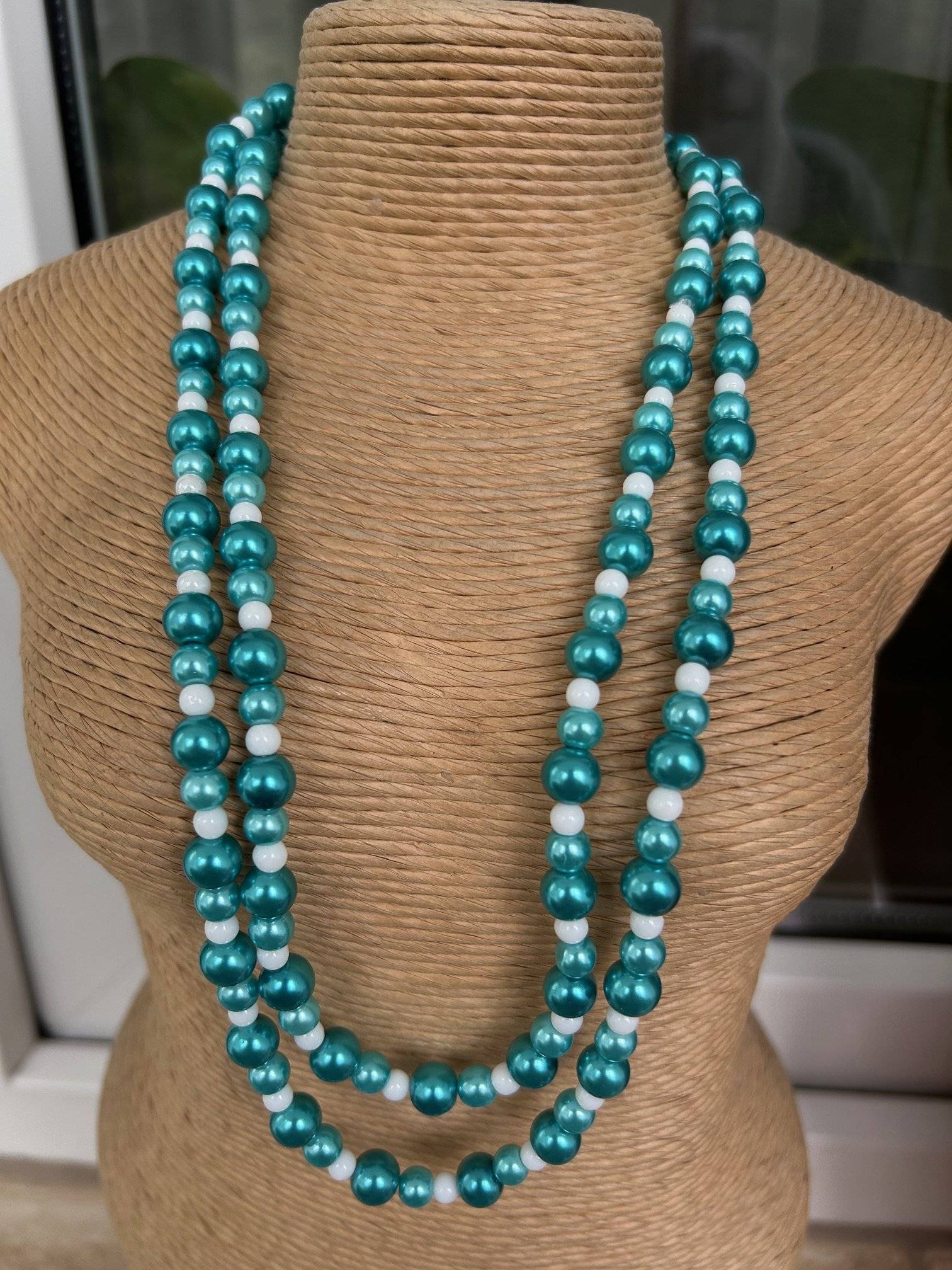 - perlă de sticlă, cal.I, culoare turcoaz, sfere cu dimensiunea de 8 mmLungimea colierului este de cca. 104 cm. Perlele de sticlă sunt înșirate pe fir oțel siliconat de 0,45 mm grosime, iar închiderea se face cu închizătoare lobster din aliaj placat cu argint.
