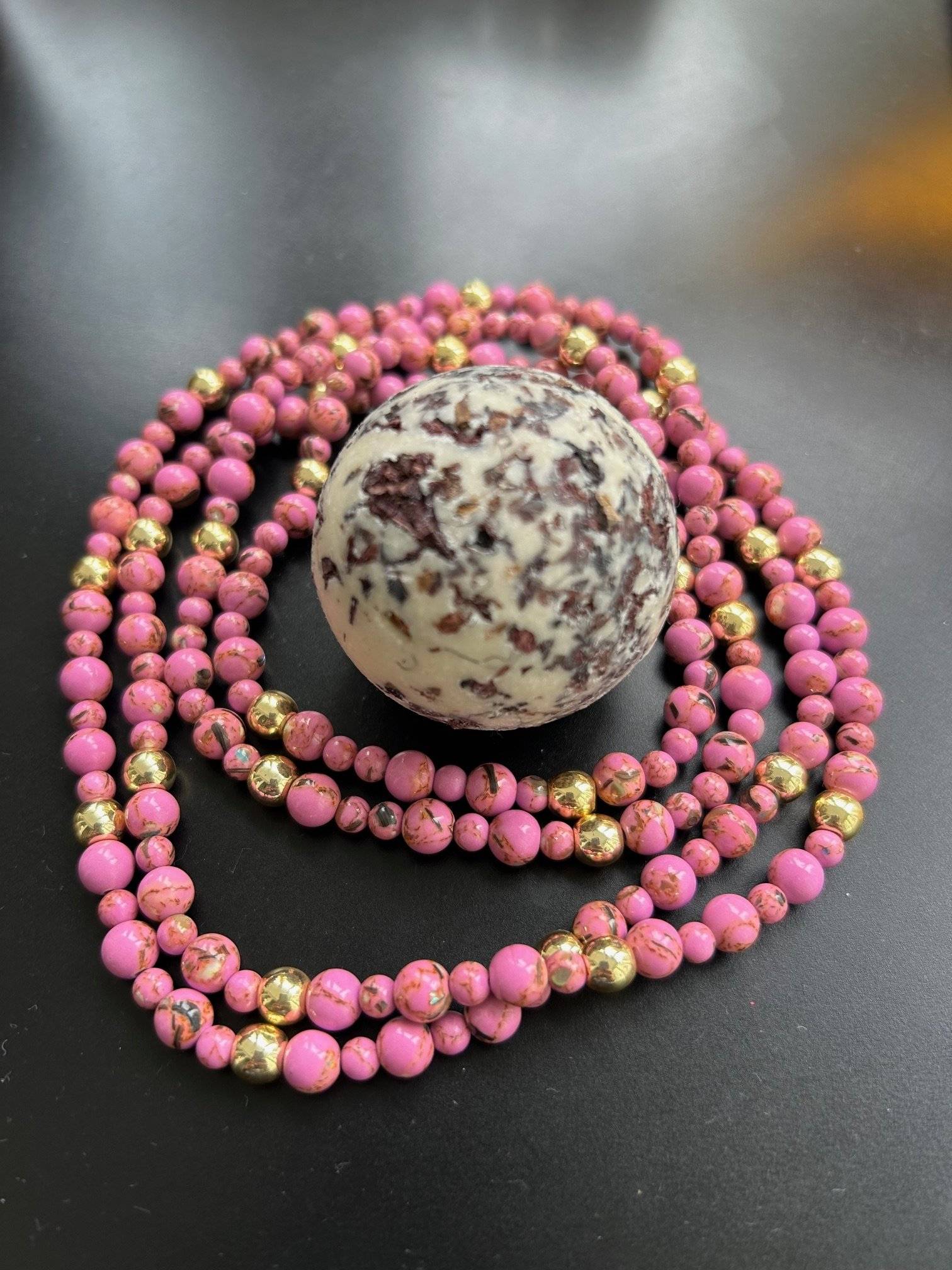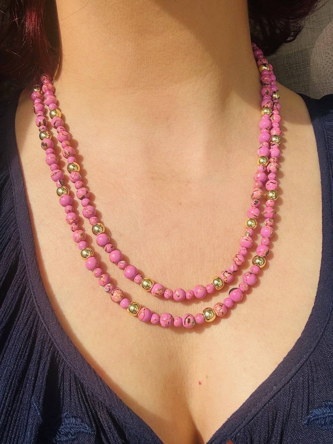 - piatră sintetică turcoaz roz potențat cu auriu, sfere cu dimensiunea de 4 și 6 mmLungimea colierului este de cca. 108 cm.