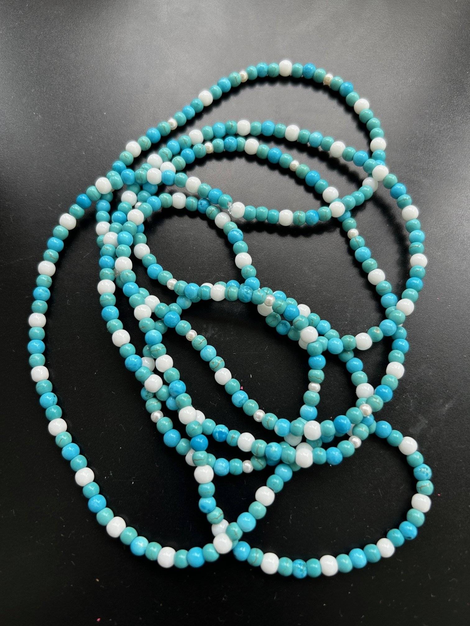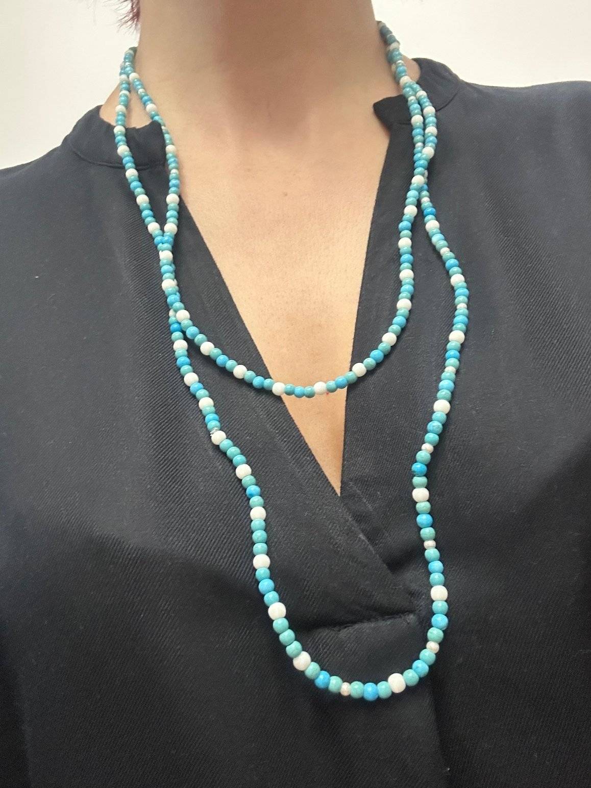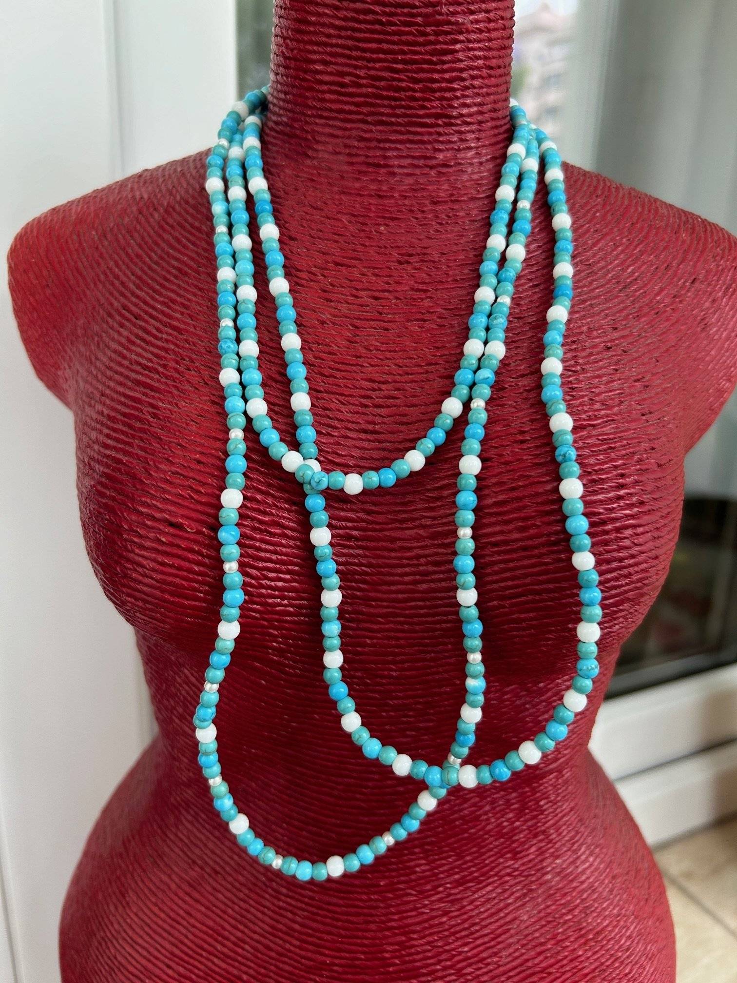 - turcoaz reconstituit, sfere cu dimensiunea de 4 mmLungimea colierului este de cca. 140 cm, ceea ce permite purtarea dublat la gât.