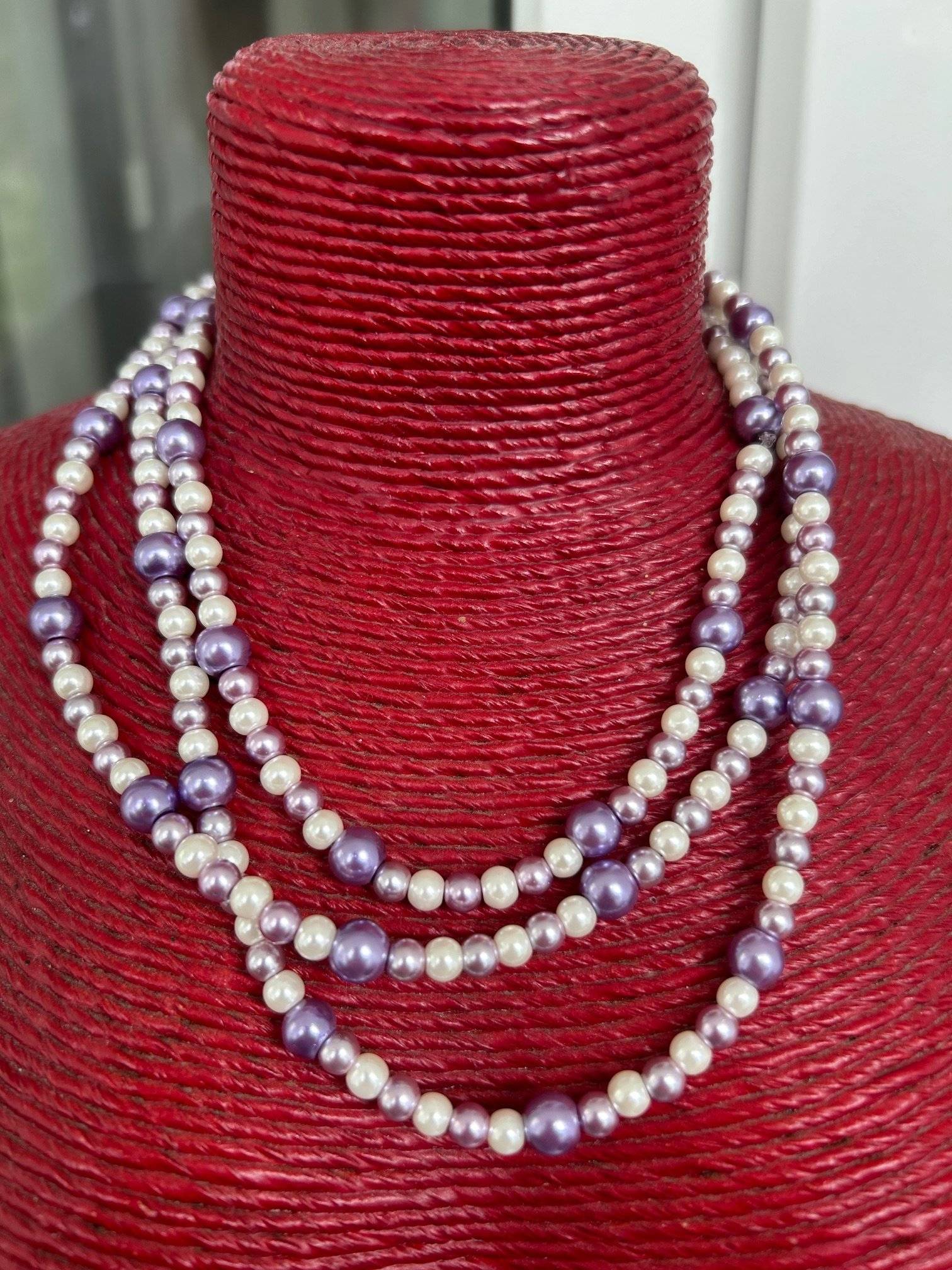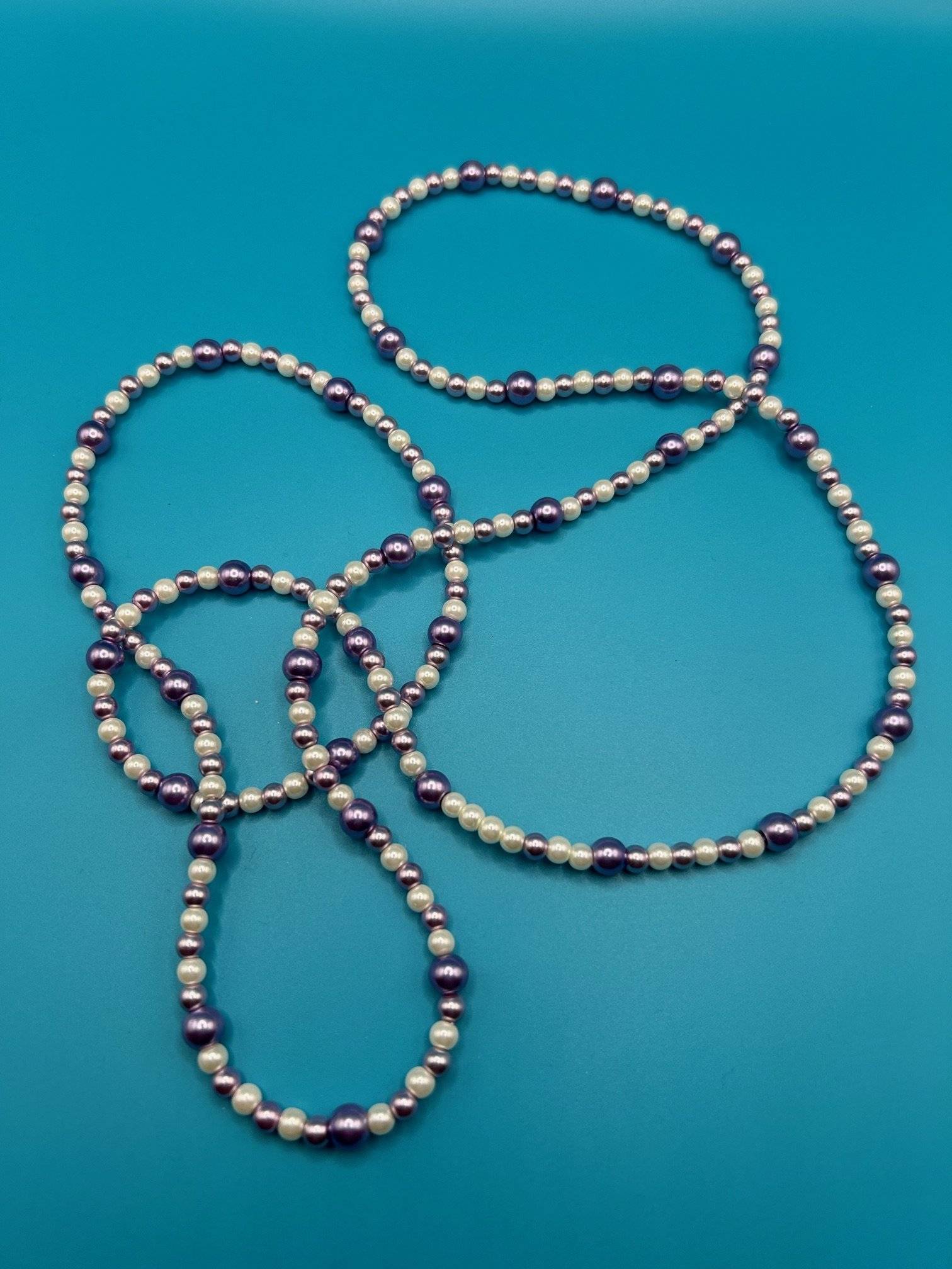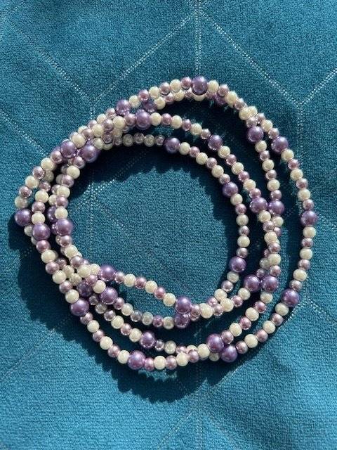 - perlă de sticlă, cal.I, culoare mov mediu, sfere cu dimensiunea de 6 mmLungimea șiragului este de cca. 96 cm. Perlele de sticlă sunt înșirate pe fir silicon de 0,40 mm grosime, iar închiderea se face prin triplu nod rezistent.