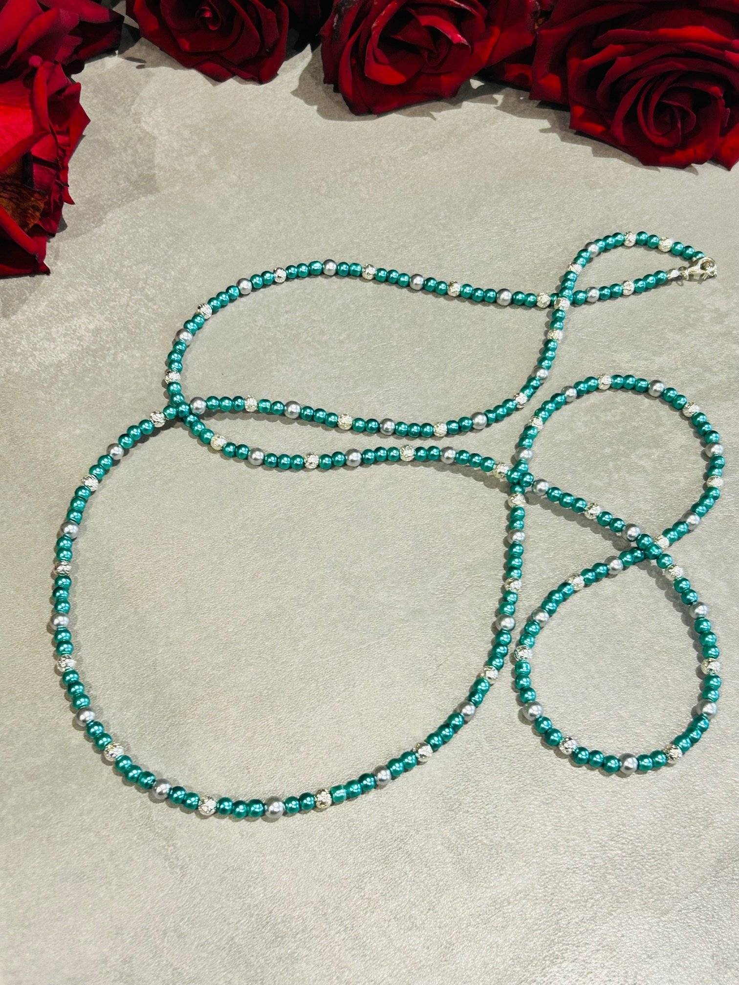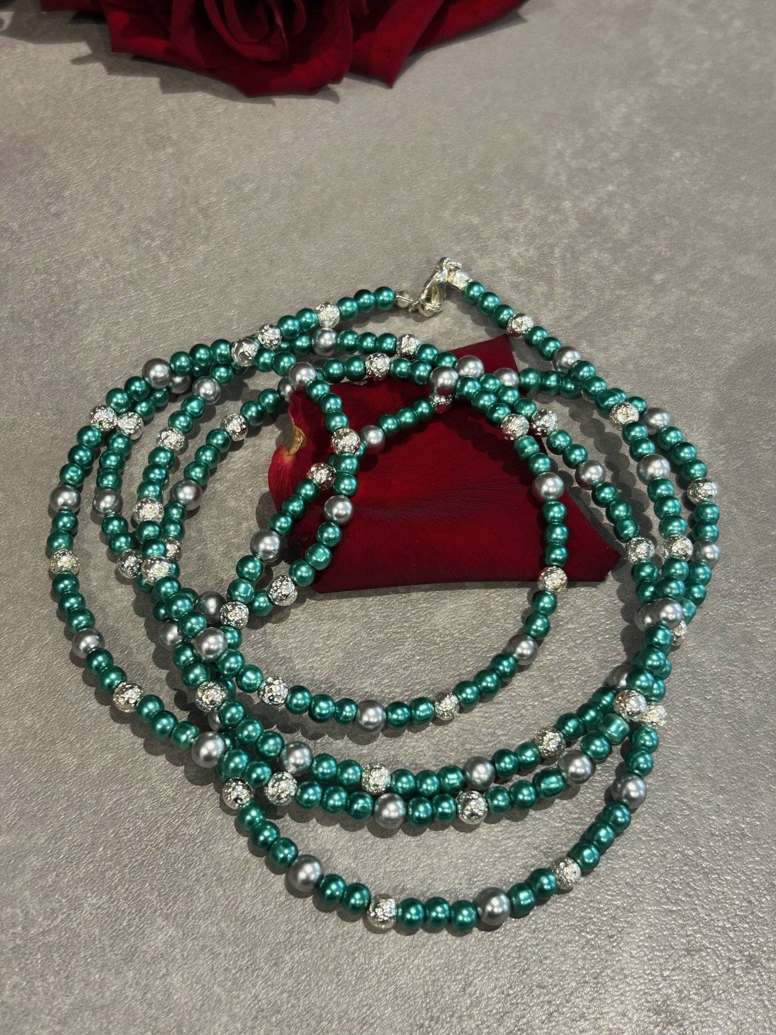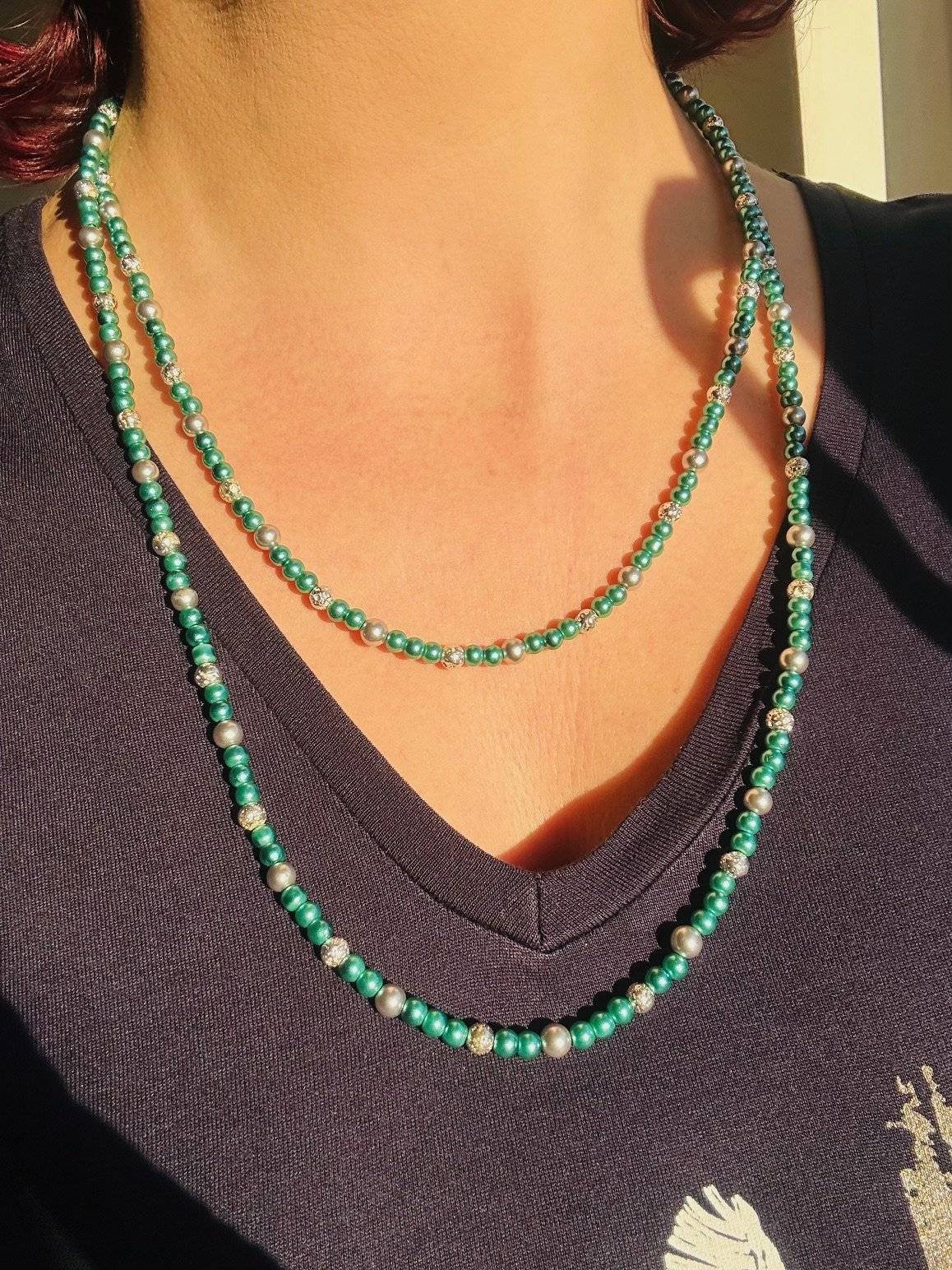 Lungimea colierului de mărgele este generoasă de cca. 116 cm, purtându-se dublat la gât.