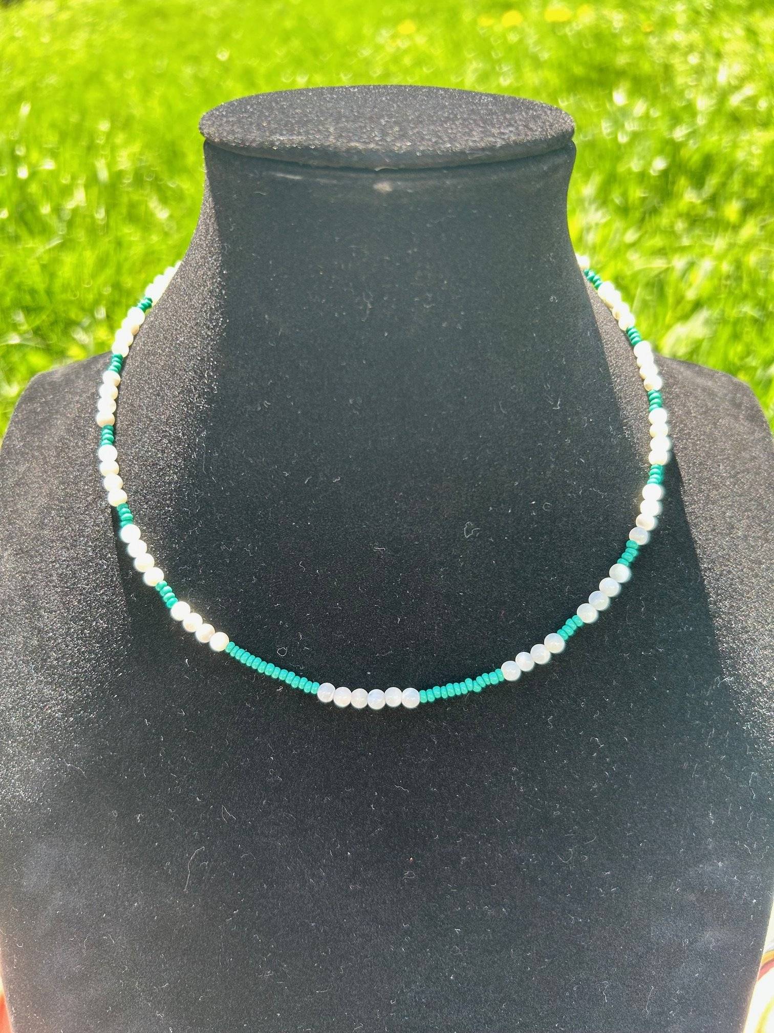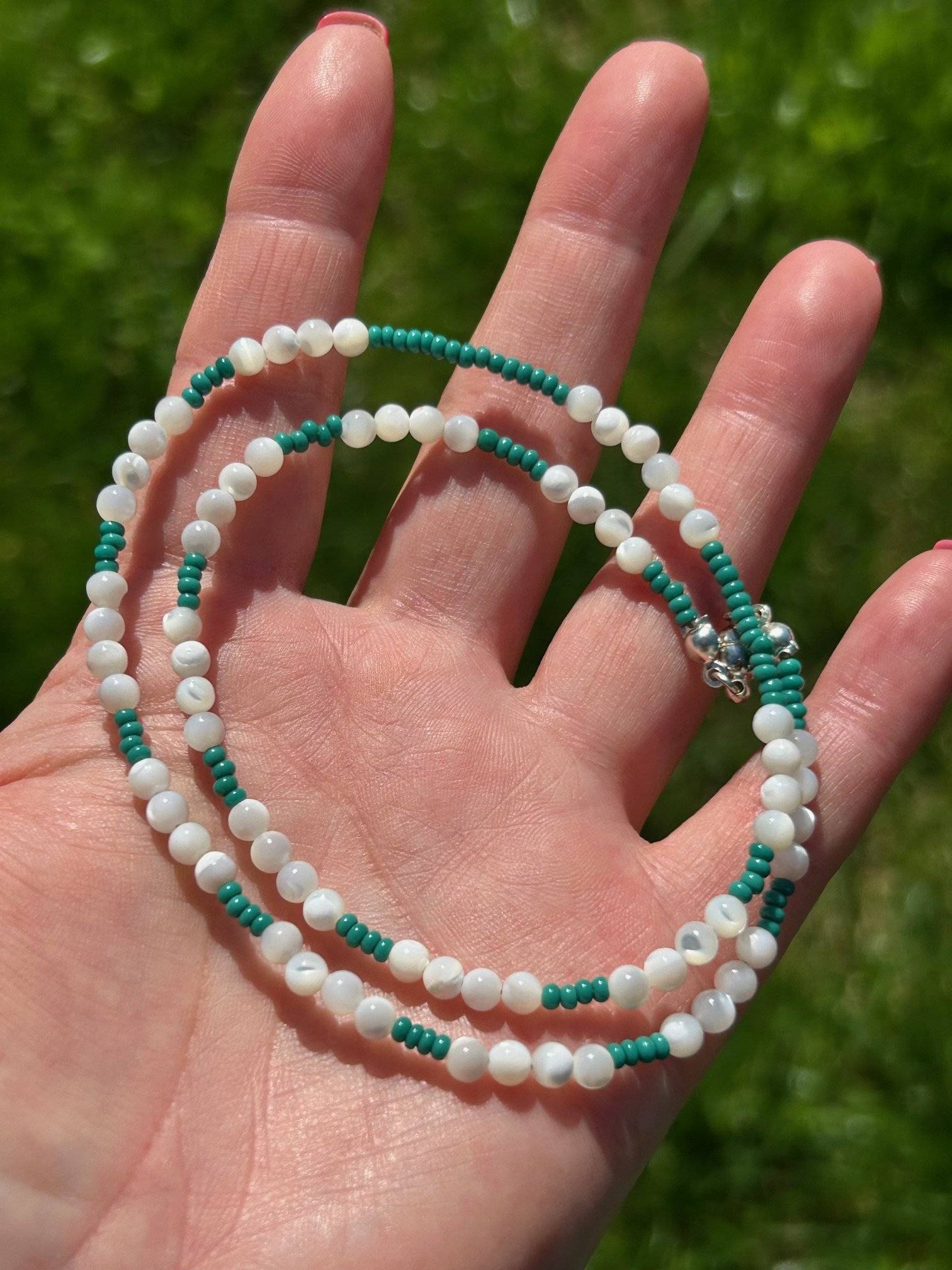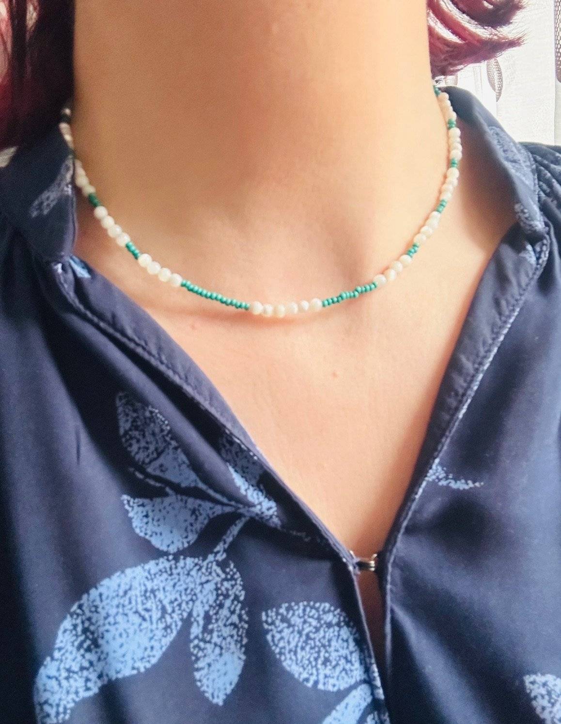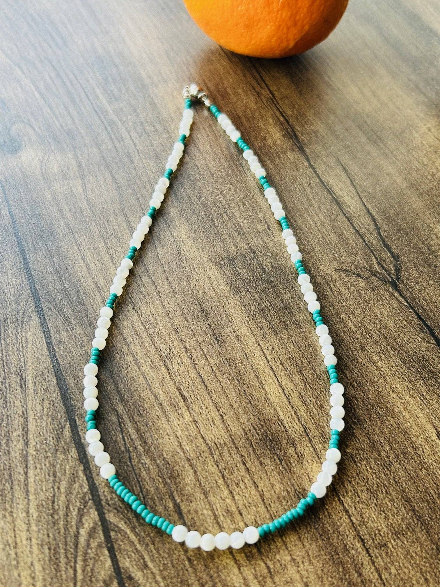 Vă prezentăm un colier simplu și elegant la baza gâtului, din turcoaz natural și sidef alb cu adevărat deosebit - de purtat împreună cu alte coliere finuțe sau lănțișor de argint cu diverse pandantive ! Ideal de purtat în vara aceasta la mare, cu o rochie vaporoasă din pânză topită în culori vibrante.