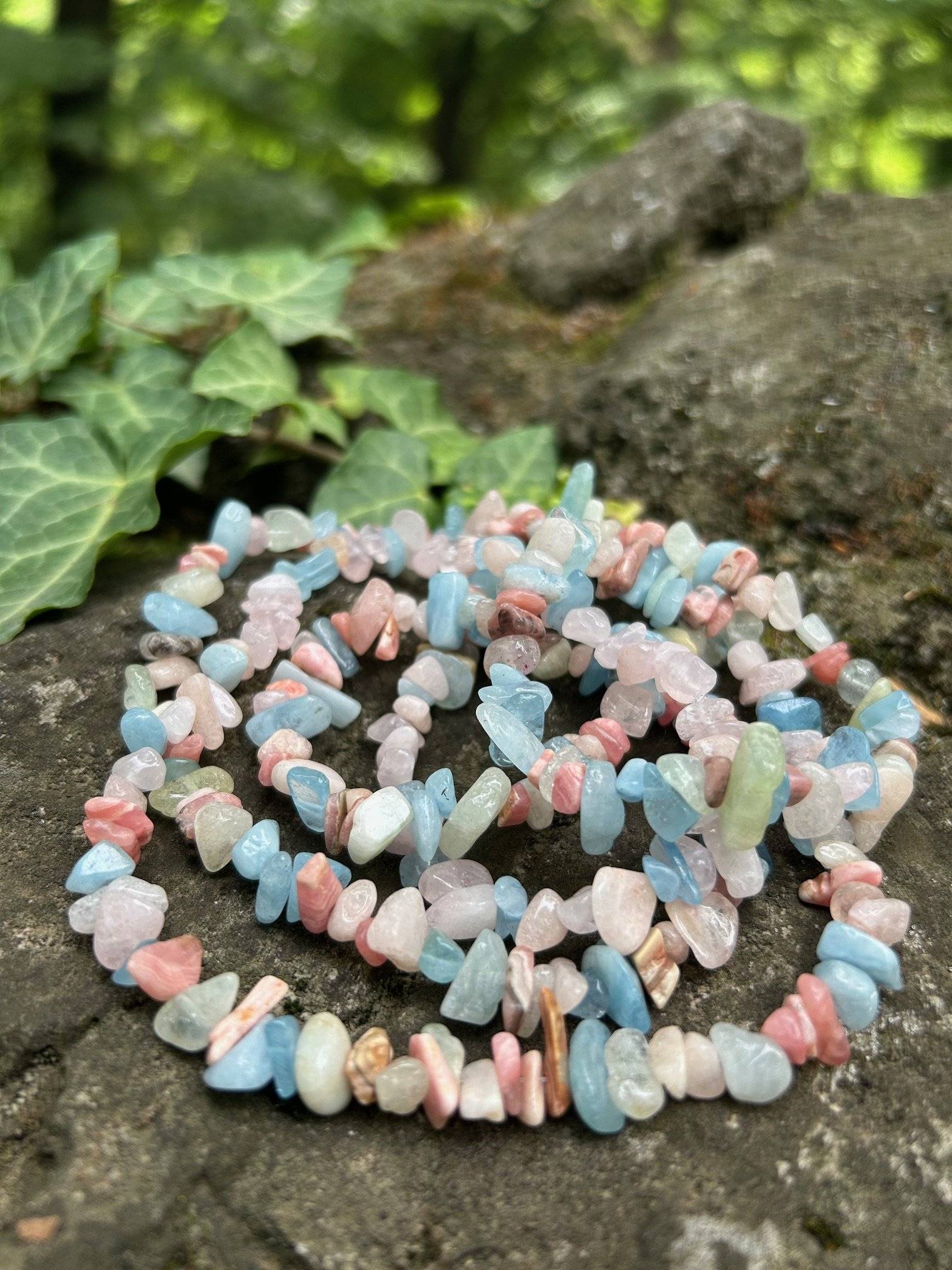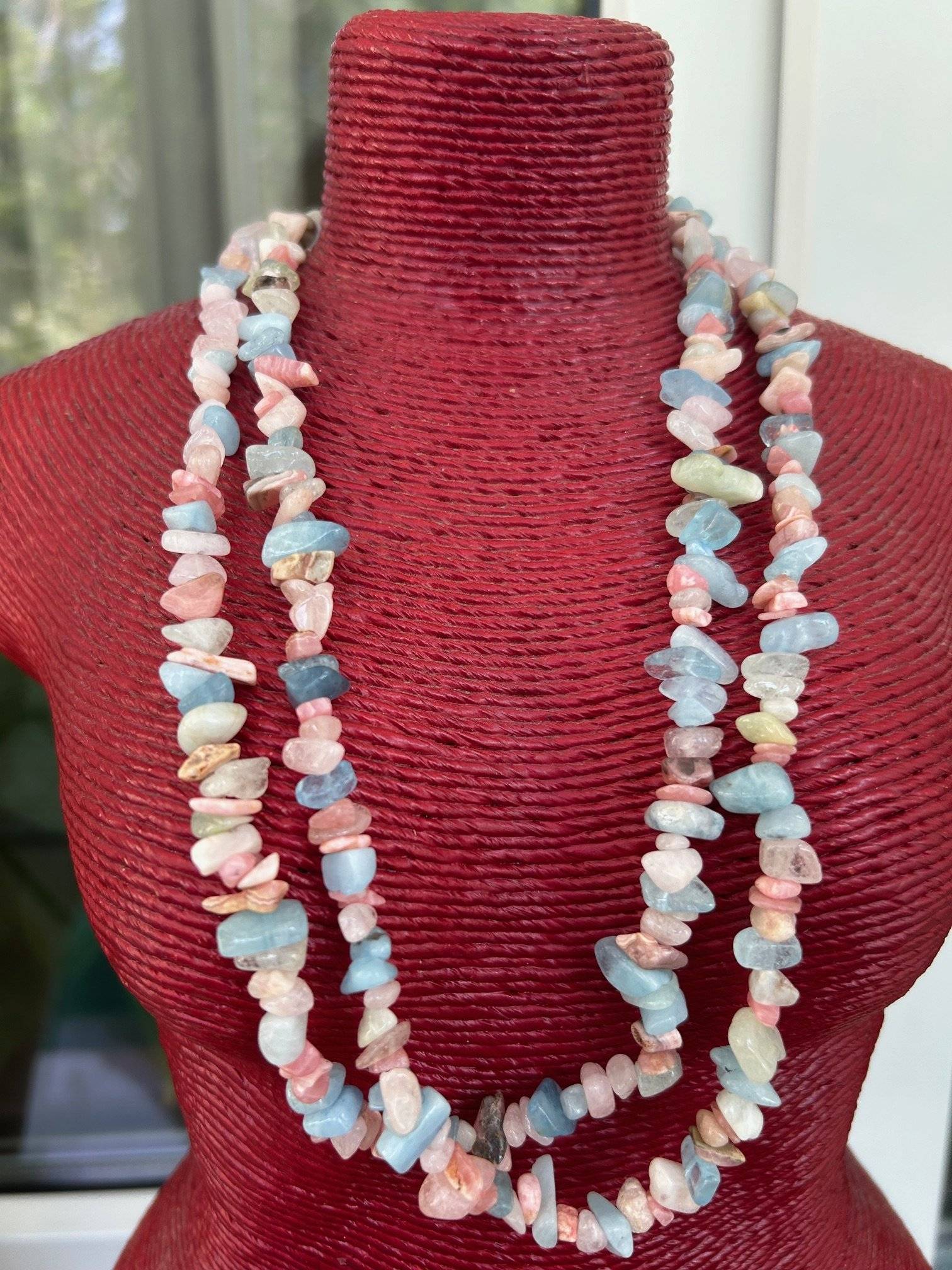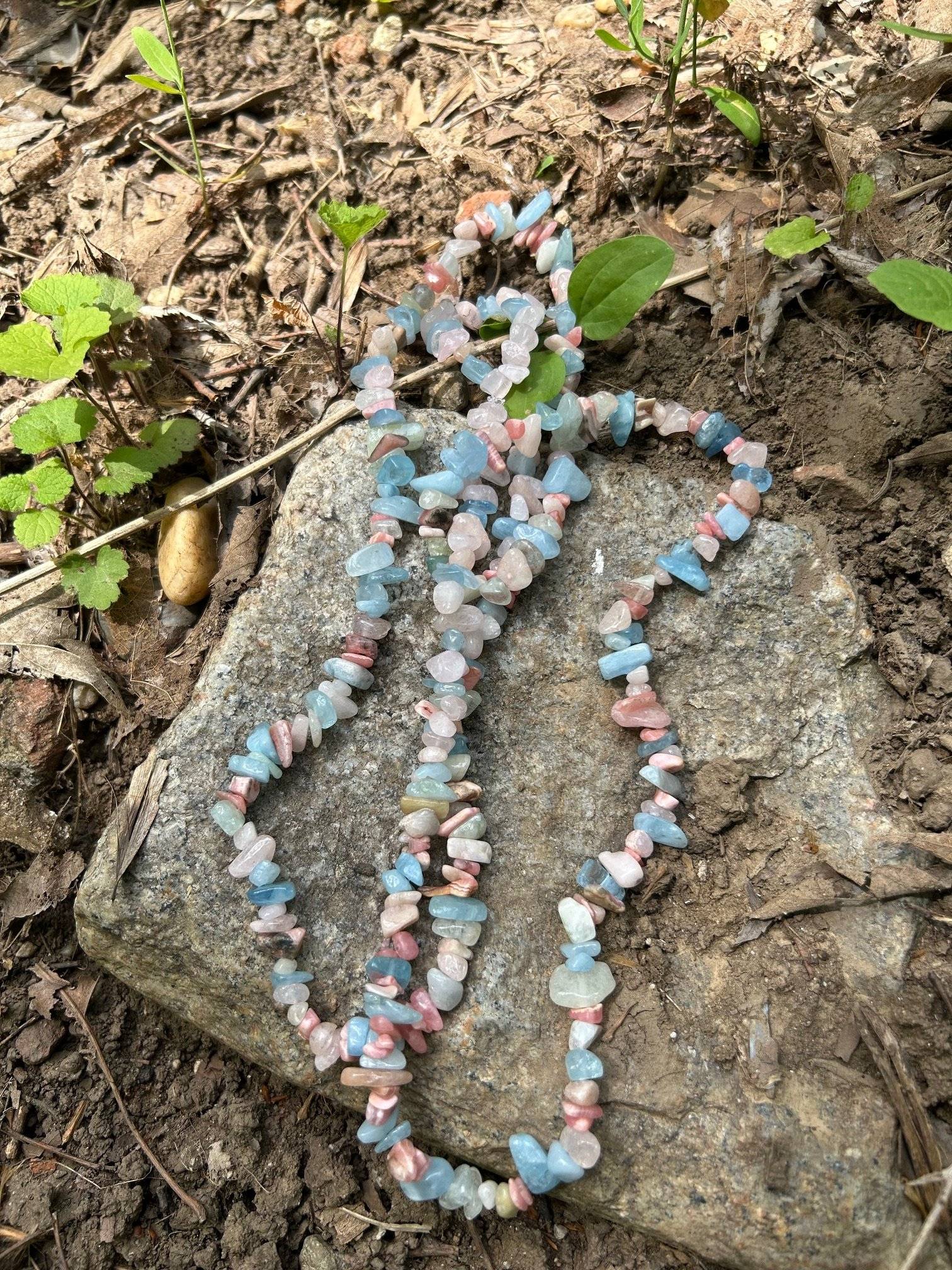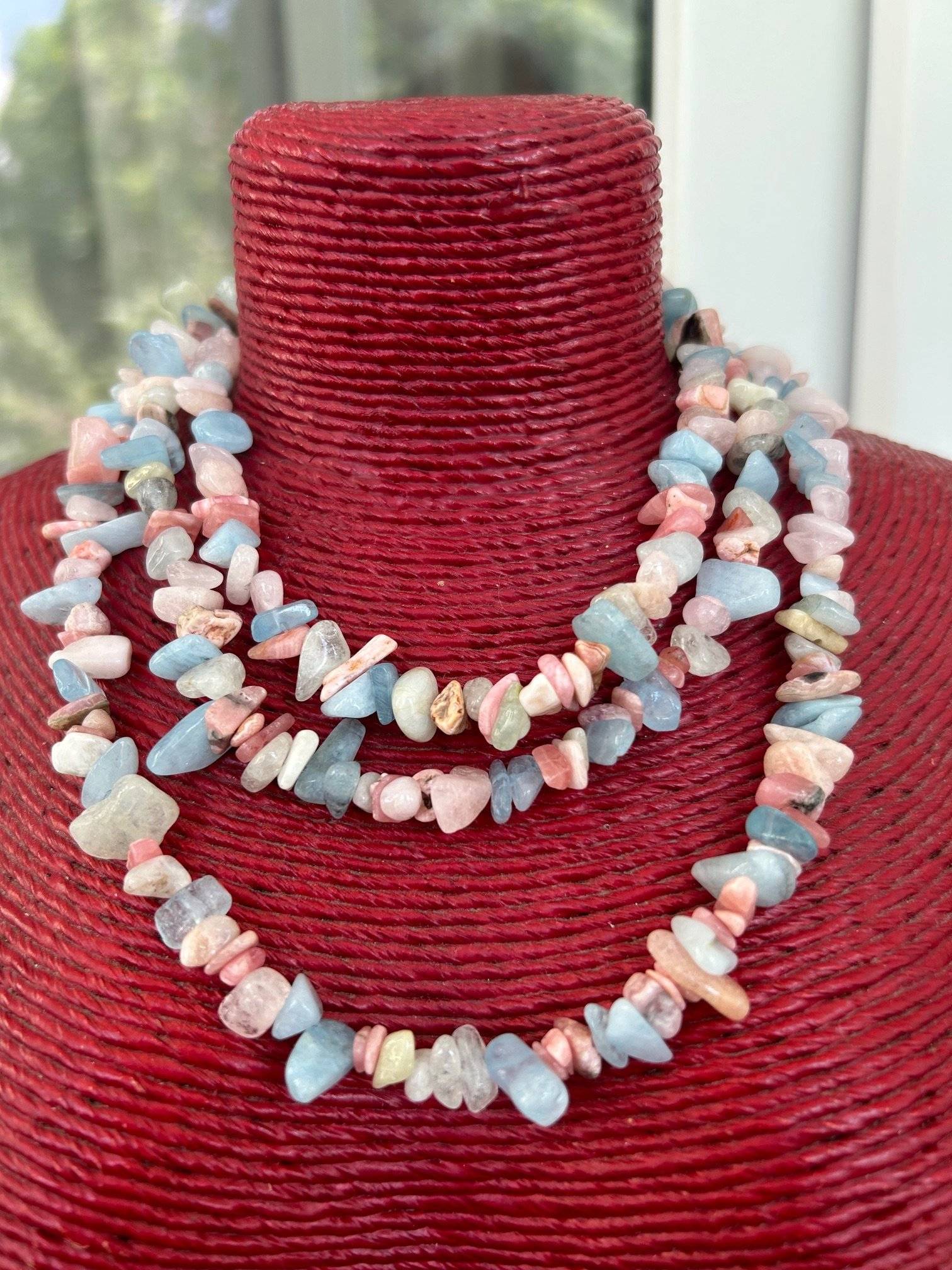 Un șirag de pietre semiprețioase cu adevărat aducător de claritate și dragoste ! Este confecționat dintr-un mix de cristale - ACVAMARIN, MORGANIT și RODONIT - cu energie miraculoasă îndeosebi pentru zodiile Taur, Fecioară și Săgetător. Ideal de purtat în vara aceasta la mare, cu o rochie vaporoasă din pânză topită albastră sau vernil.
