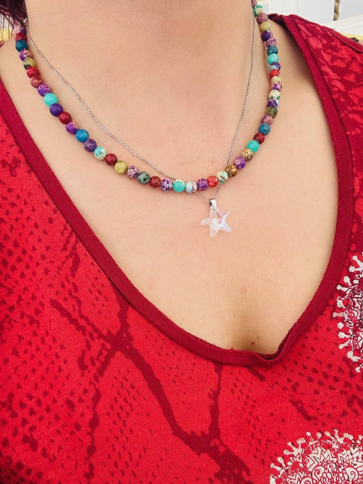 Colier cu jasp imperial în diferite nuanțe - jasp roșu, jasp albastru, jasp impression turcoaz, jasp violet, jasp verde, jasp picture - , creat inițial la sugestia unei cliente, dar fiindcă ne-a plăcut atât de tare, l-am reprodus de nenumărate ori.