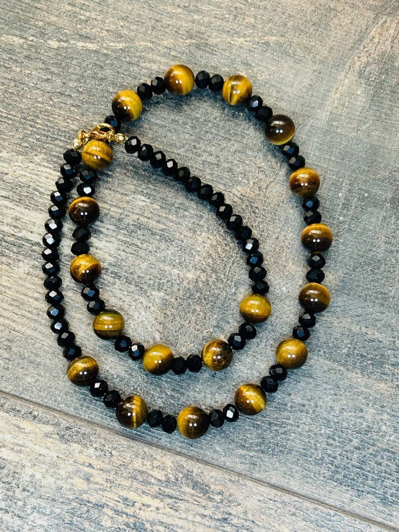Colierul este realizat cu îndemânare și bogăție creativă, în România din ochi de tigru maro cu dimensiunea de 10 mm și turmalină neagră fatețată de 6 mm.