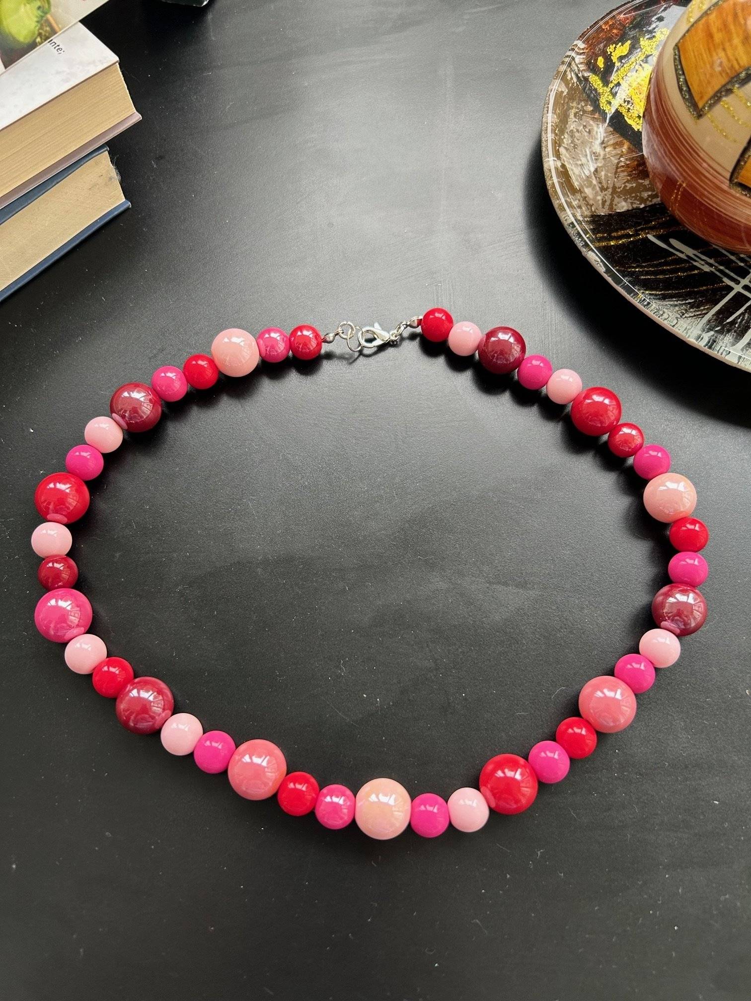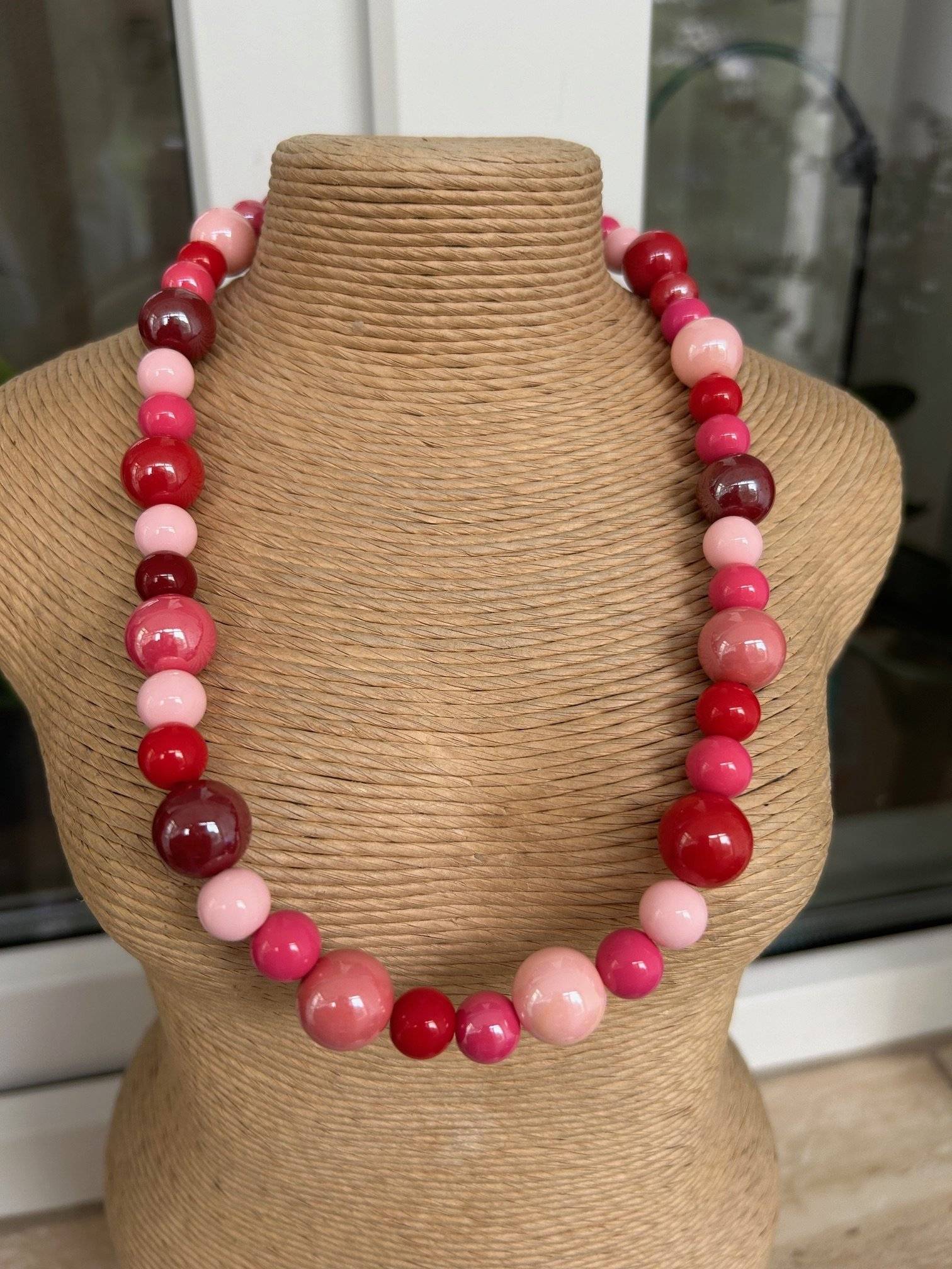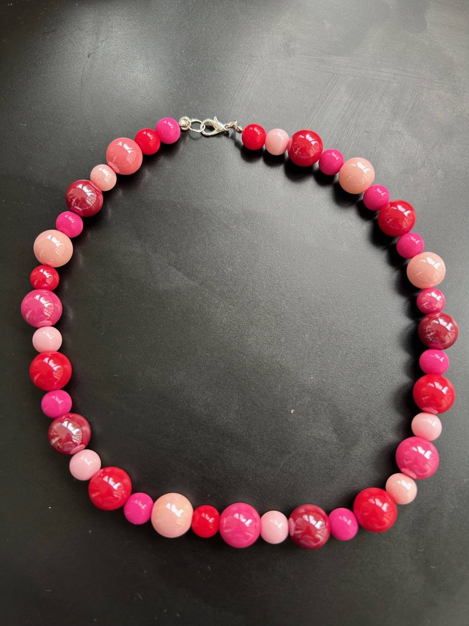 Colierul este alcătuit din mărgele acrilice ultra-perlate, în nuanțe aprinse. Mărgelele sunt rotunde, au dimensiunea de 10 și 14 mm și sunt înșirate pe sârmă siliconată de 0.45 mm grosime, iar închiderea se face cu închizătoare lobster din aliaj placată cu argint.