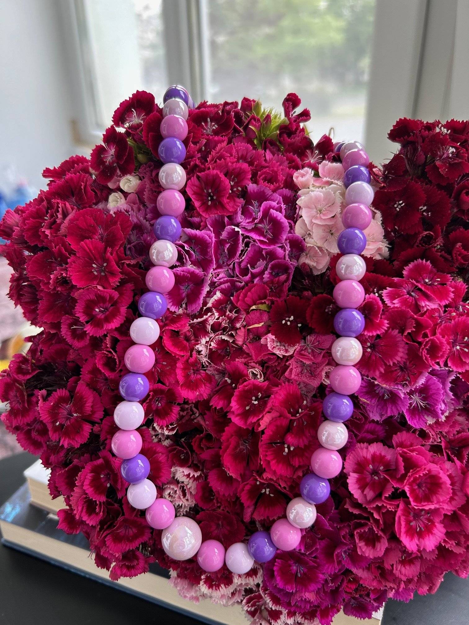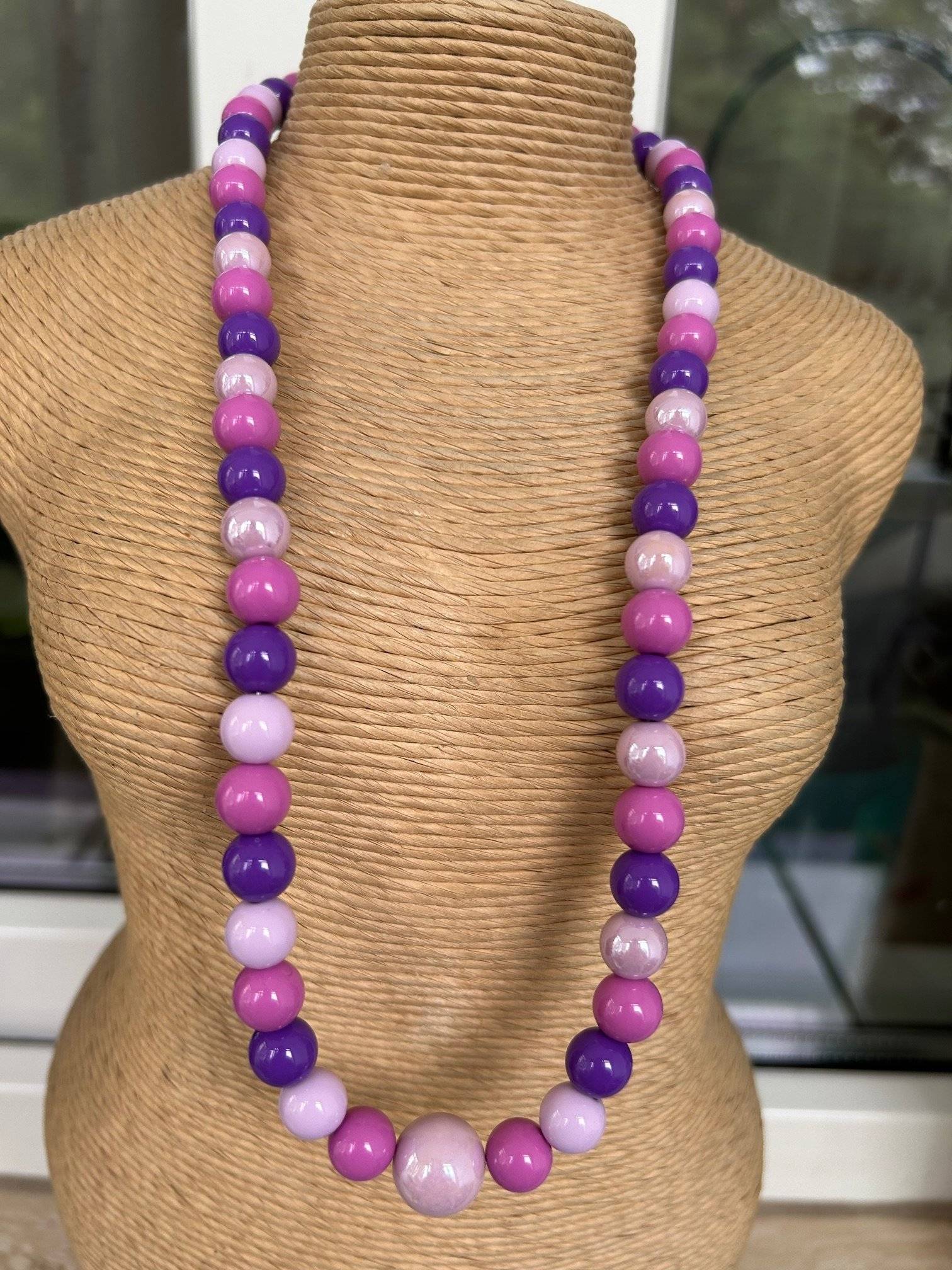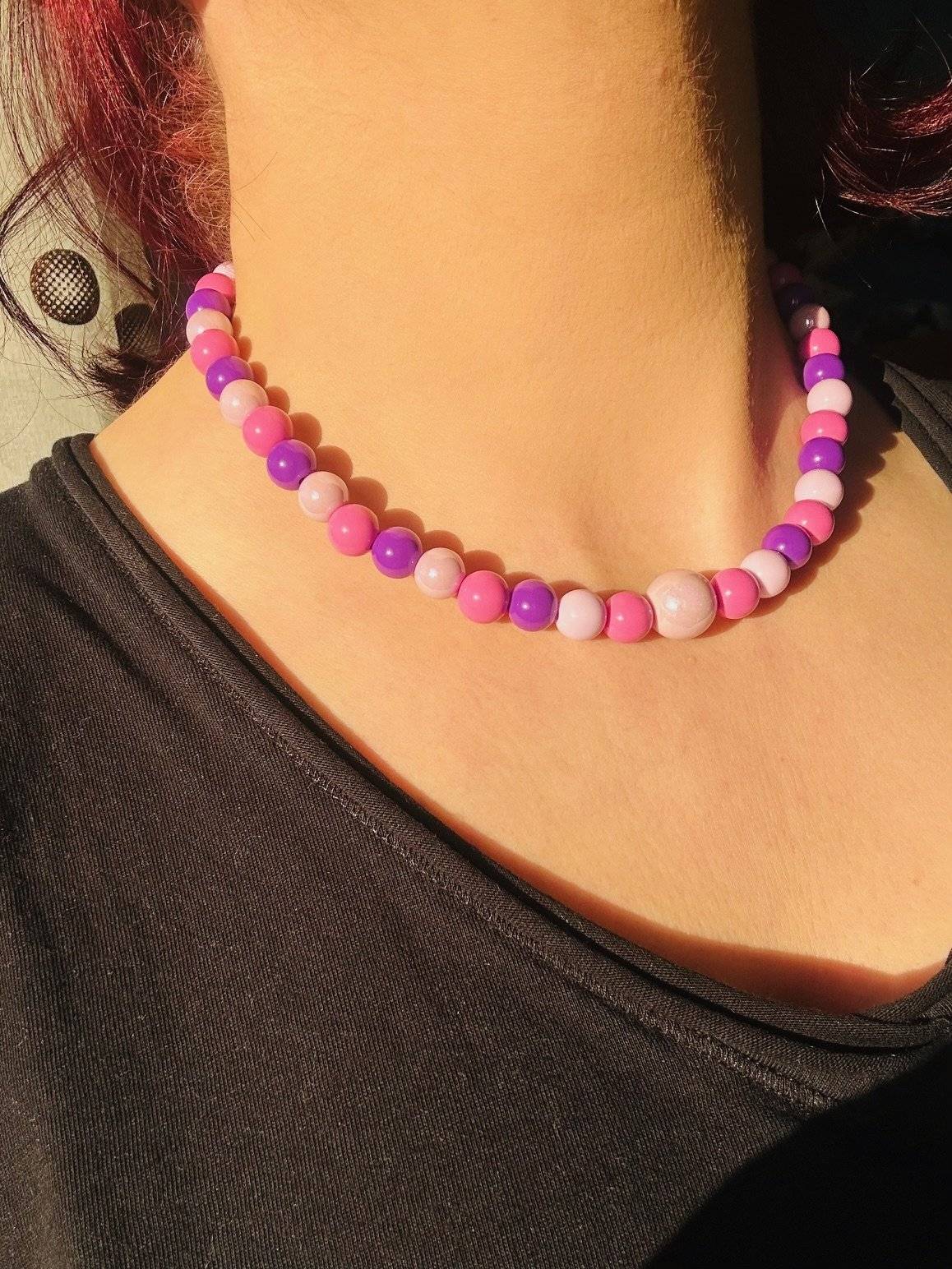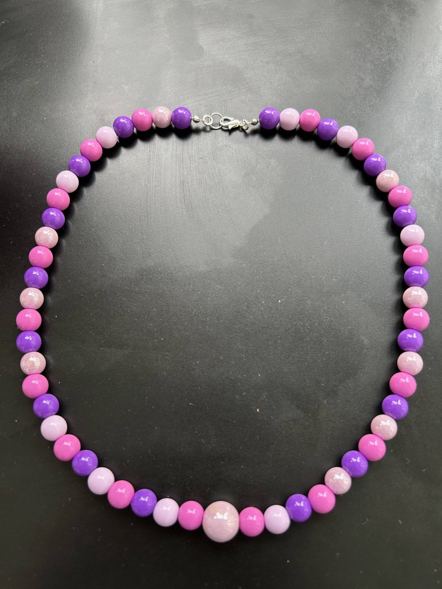 Colierul este alcătuit din mărgele acrilice ultra-perlate, în nuanțe mov, roz, indigo. Mărgelele sunt rotunde, au dimensiunea de 10 mm și sunt înșirate pe sârmă siliconată de 0.45 mm grosime, iar închiderea se face cu închizătoare lobster din aliaj placată cu argint.