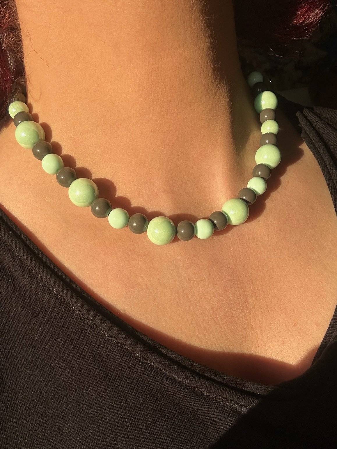 Colierul este alcătuit din mărgele acrilice ultra-perlate, în nuanțe de gri și vernil mentă. Mărgelele sunt rotunde, au dimensiunea de 10 și 14 mm și sunt înșirate pe sârmă siliconată de 0.45 mm grosime, iar închiderea se face cu închizătoare lobster din aliaj placată cu argint.