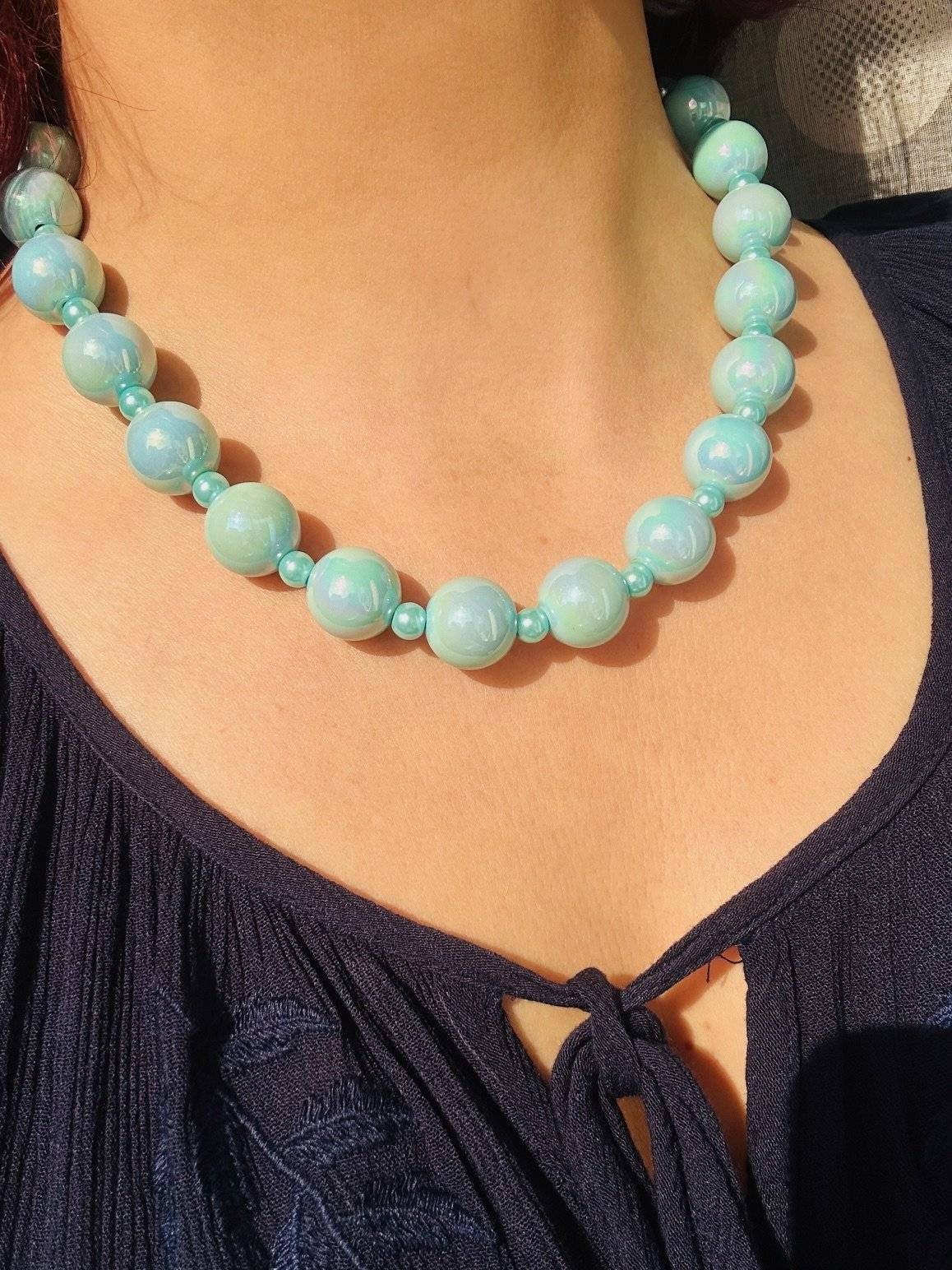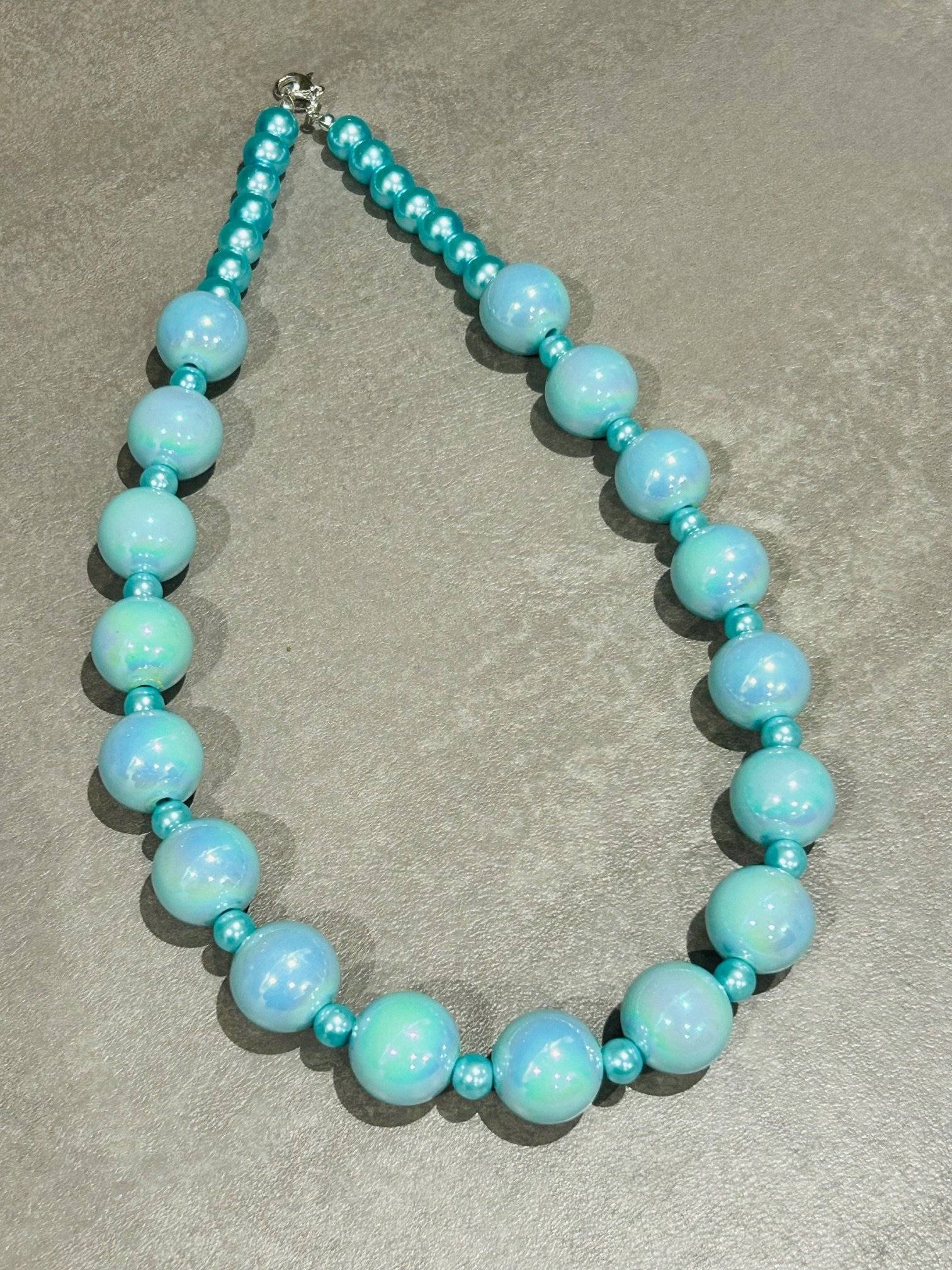 Colierul ILDIKO este confecționat din mărgele acrilice ultra-perlate, cu dimensiunea de 16 mm, perle preciosa de 8 și 4 mm în culori aprinse de albastru cyan.