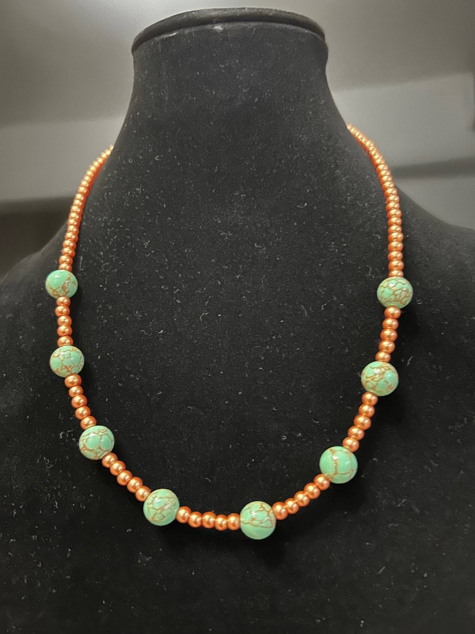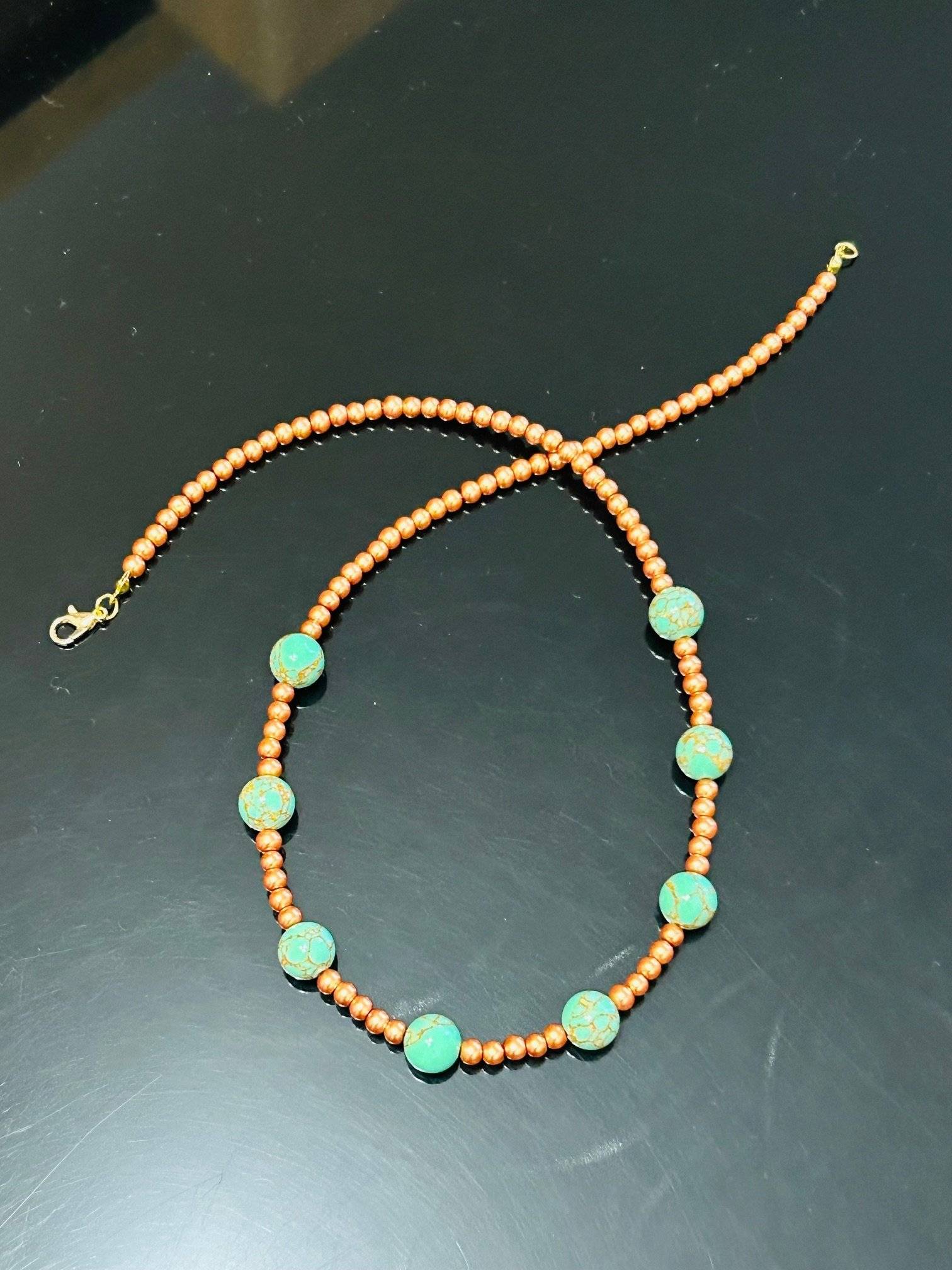Un colier foarte finuț și jucăuș în același timp de purtat la baza gâtului! Este confecționat din sfere de howlit verde filat auriu, cu dimensiunea de 10 mm și perlă de sticlă, culoare bronz, cu dimensiunea de 4 mm.