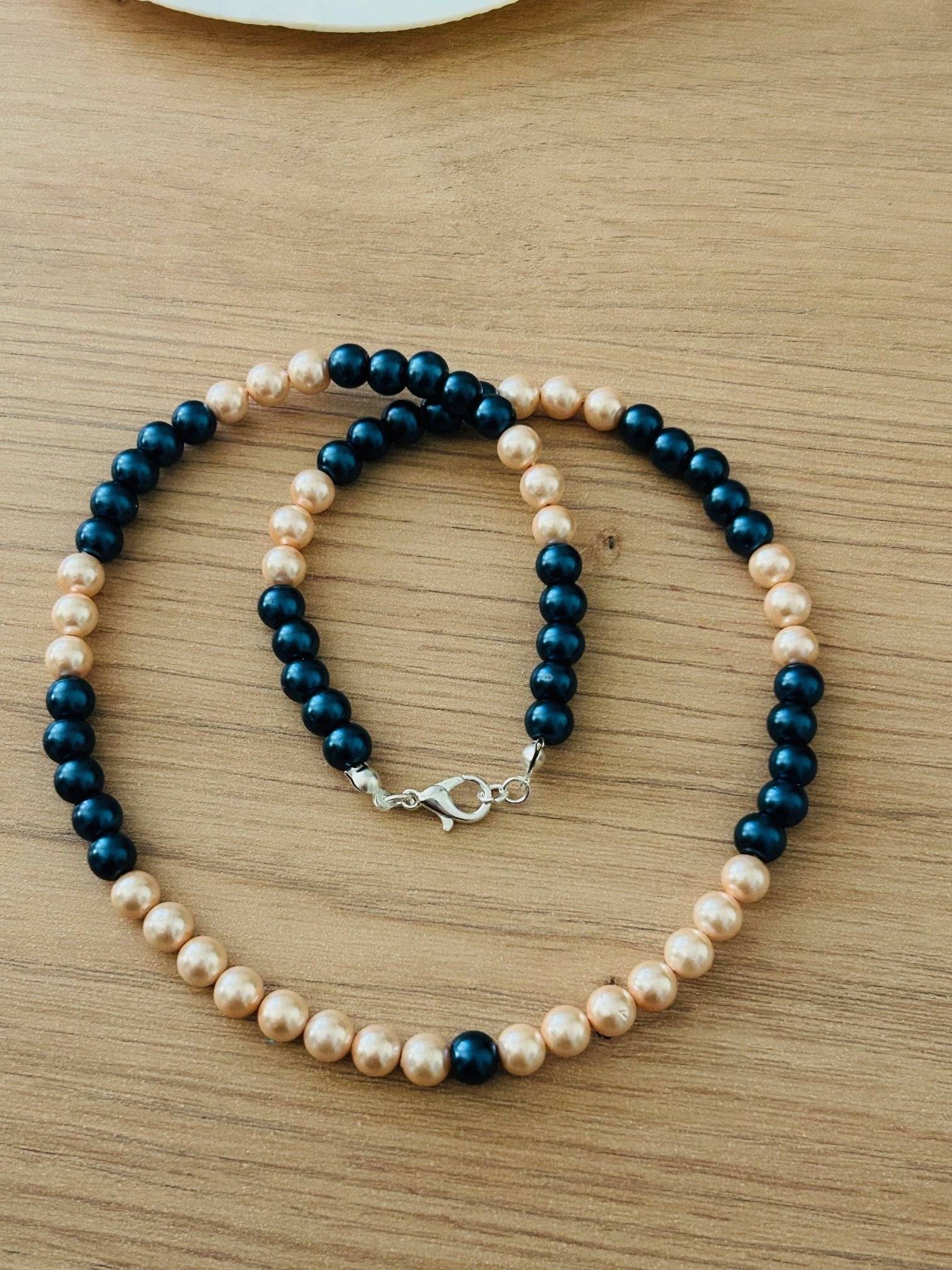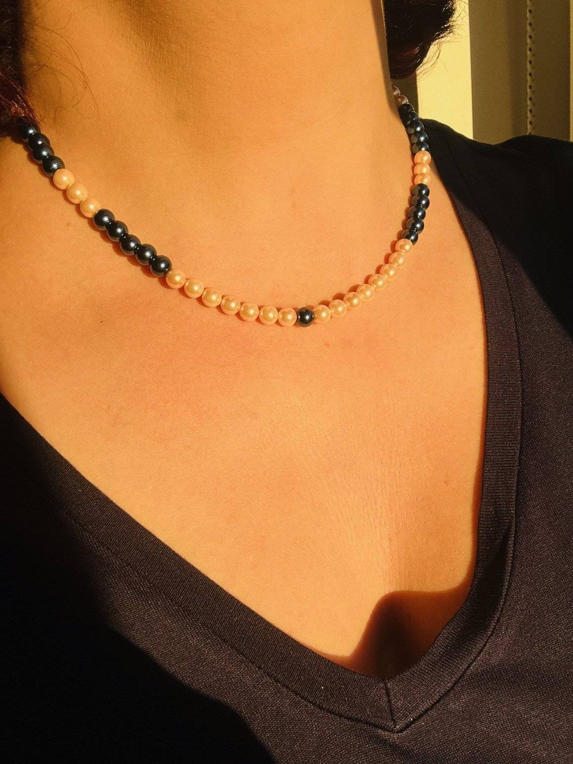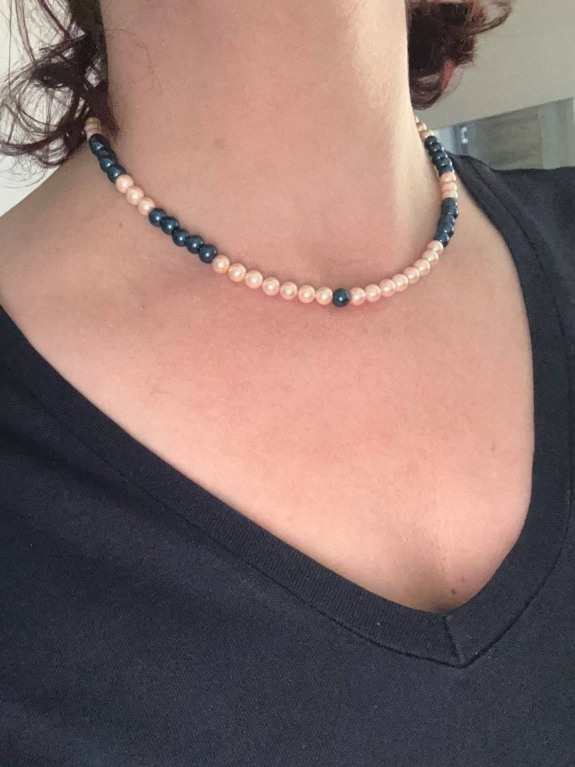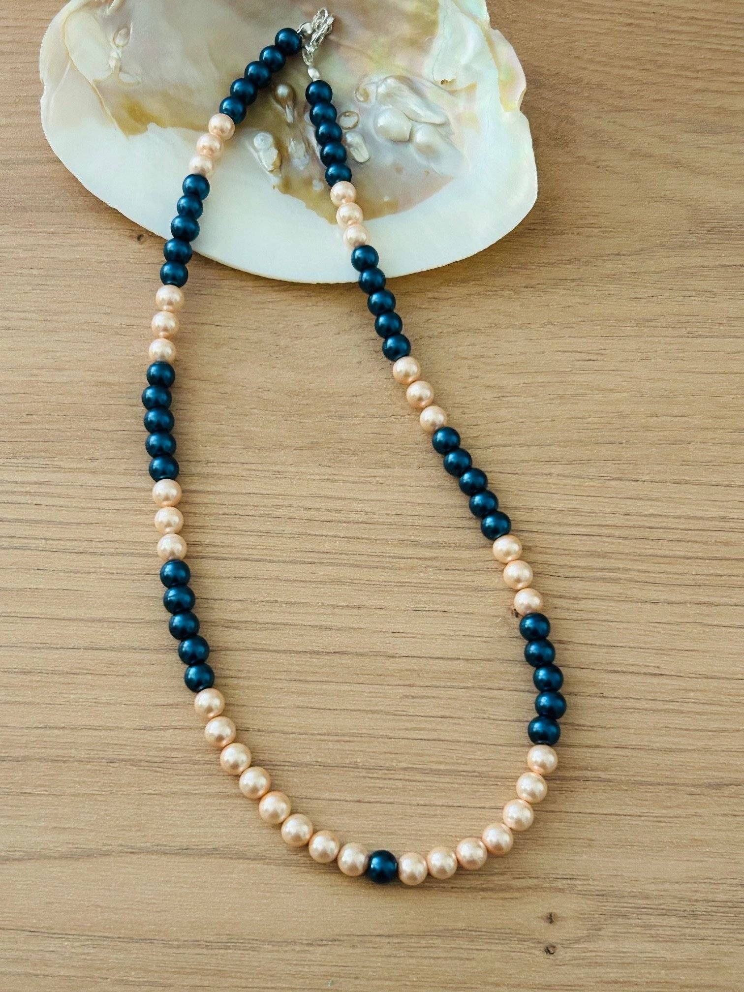 - perlă preciosa, cal.I, culoare bleumarin, sfere cu dimensiunea de 6 mmLungimea colierului este de cca. 43 cm. Perlele sunt montate pe fir oțel siliconat de 0,45 mm grosime, iar închiderea se face prin închizătoare lobster din aliaj placat cu argint.