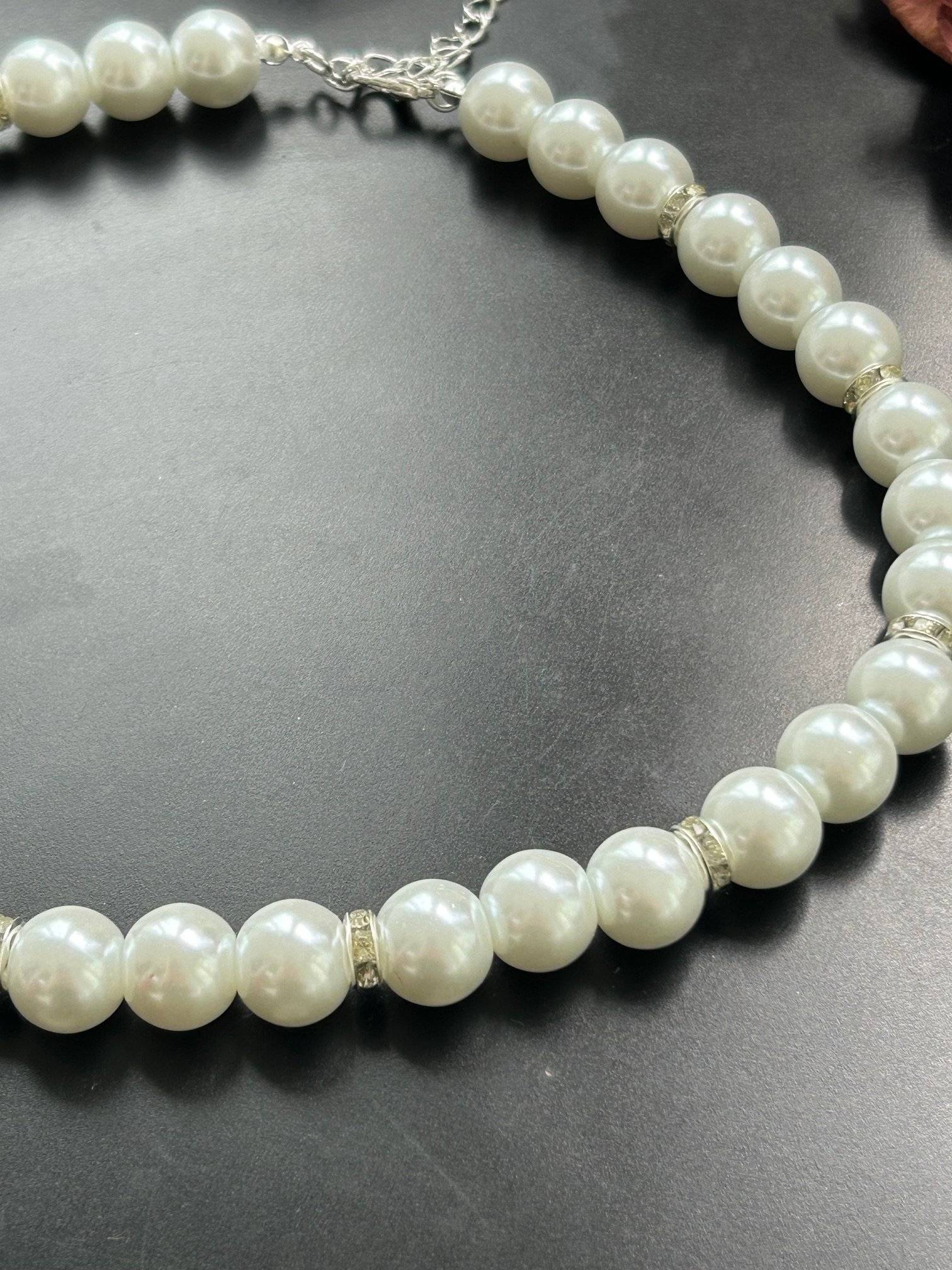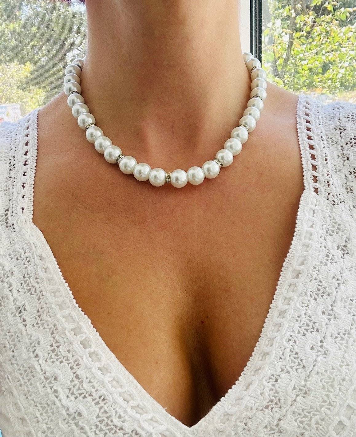 Vă prezentăm un colier realizat manual din perle albe sidefate Preciosa, de calitate AA+, cu dimensiunea de 12 mm și distanțiere cu cristale Rhinestone.