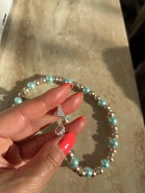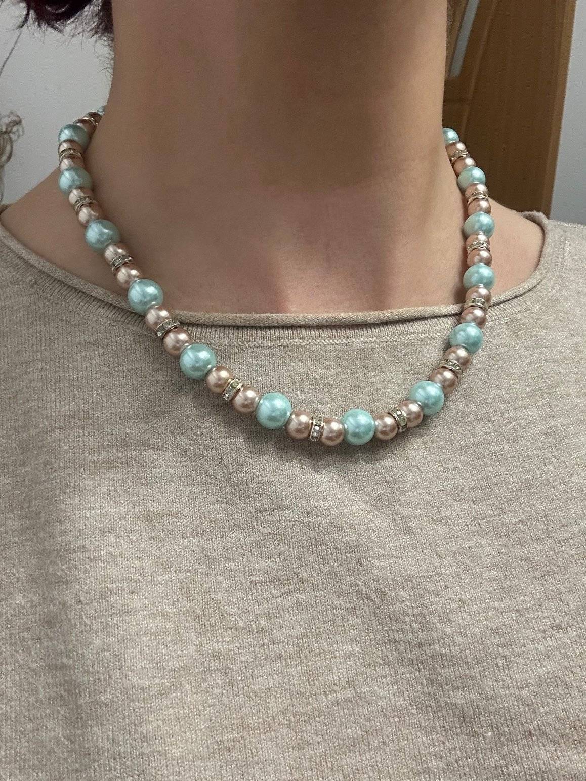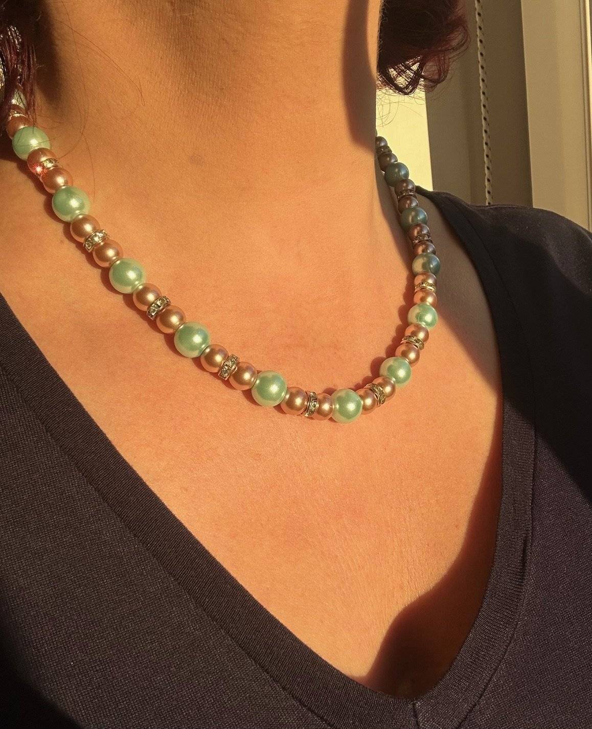 Lungimea colierului este de 45-47 cm. Perlele de sticlă sunt înșirate pe sârmă siliconată de 0,45 mm grosime, iar închiderea se face cu închizătoare magnetică argintie din aliaj ușor, încrustată cu cristale.