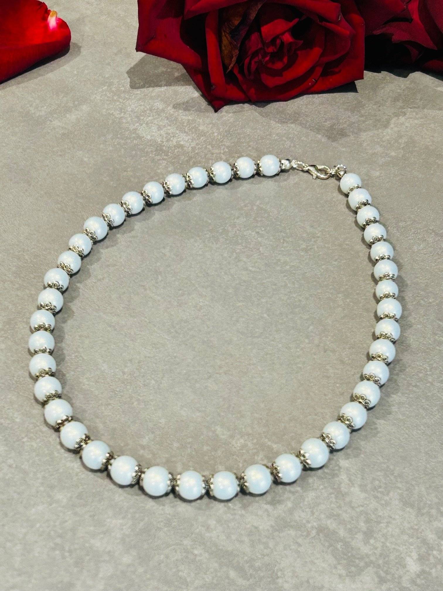 Colierul este confecționat din perle Preciosa, culoare white gold dust, dimensiune 8 mm, într-o lucrătură de distanțiere metalice de tip floricică argintie.