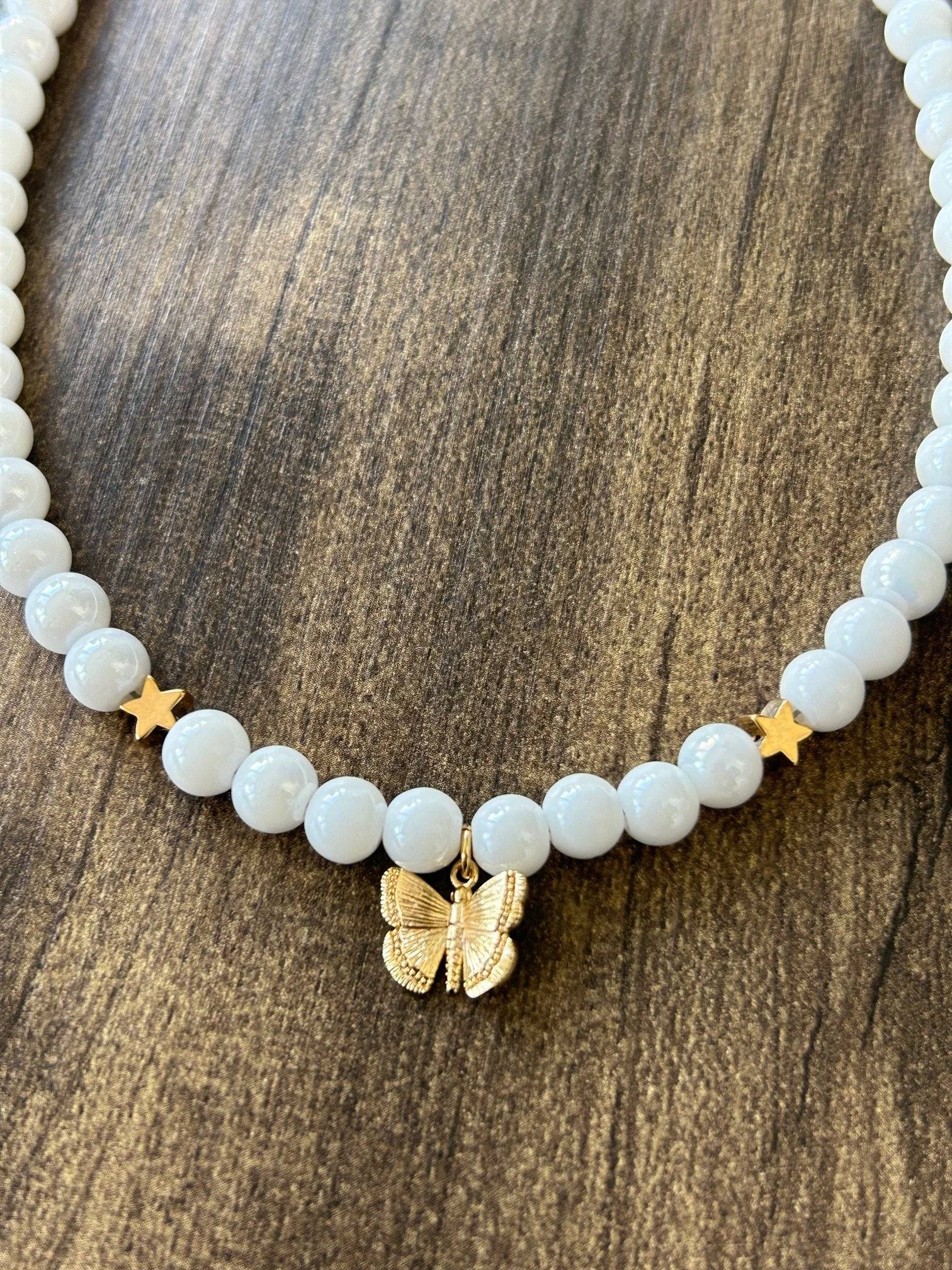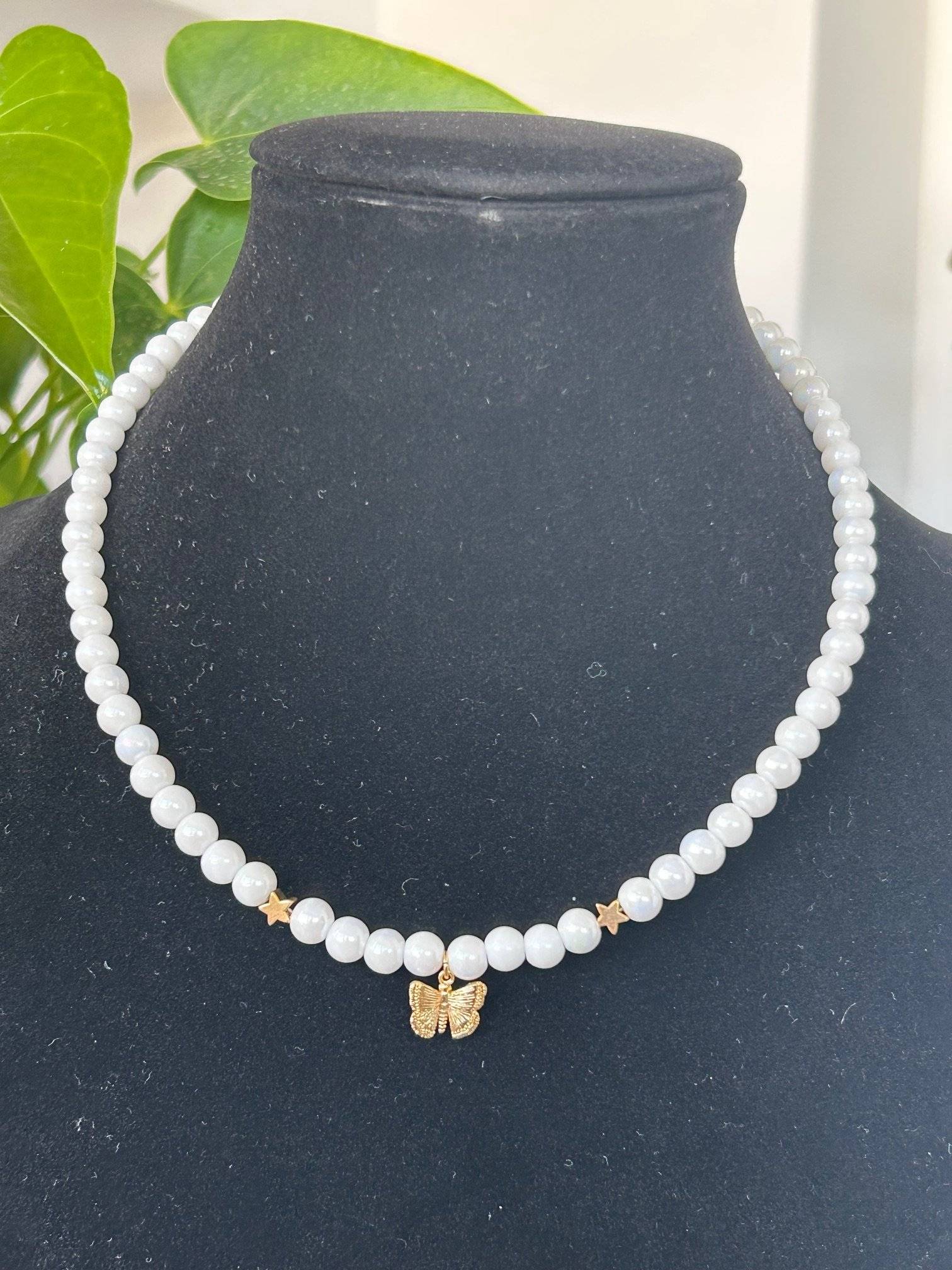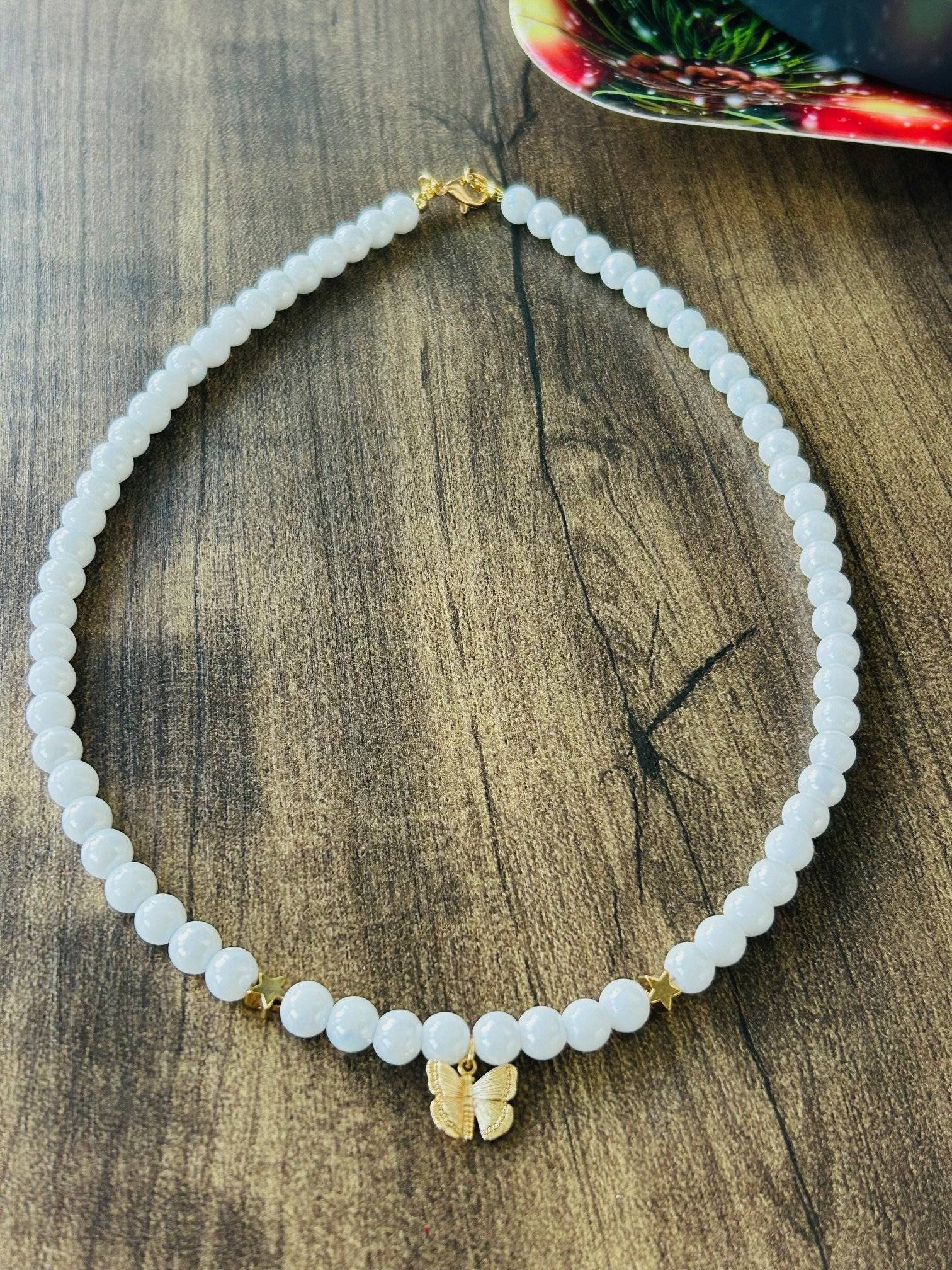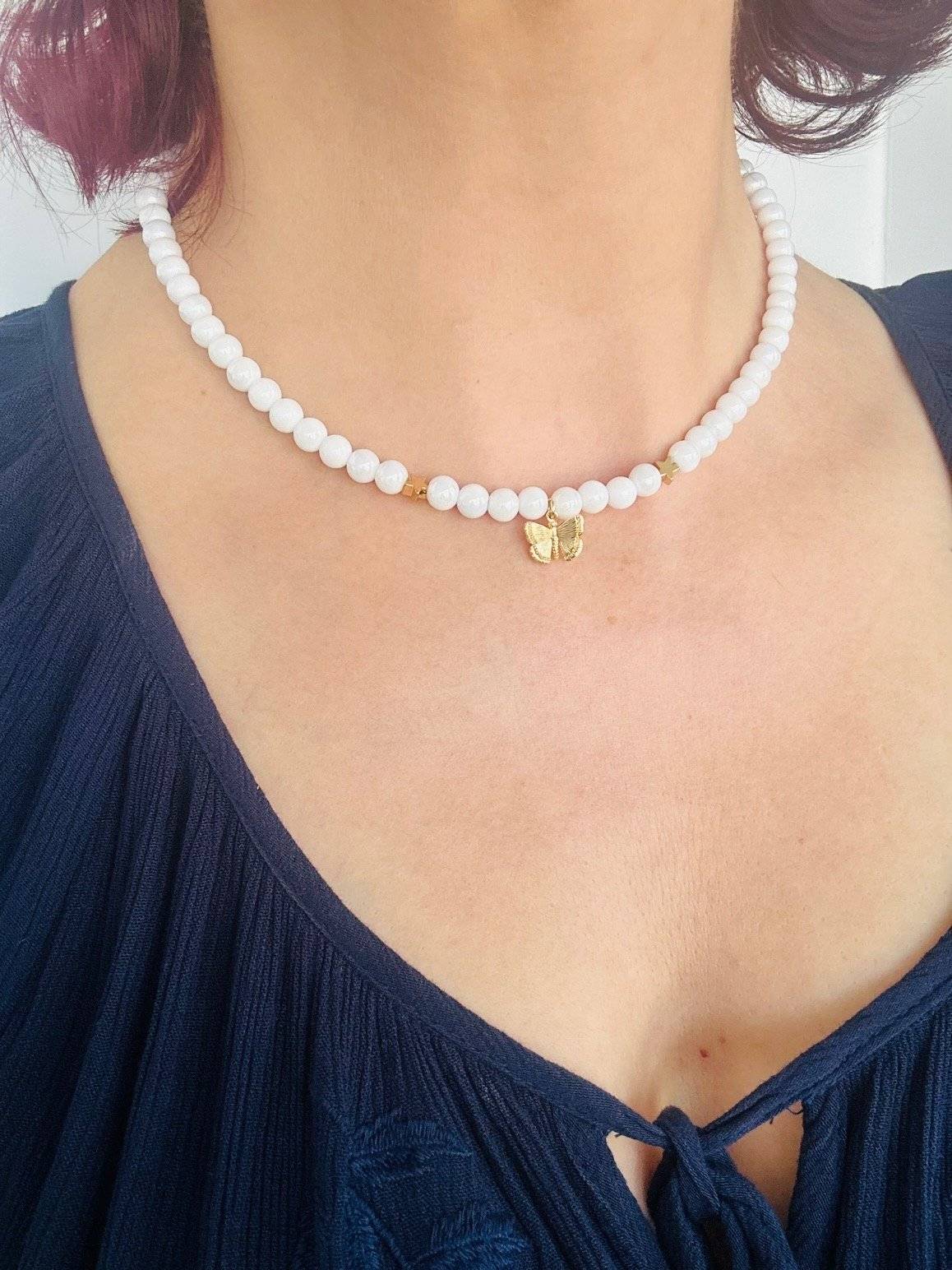 Vă prezentăm un colier realizat manual din perle scoică albe sidefate PRECIOSA, de calitate AA+, cu dimensiunea de 6 mm și accesorii centrale din alamă placată cu aur de 18 K.