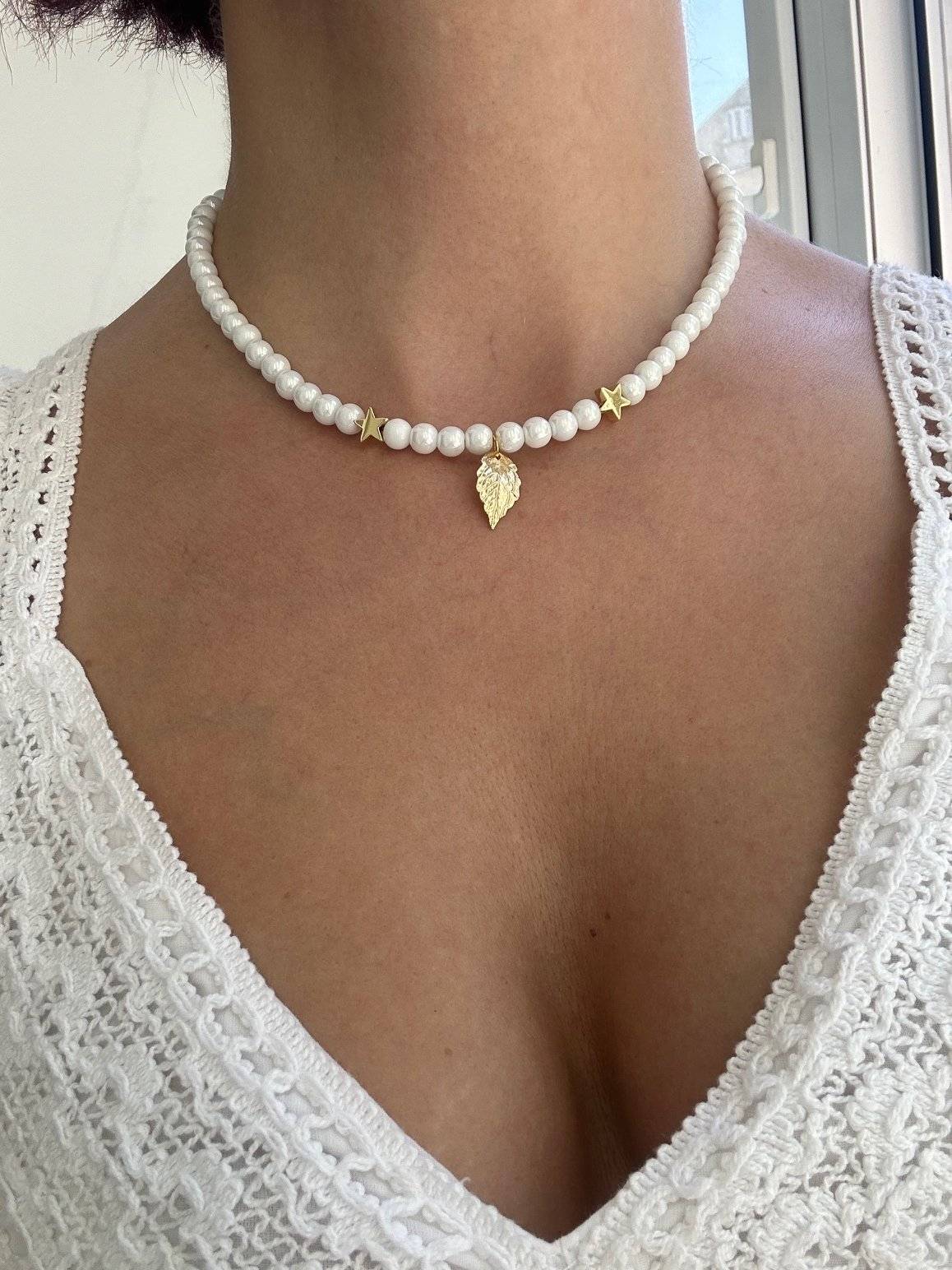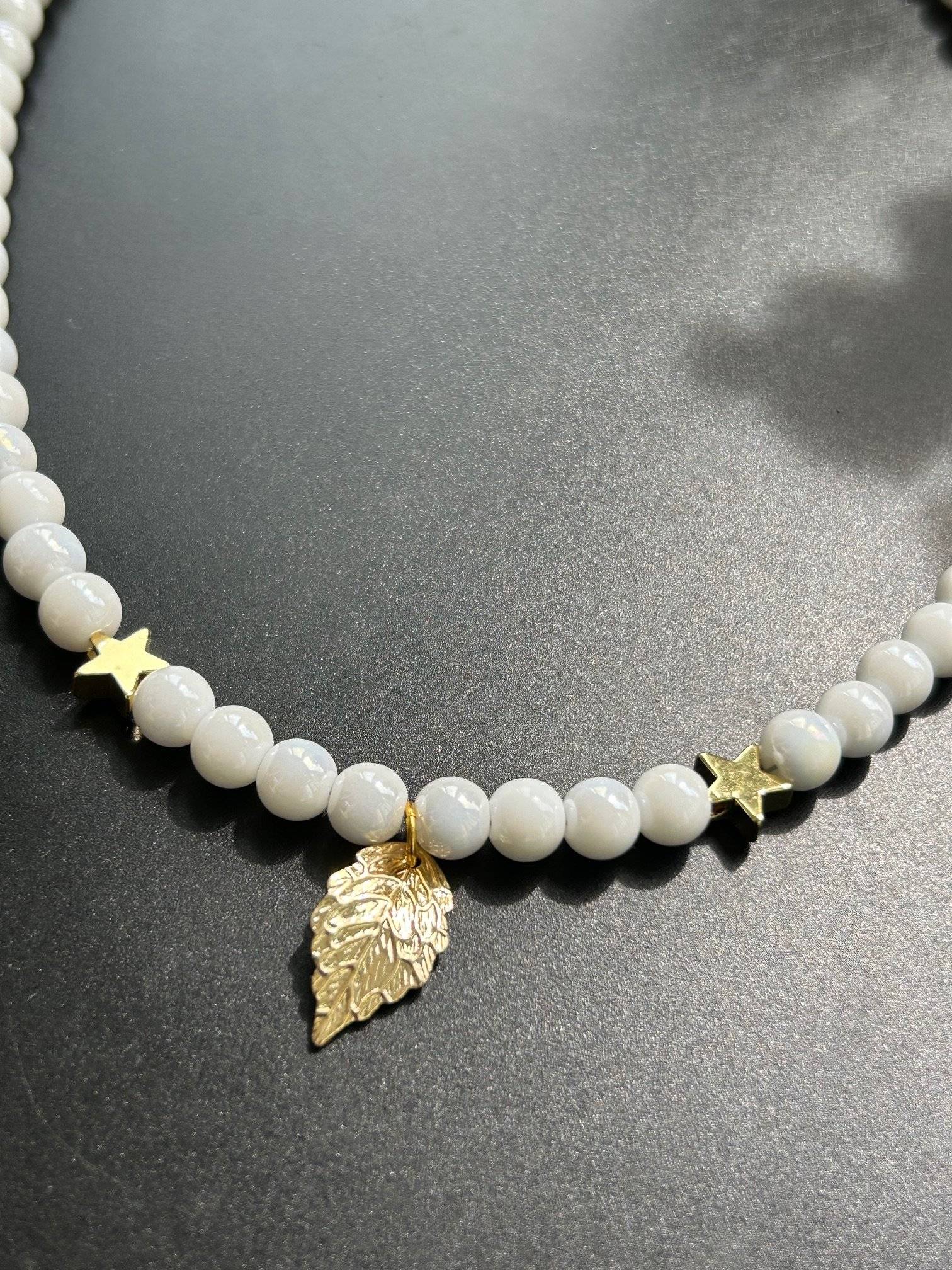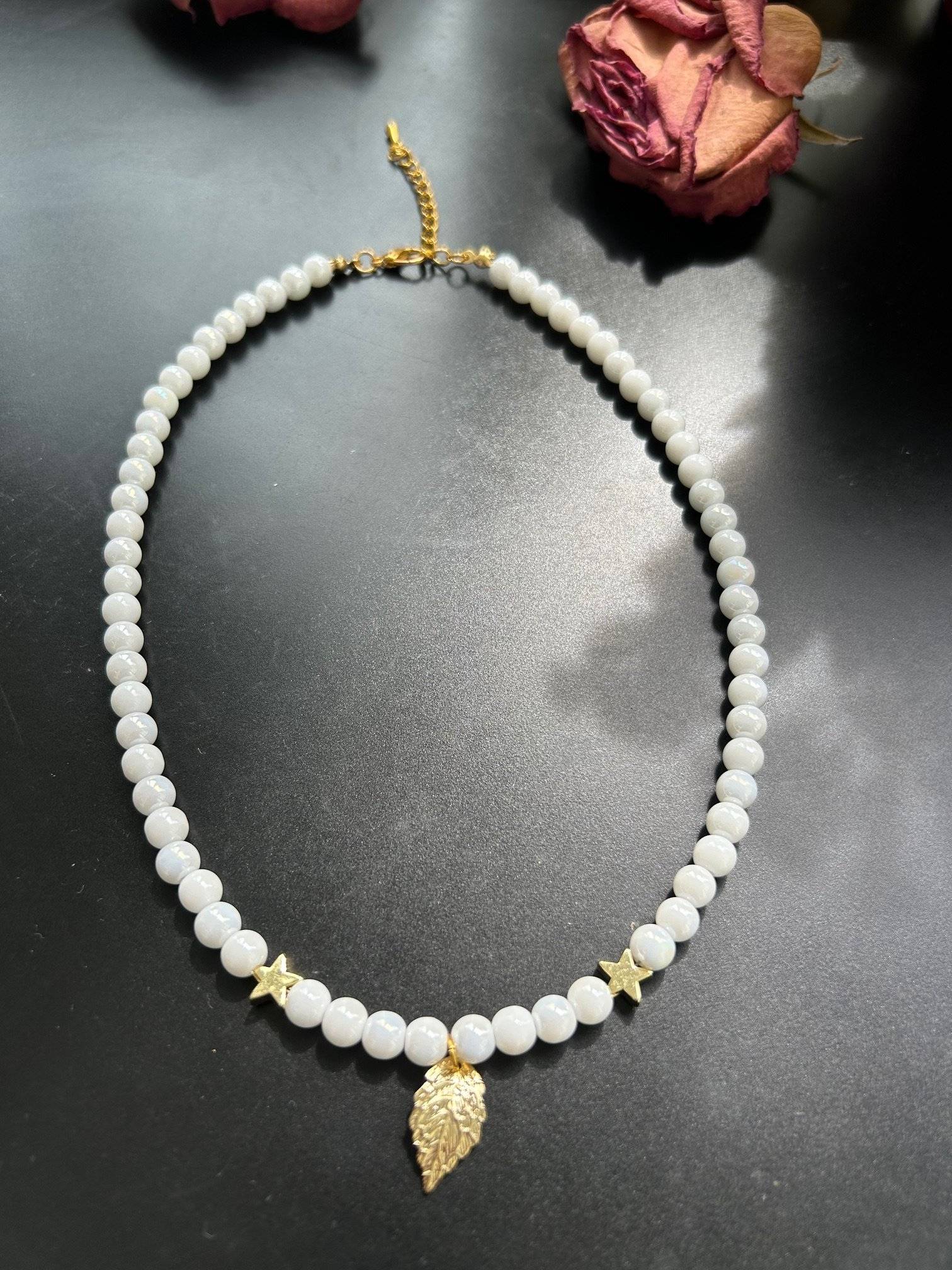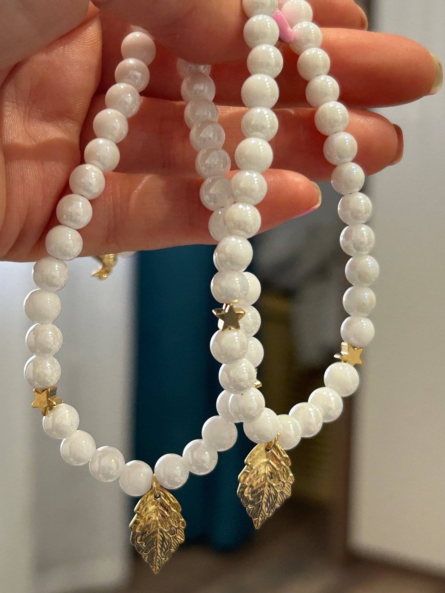 Vă prezentăm un colier realizat manual din perle tip scoică albe sidefate PRECIOSA, de calitate AA+, cu dimensiunea de 6 mm și accesorii centrale din alamă placată cu aur de 18 K.