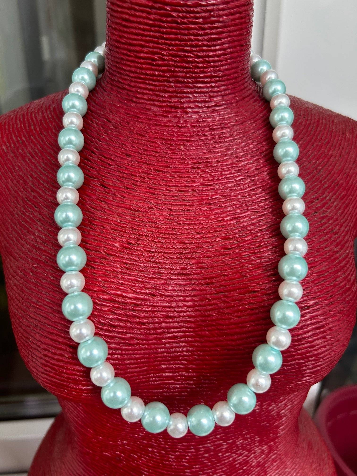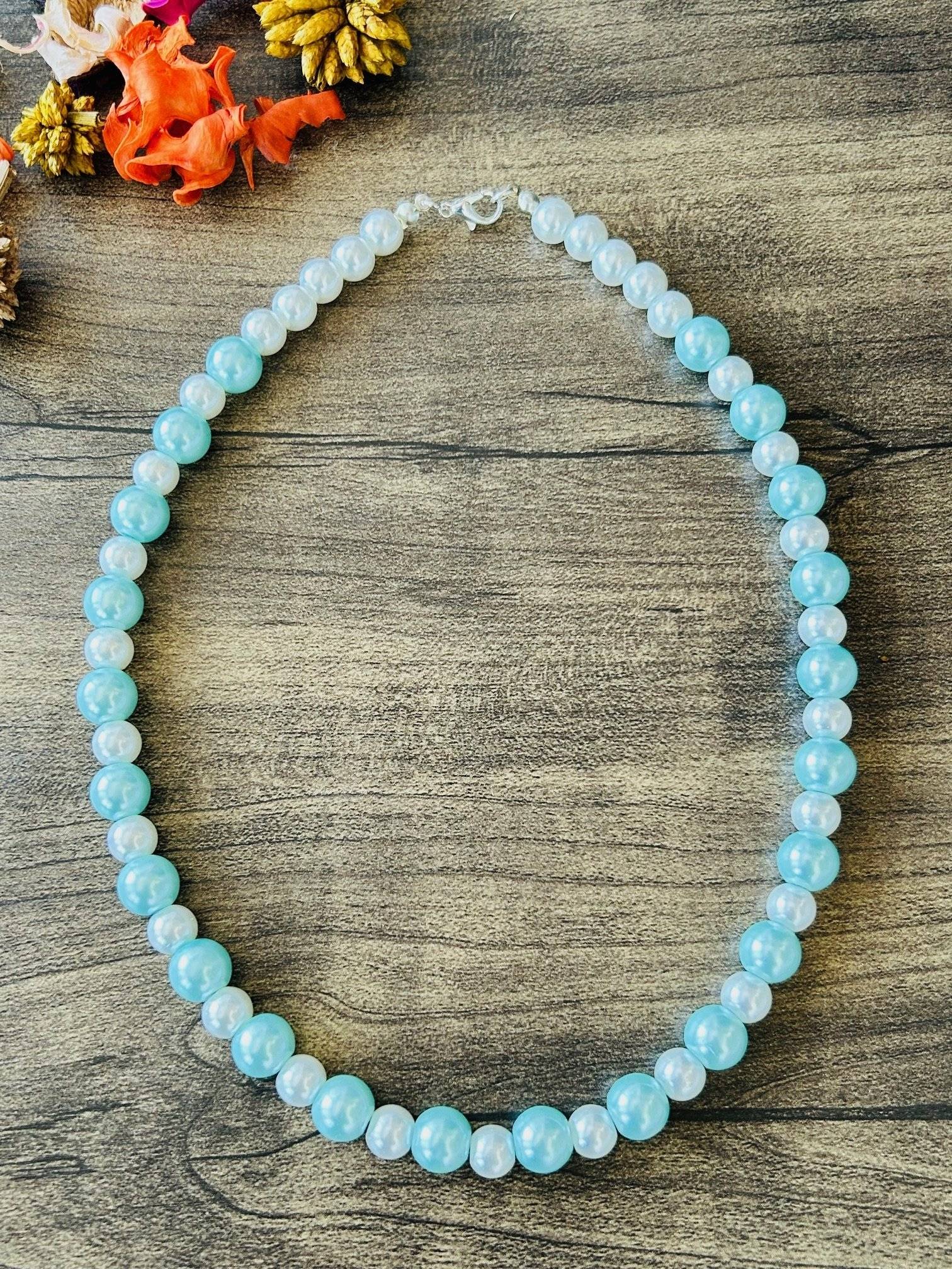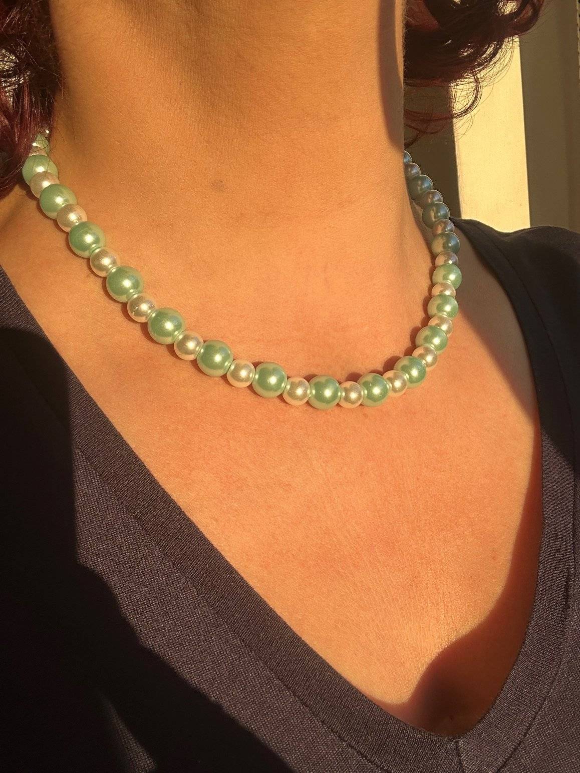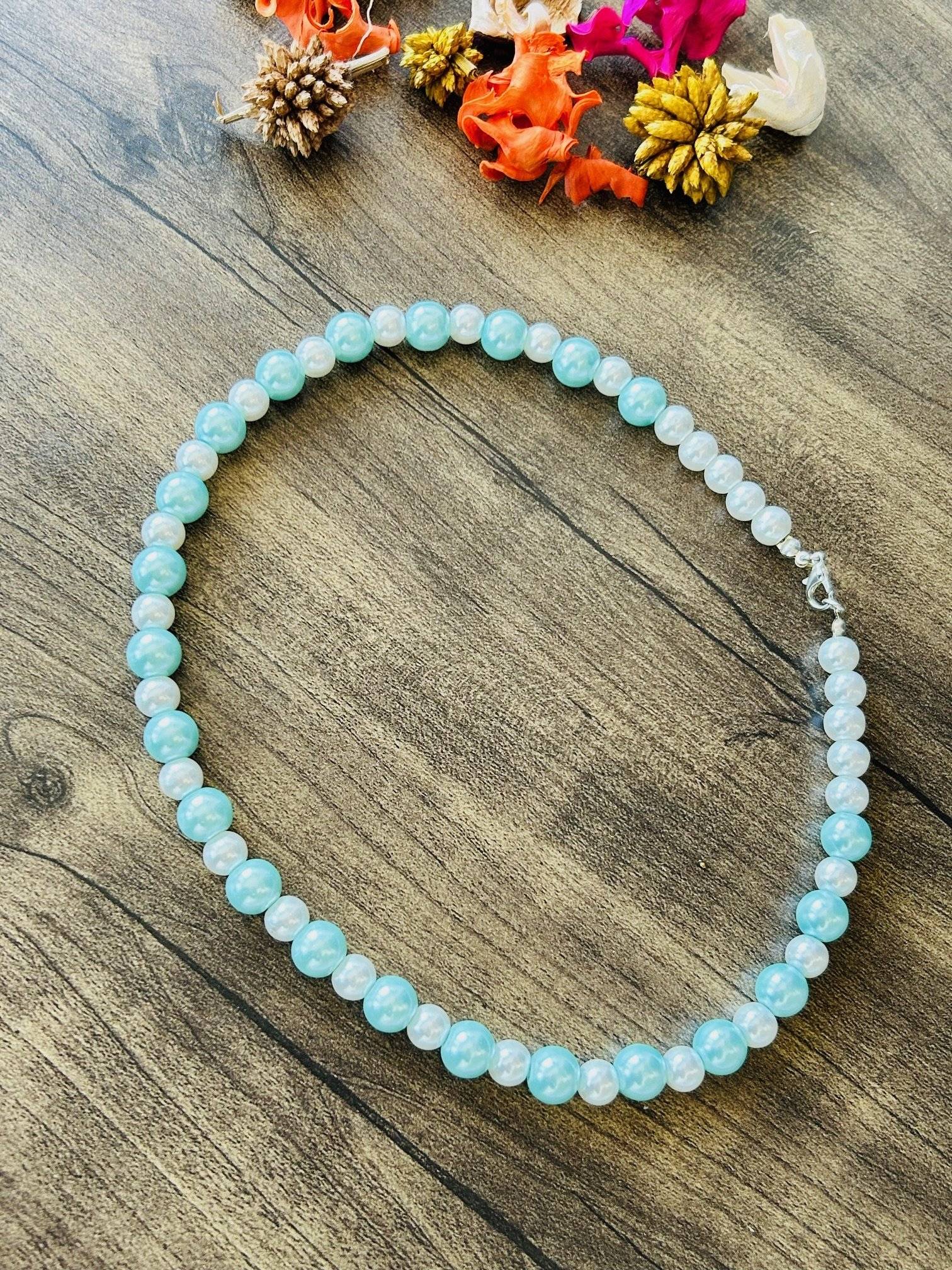 - perlă Preciosa, cal.I, culoare blue aqua, sfere cu dimensiunea de 10 mmLungimea colierului este de 43 cm. Perlele de sticlă sunt montate pe fir oțel siliconat de 0,45 mm grosime, iar închiderea se face cu închizătoare lobster din aliaj placat cu argint.