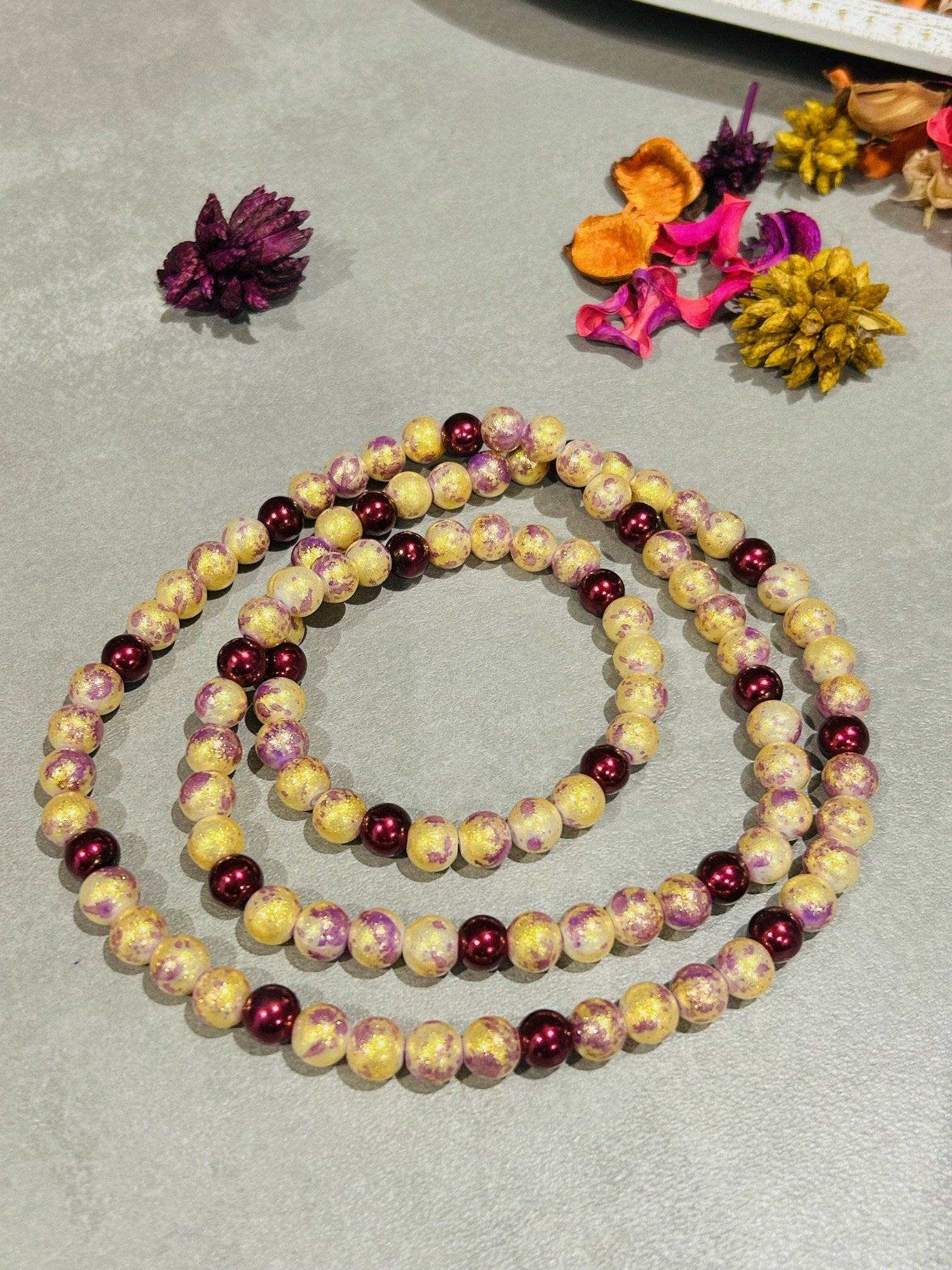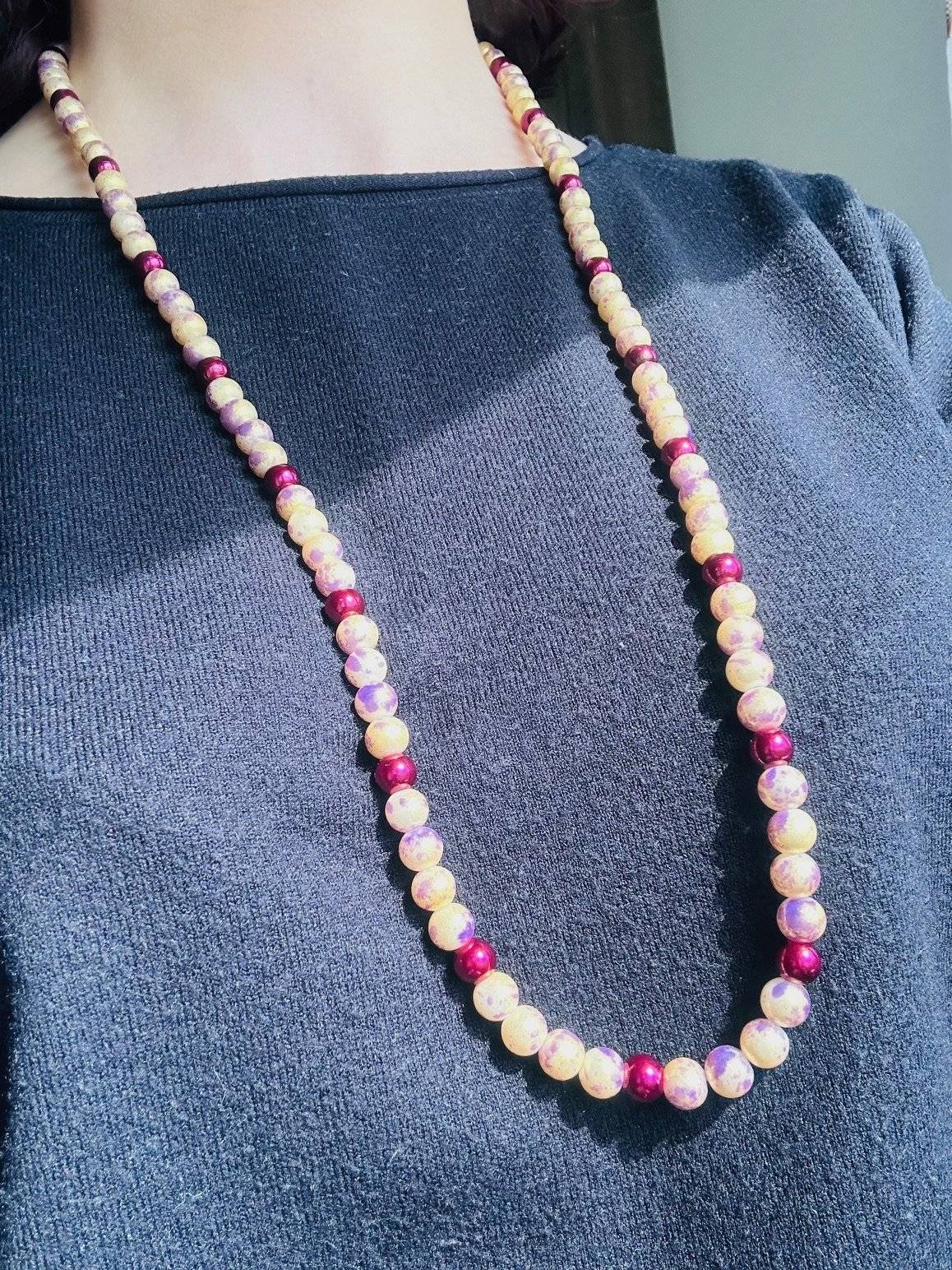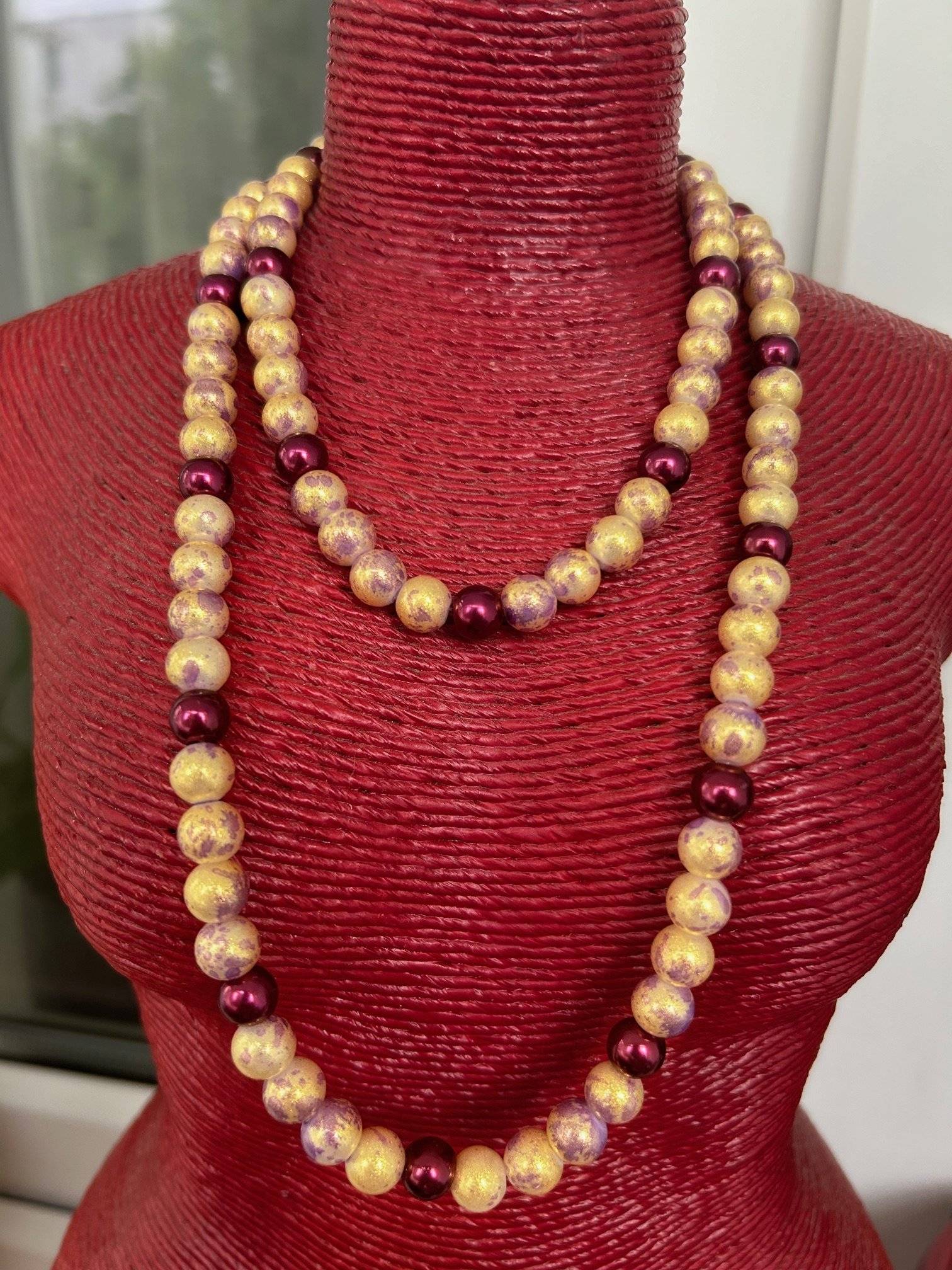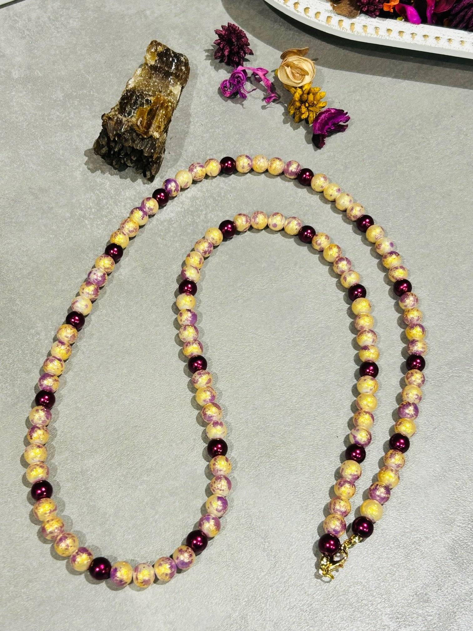 - perlă de sticlă, cal.I, culoare aurie cu luciu prăfuit, sfere cu dimensiunea de 8 mmLungimea colierului este de cca. 88 cm. Perlele de sticlă sunt înșirate pe fir oțel siliconat de 0,45 mm grosime, iar închiderea se face prin închizătoare lobster din aliaj auriu.