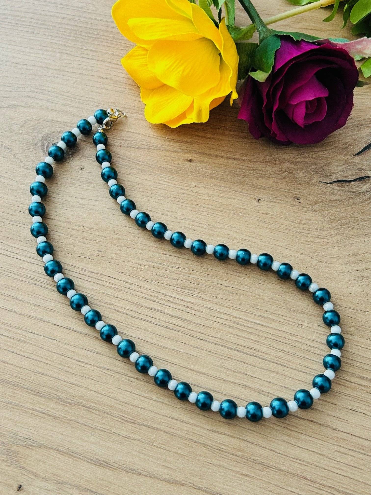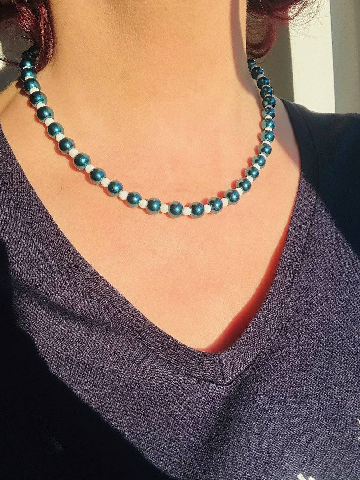 - perlă de sticlă, cal.I, culoare albastru cadet, sfere cu dimensiunea de 8 mmLungimea colierului este de 45 cm. Perlele de sticlă sunt înșirate pe sârmă siliconată de 0,40 mm grosime, iar închiderea se face cu închizătoare lobster din aliaj placată cu argint.