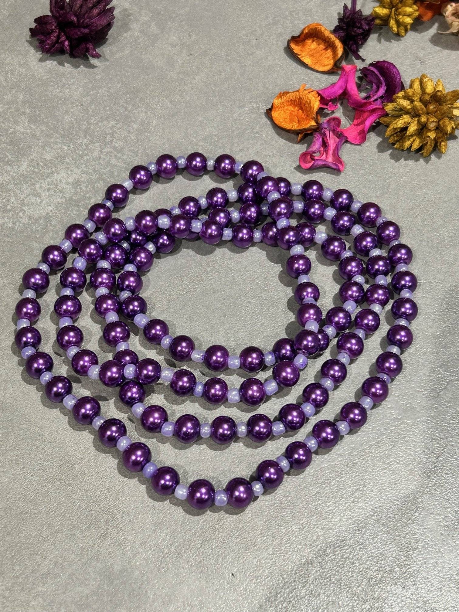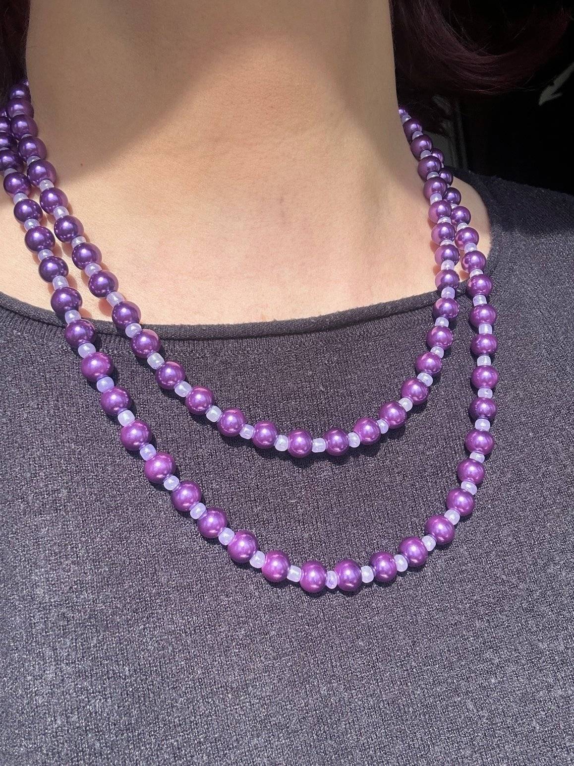 - perlă de sticlă, cal.I, culoare mov orhidee, sfere cu dimensiunea de 8 mmLungimea colierului este de cca. 108 cm și poate fi dublat la gât. Perlele de sticlă sunt înșirate pe fir oțel siliconat de 0,45 mm grosime, iar închiderea se face prin închidere lobster din aliaj placat cu argint.