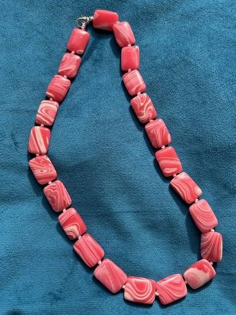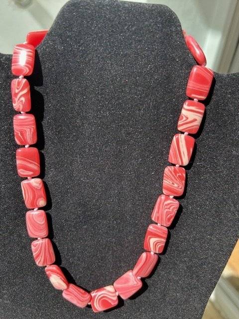 Colier din piatră sintetică dreptunghiulară roșu-portocaliu, cu inserții alb-crem.