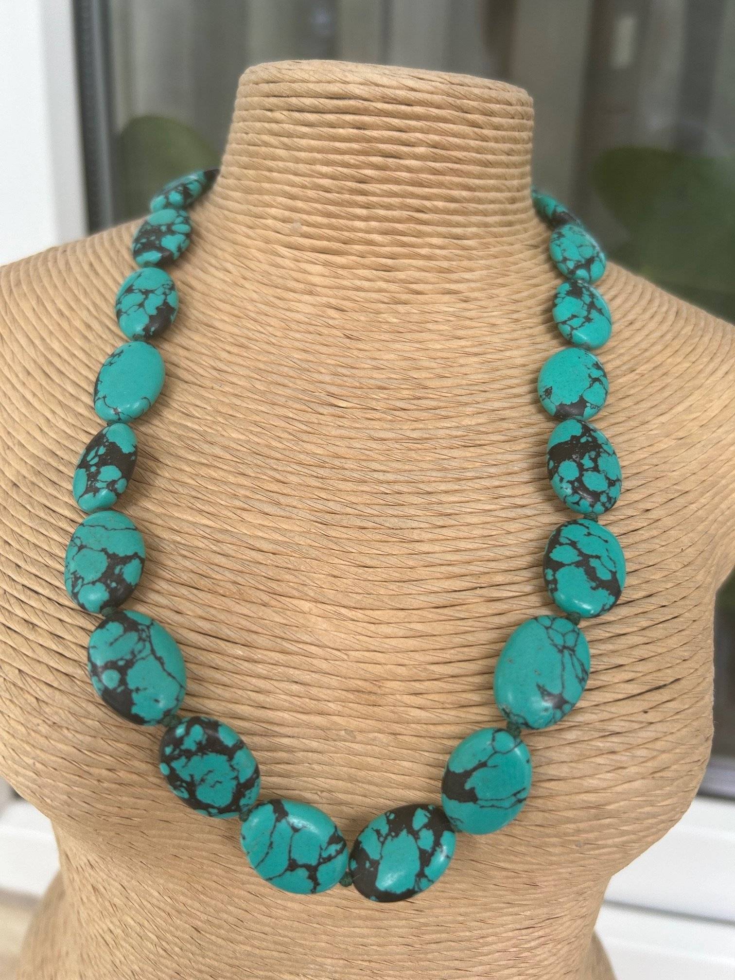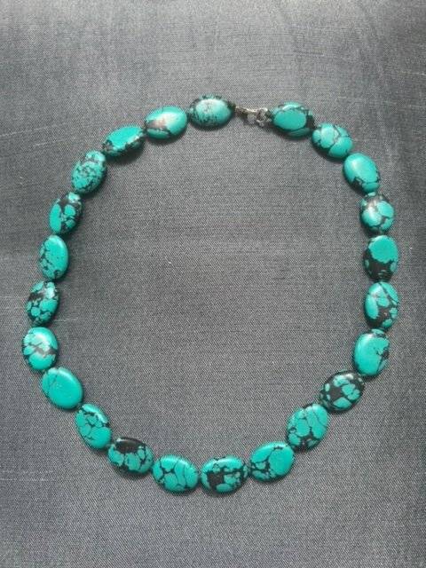 Colier din piatră sintetică ovală turcoaz cu inserții negre.