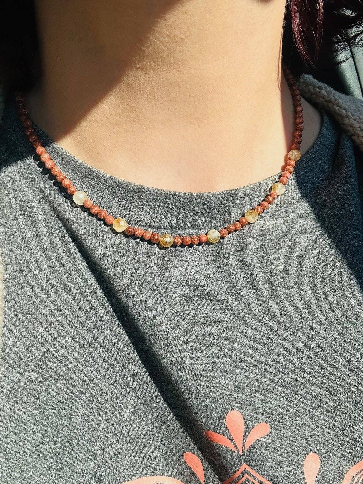 Lungimea colierului este de cca. 45 cm. Chipsurile sunt montate pe fir oțel siliconat de 0,40 mm grosime, iar închiderea se face prin închizătoare lobster din aliaj placat cu aur.