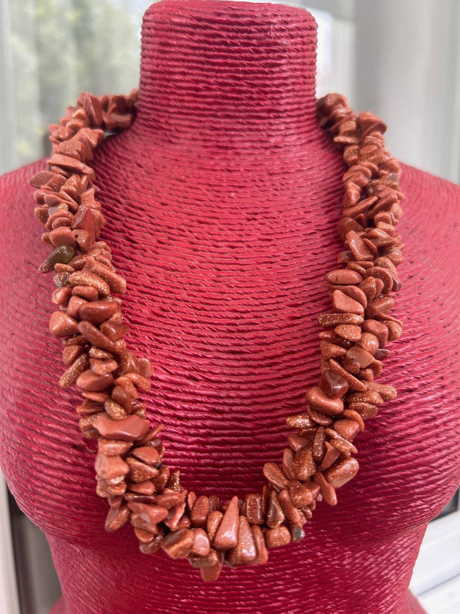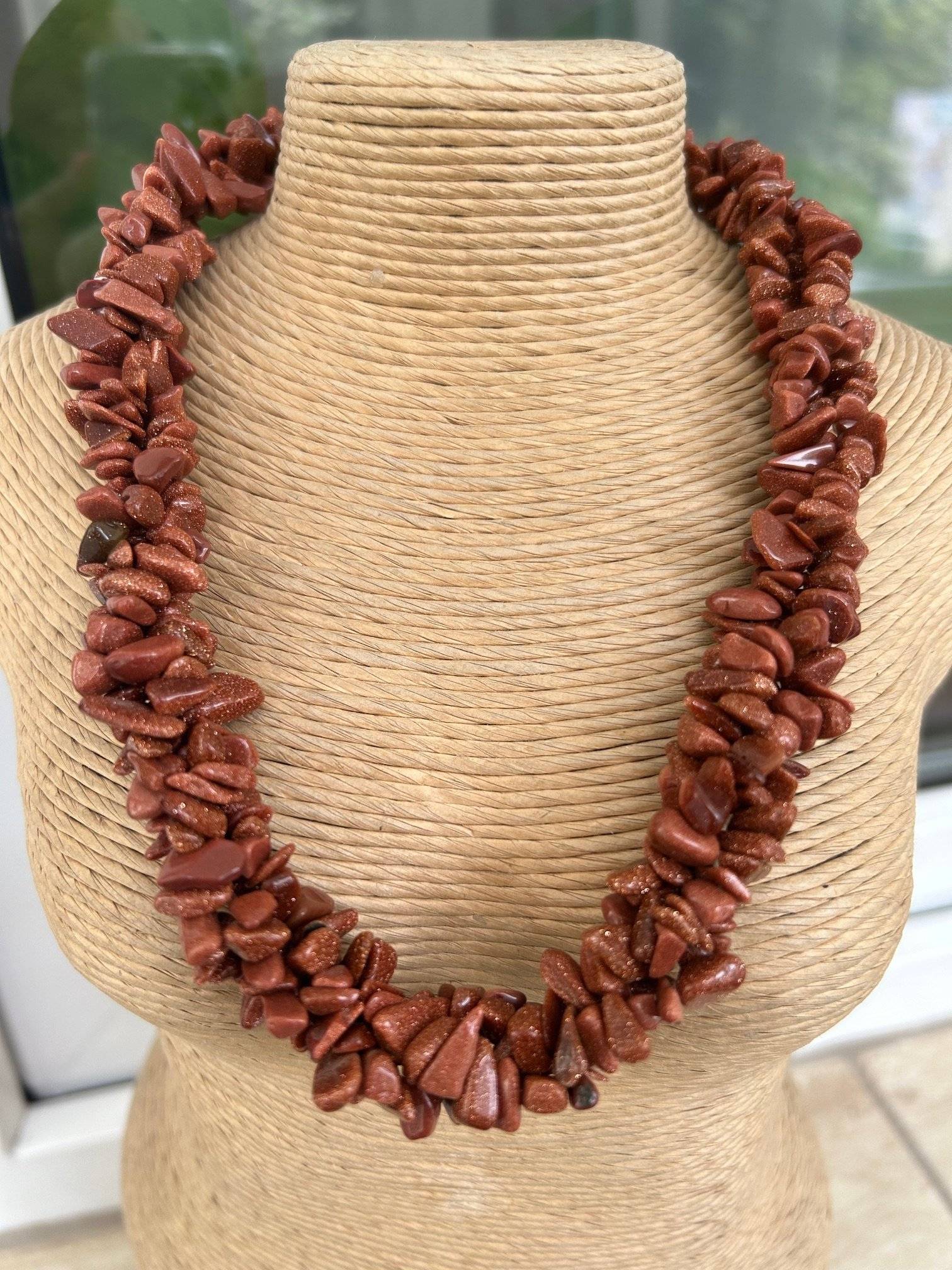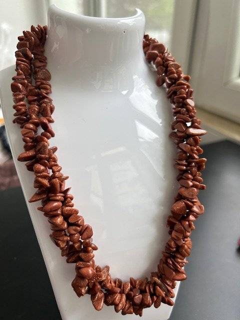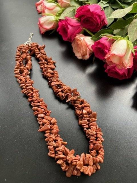 Un colier la baza gâtului din 3 șiraguri răsucite, unul pe lângă altul, din chipsuri mari 5-10 mm de piatra soarelui maro cu irizații aurii - piatră sintetică.