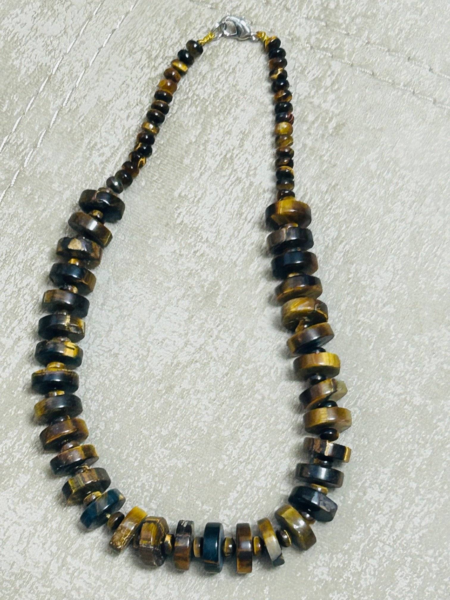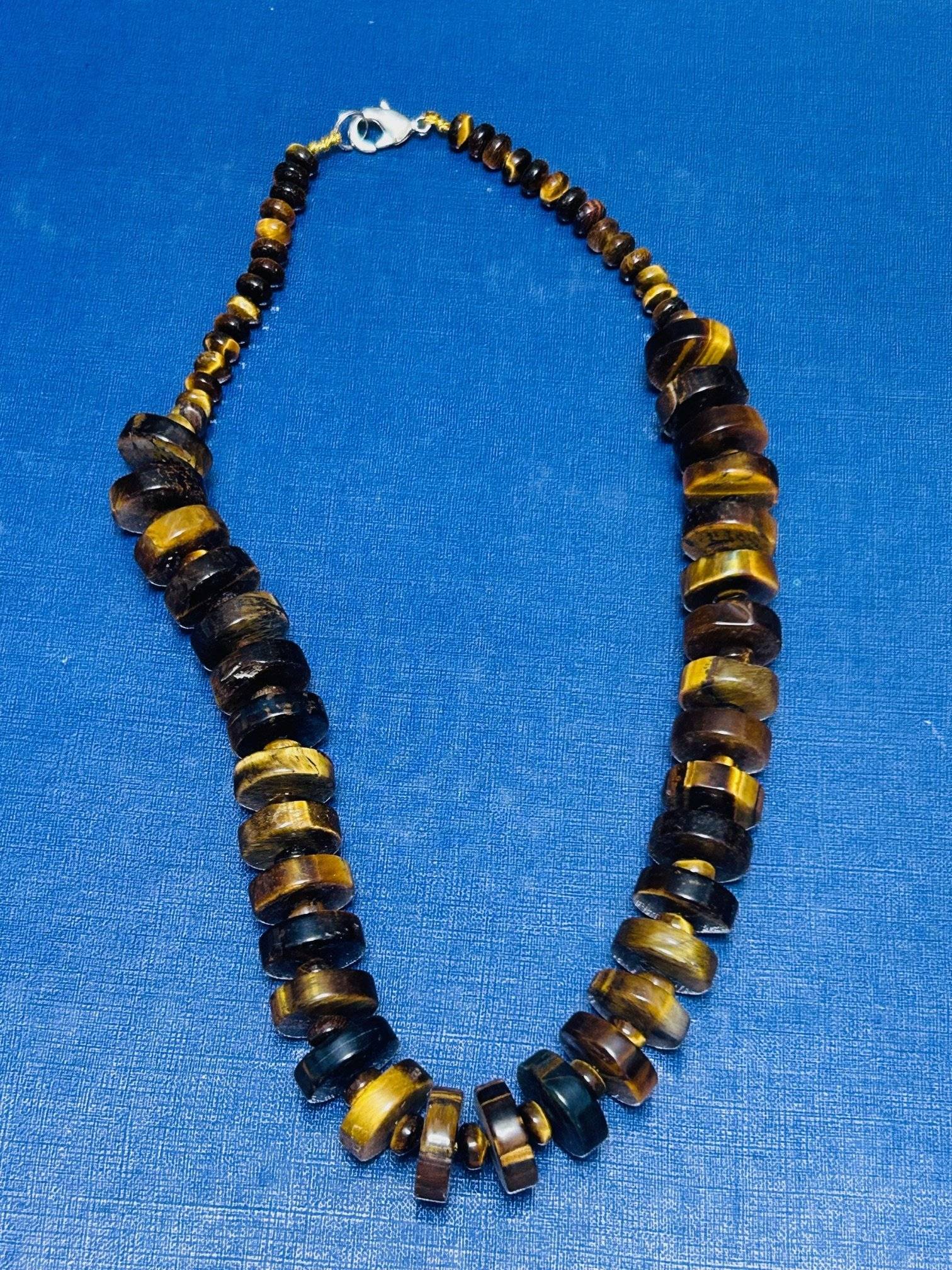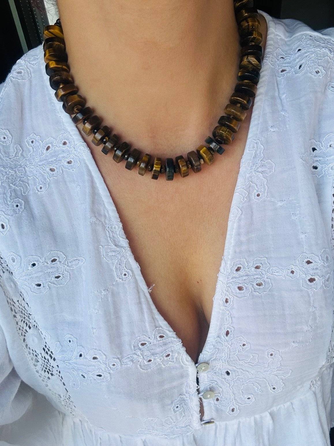 Colier format din discuri mici și mari confecționate din ochi de tigru, inșirate pe fir textil multistrat.