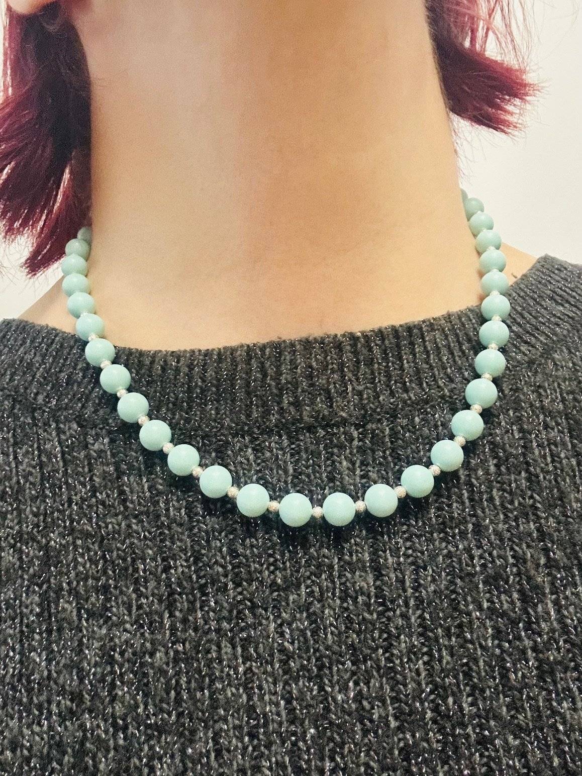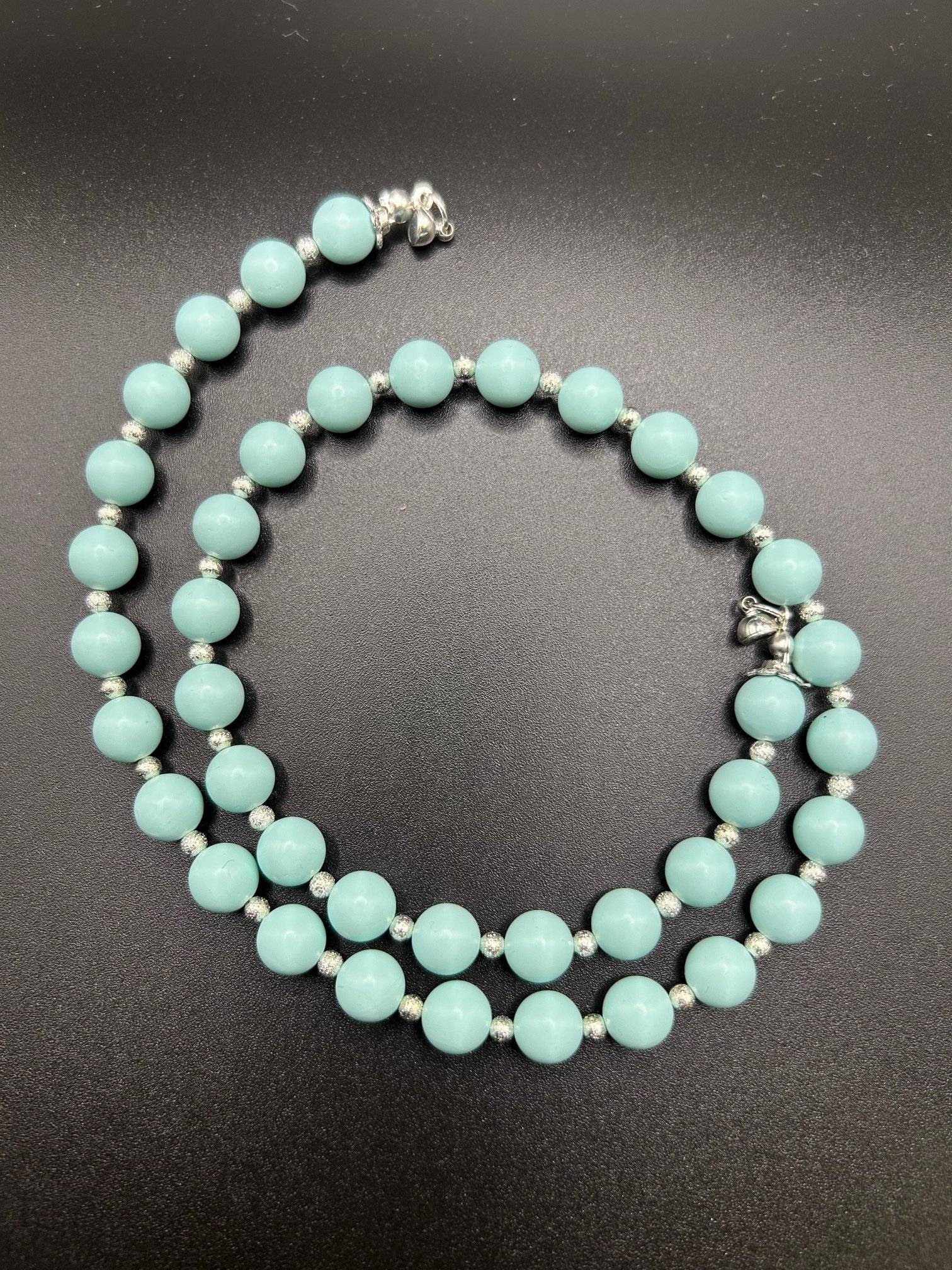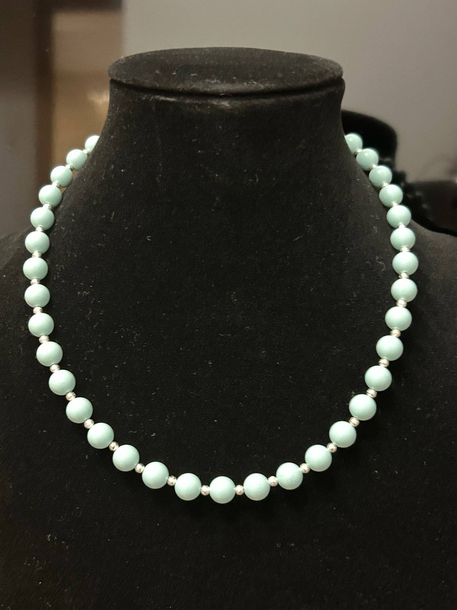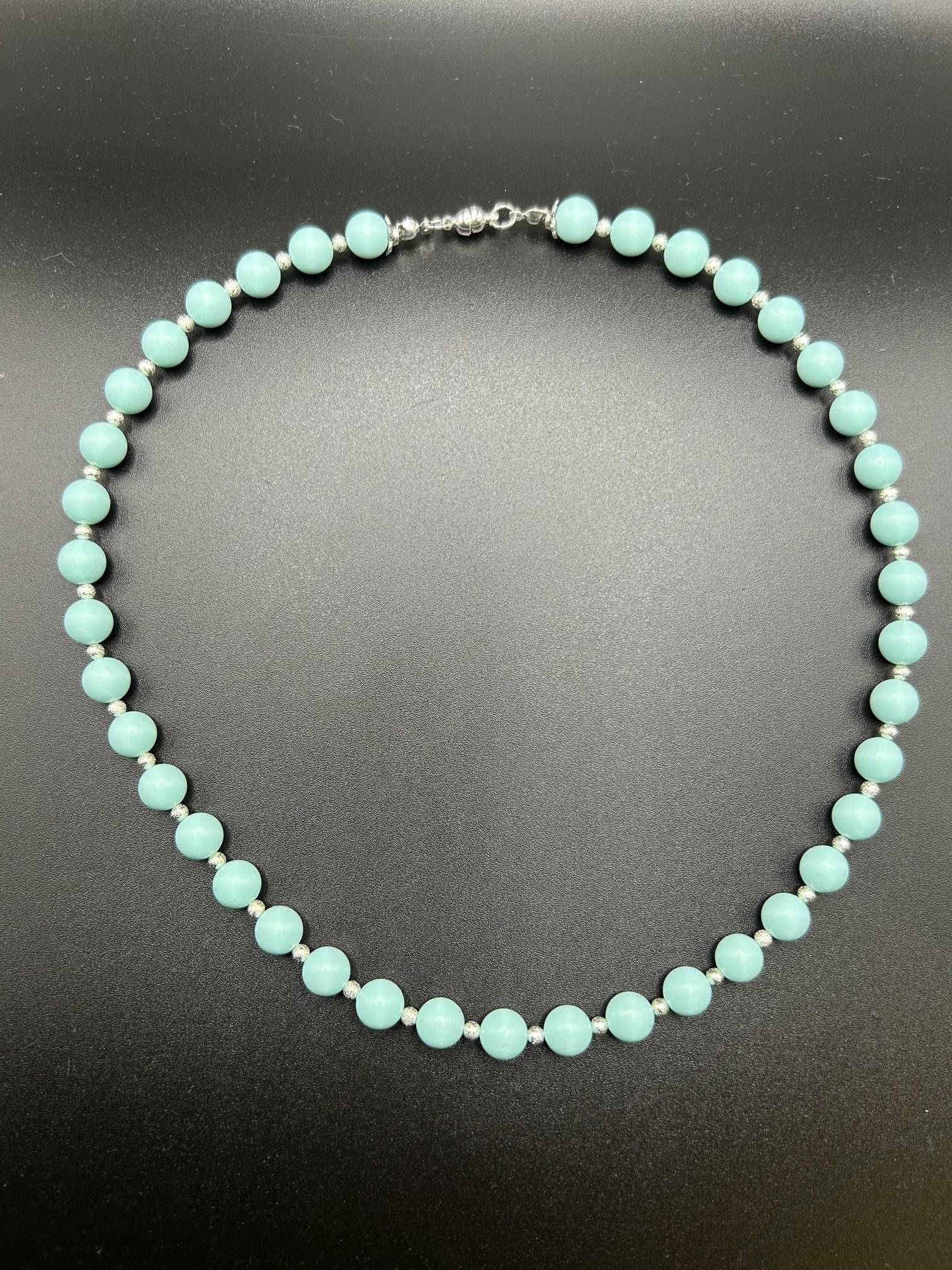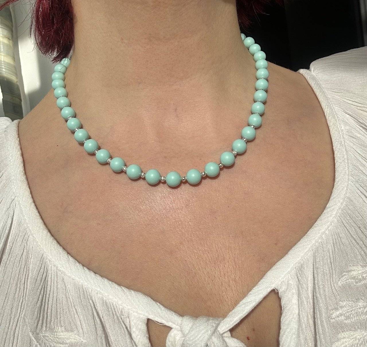 - perlă shell pale turquoise, sfere cu dimensiunea de 8 mm (perle de laborator).Lungimea colierului este de cca. 45 cm. Mărgelele sunt montate pe fir oțel siliconat de 0,45 mm grosime, iar închiderea se face cu închizătoare magnetică din aliaj placat cu argint.