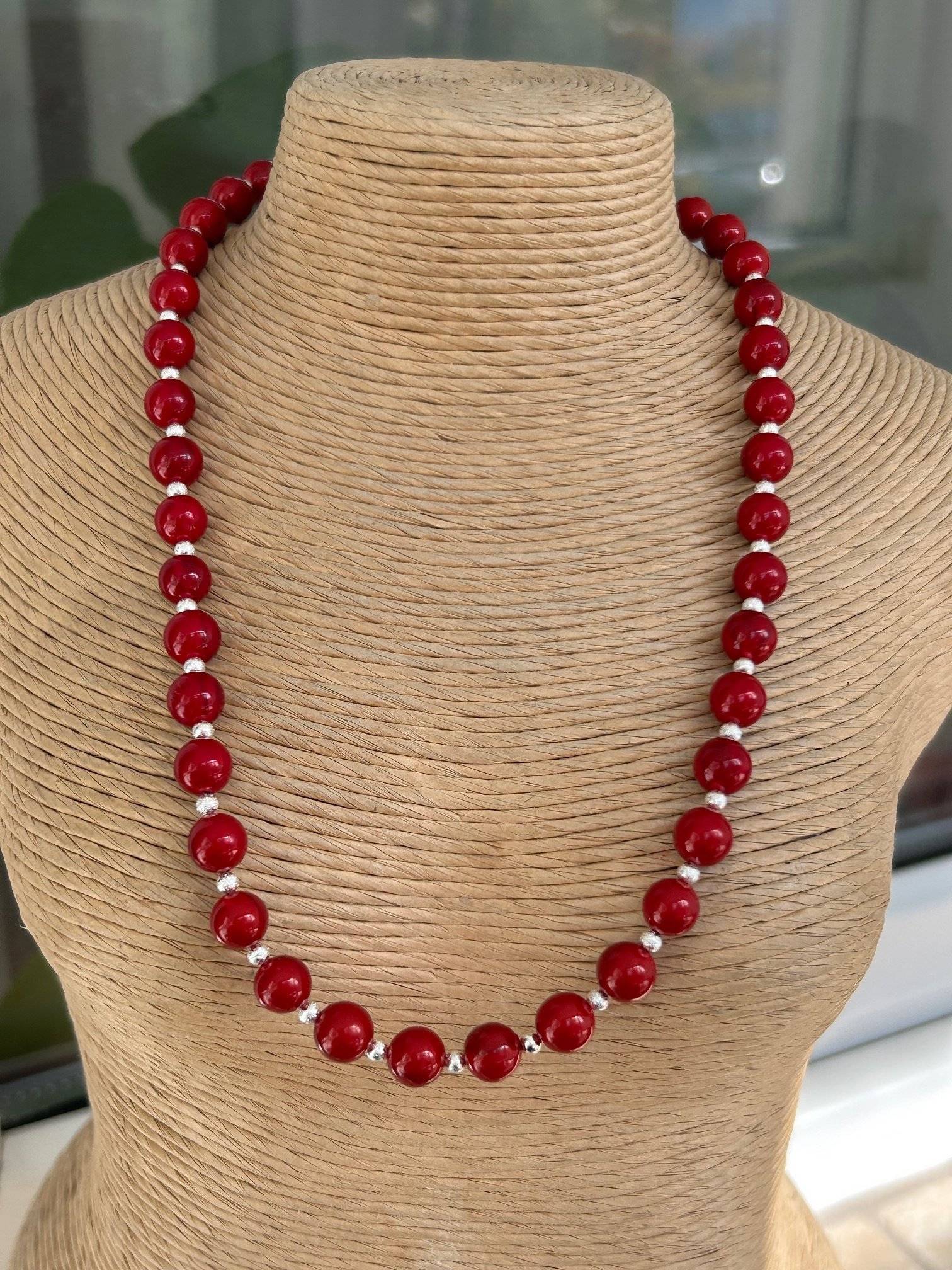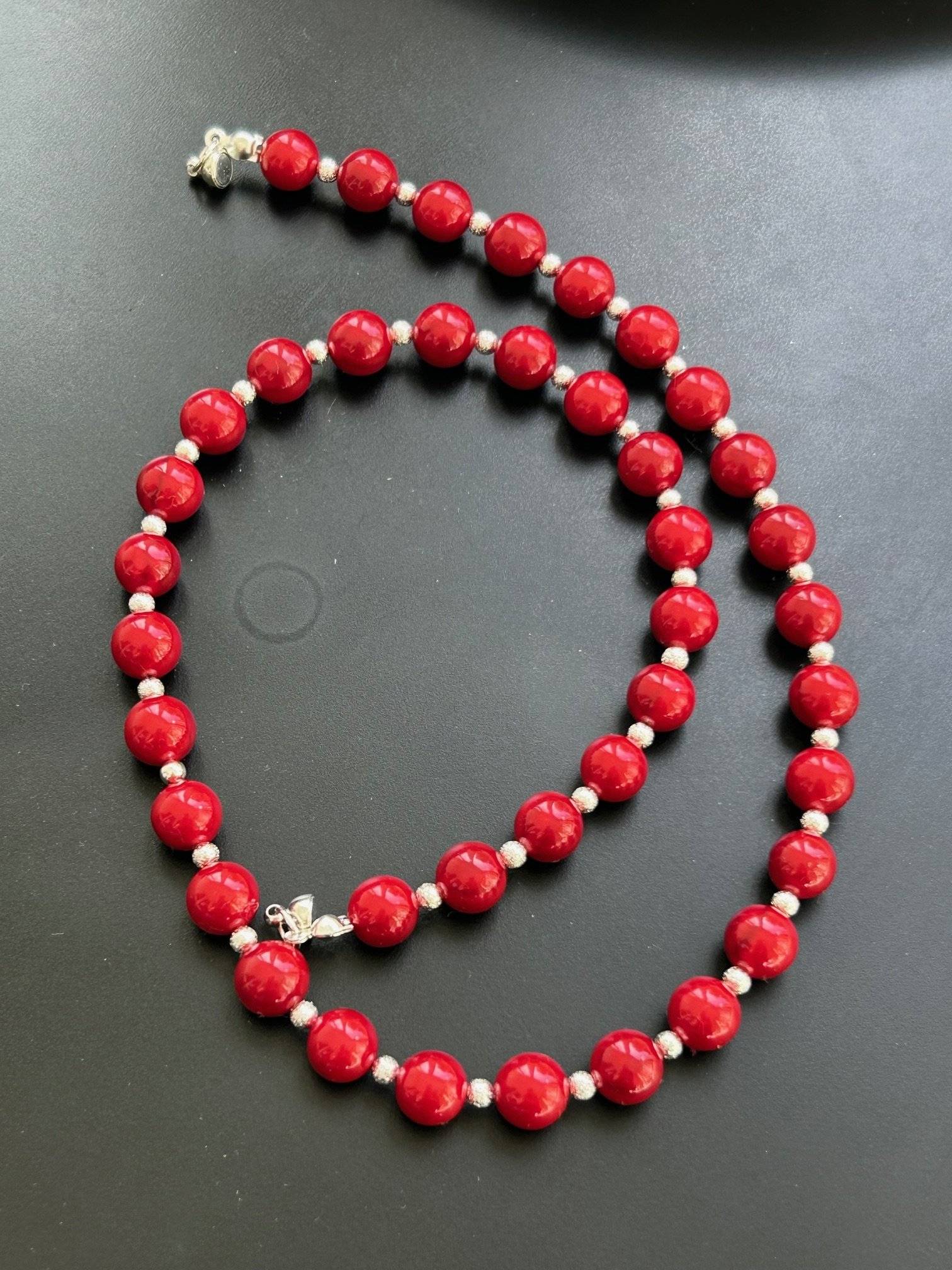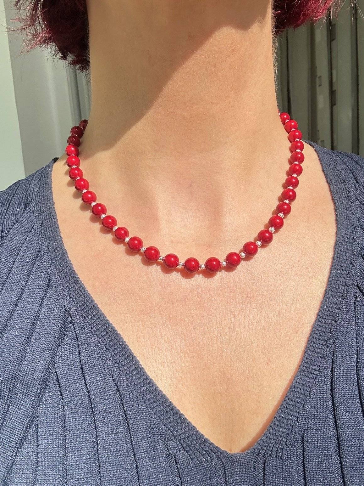 - perlă shell dark red, sfere cu dimensiunea de 8 mm.Lungimea colierului este de cca. 42 cm. Perlele sunt înșirate pe fir oțel siliconat de 0,45 mm grosime, iar închiderea se face cu închizătoare magnetică din aliaj placat cu argint.