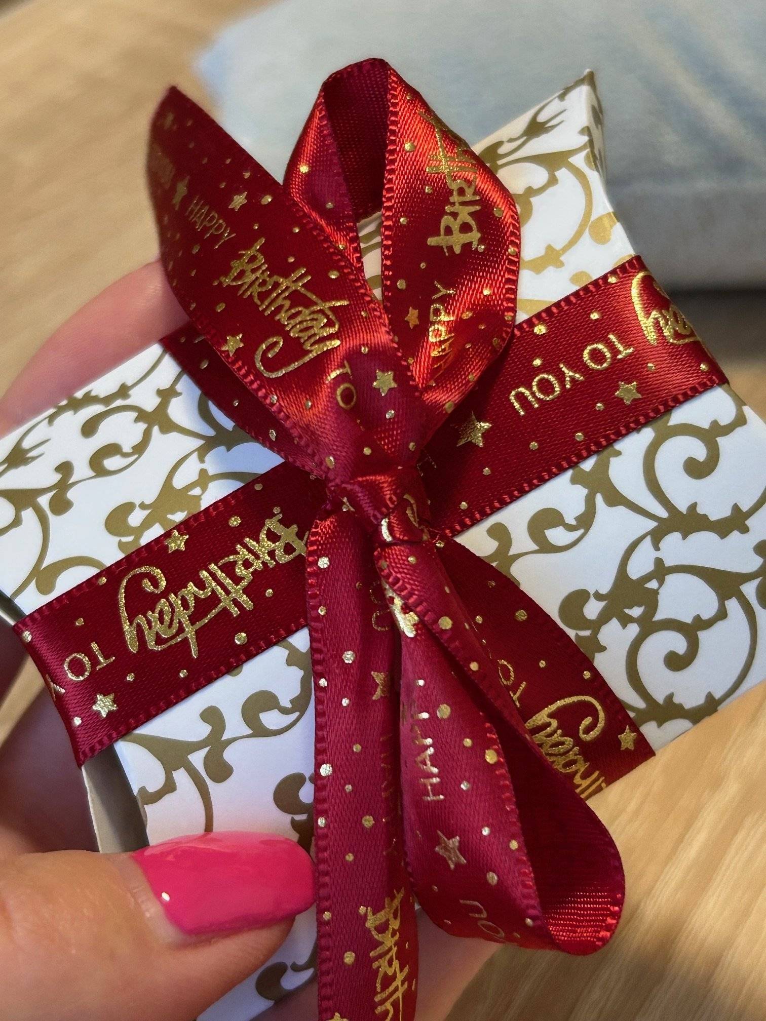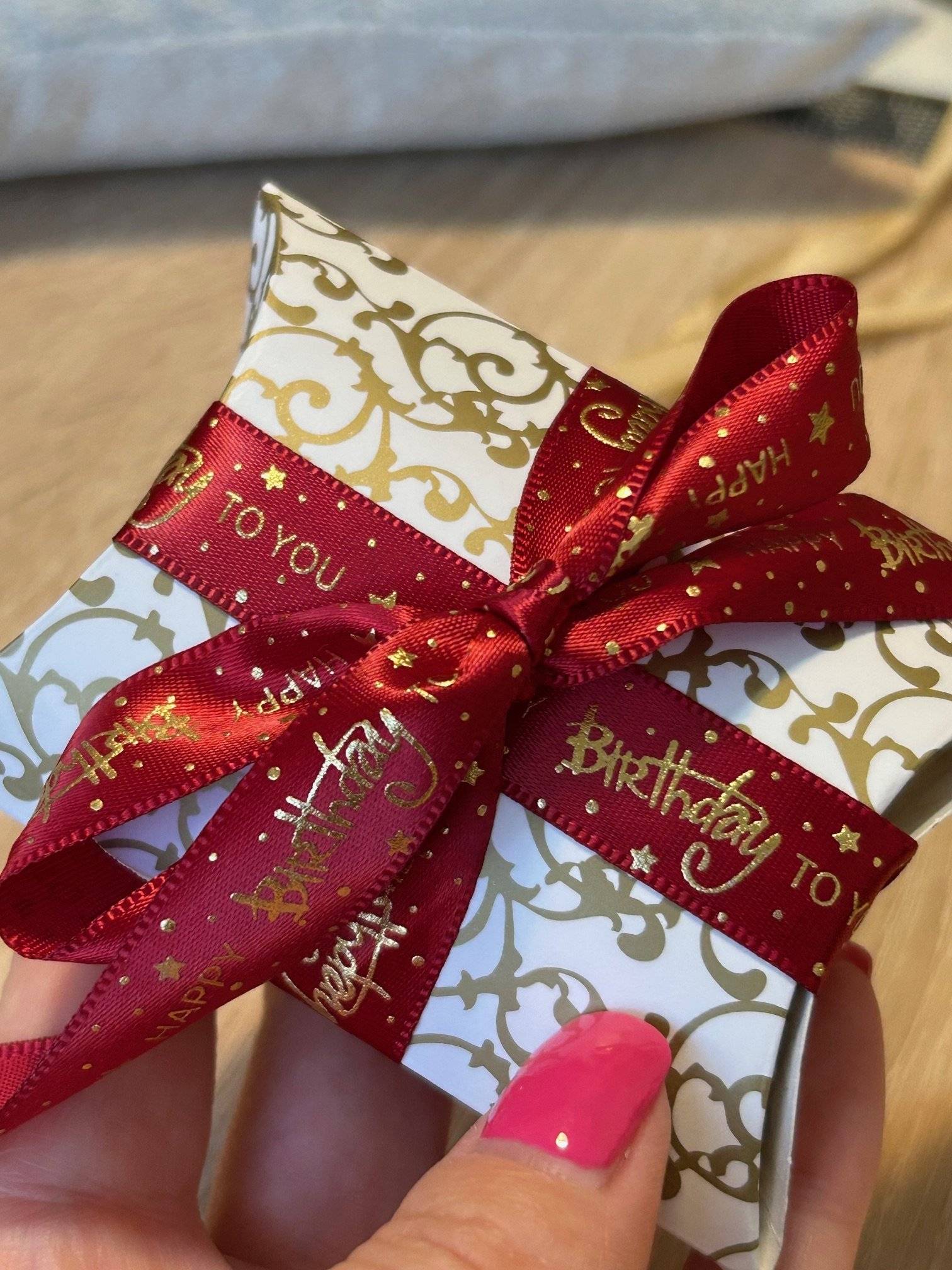 Cutie mică tip pillow, impachetată și legată cu fundă roșie, roz, albă cu mesaj HAPPY BIRTHDAY TO YOU.