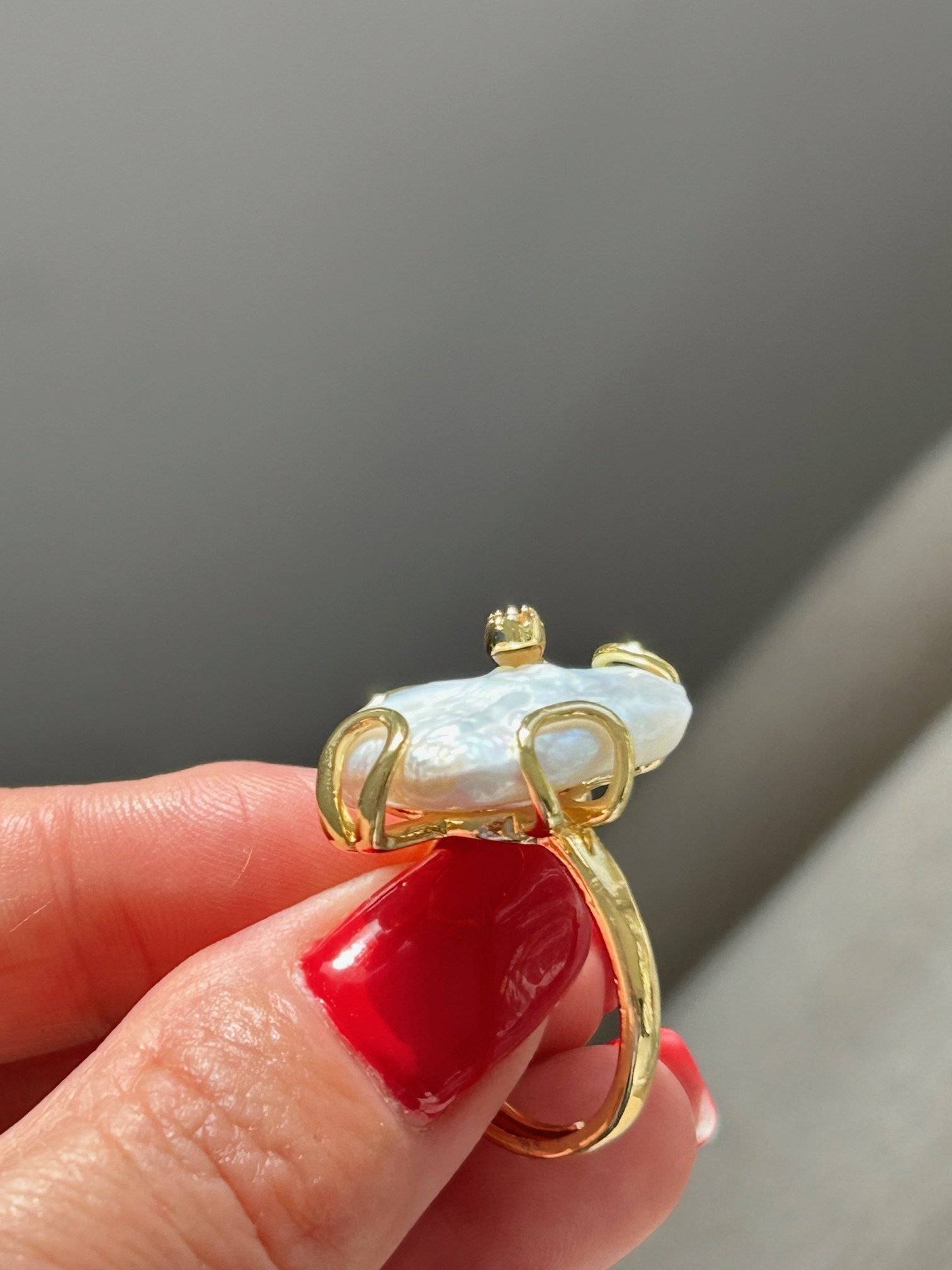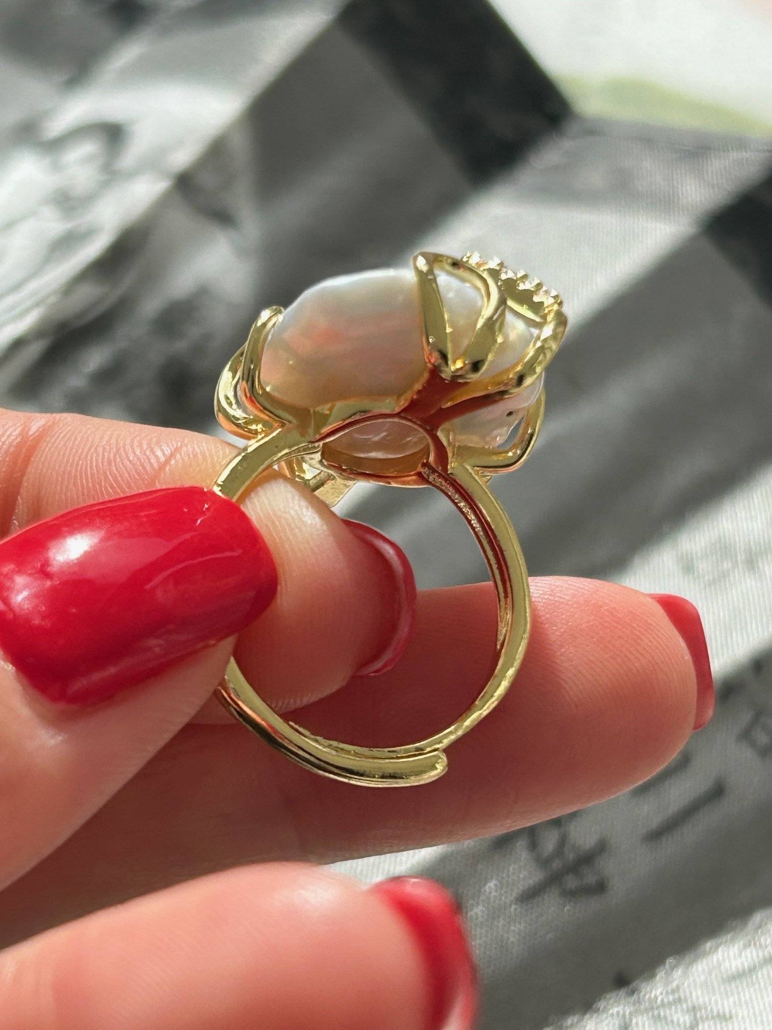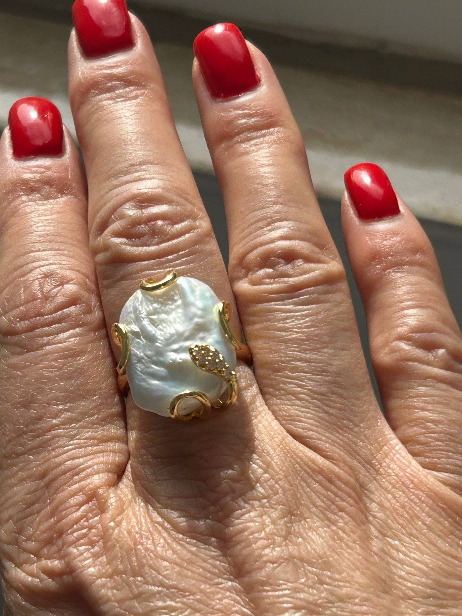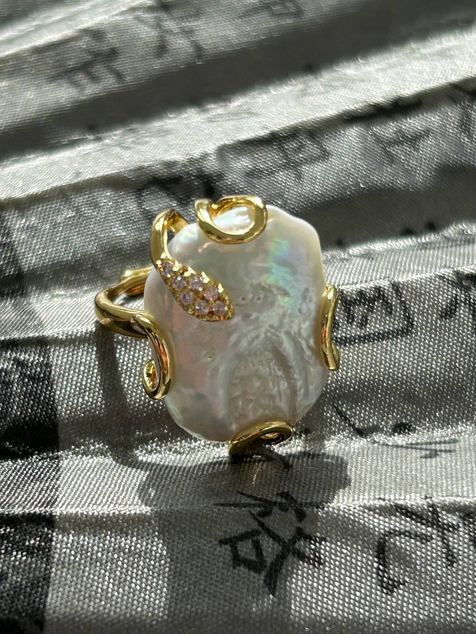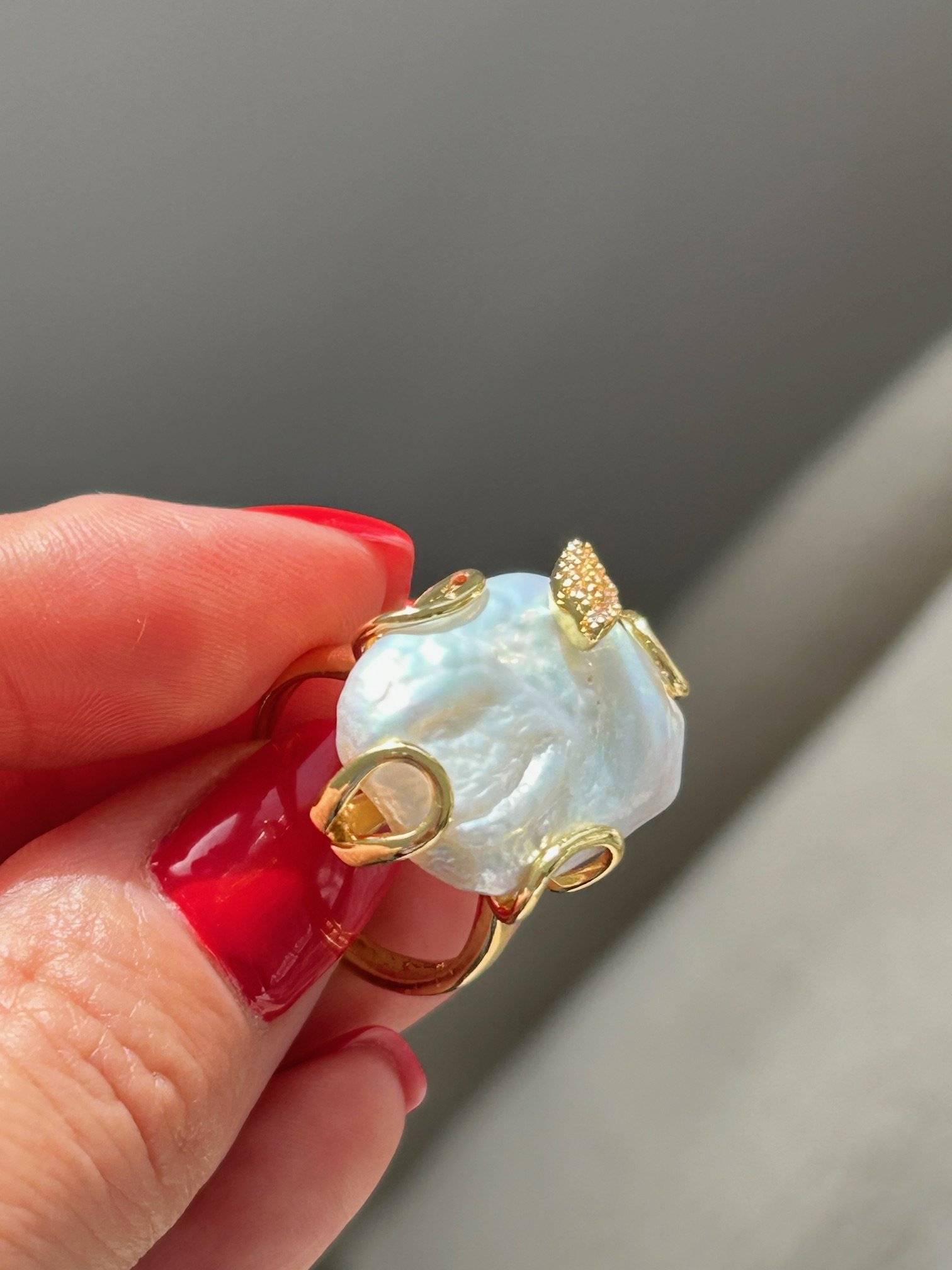 Inel din aliaj de cupru placat cu aur, cu o lucrătură deosebită - model șarpe încolăcind o perlă de cultură baroque. Forma fiecărei perle este unică.