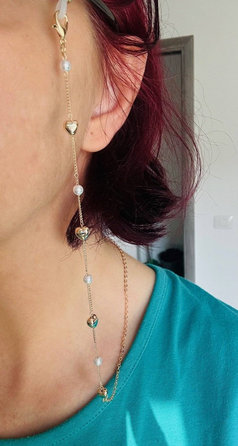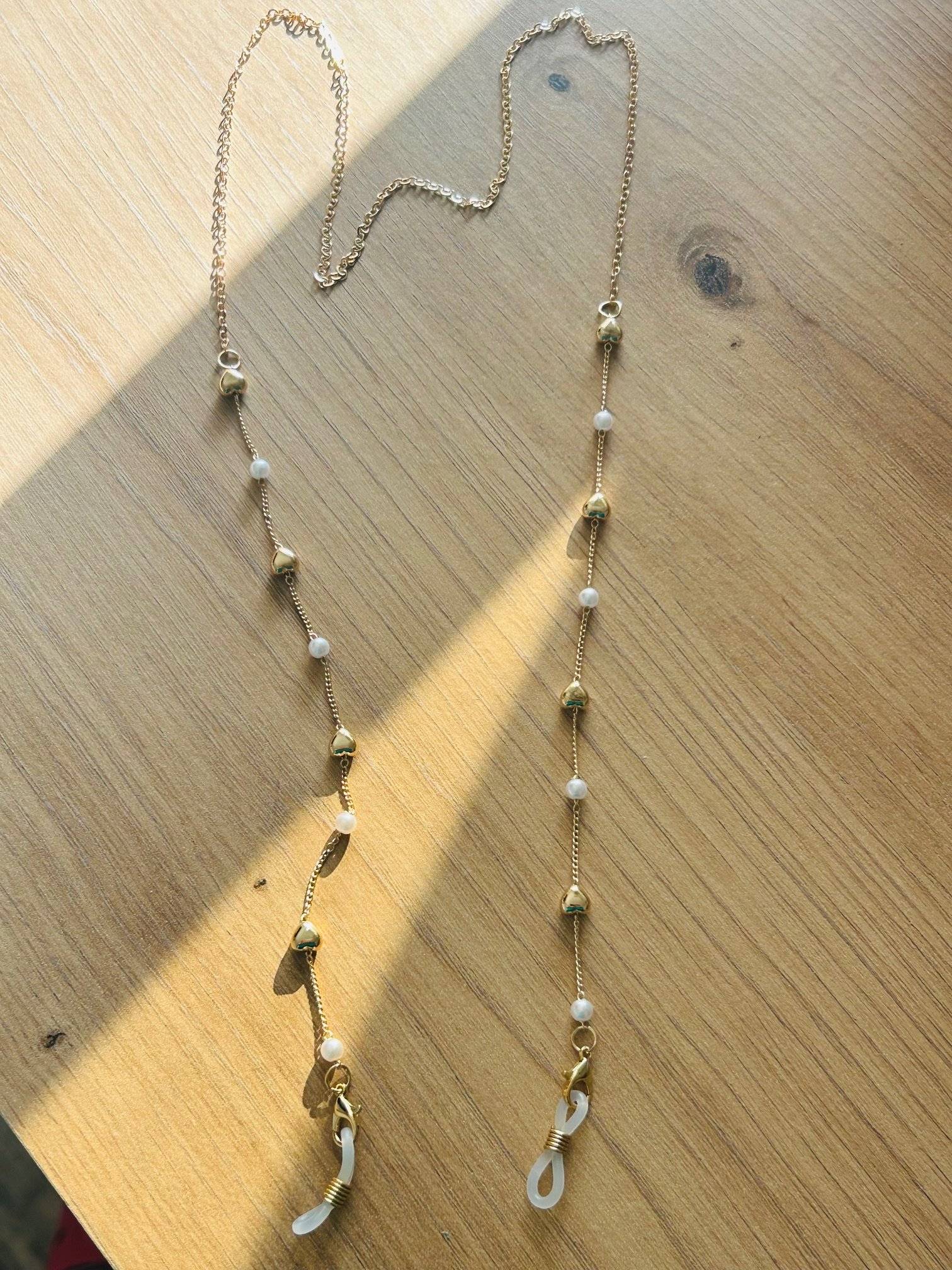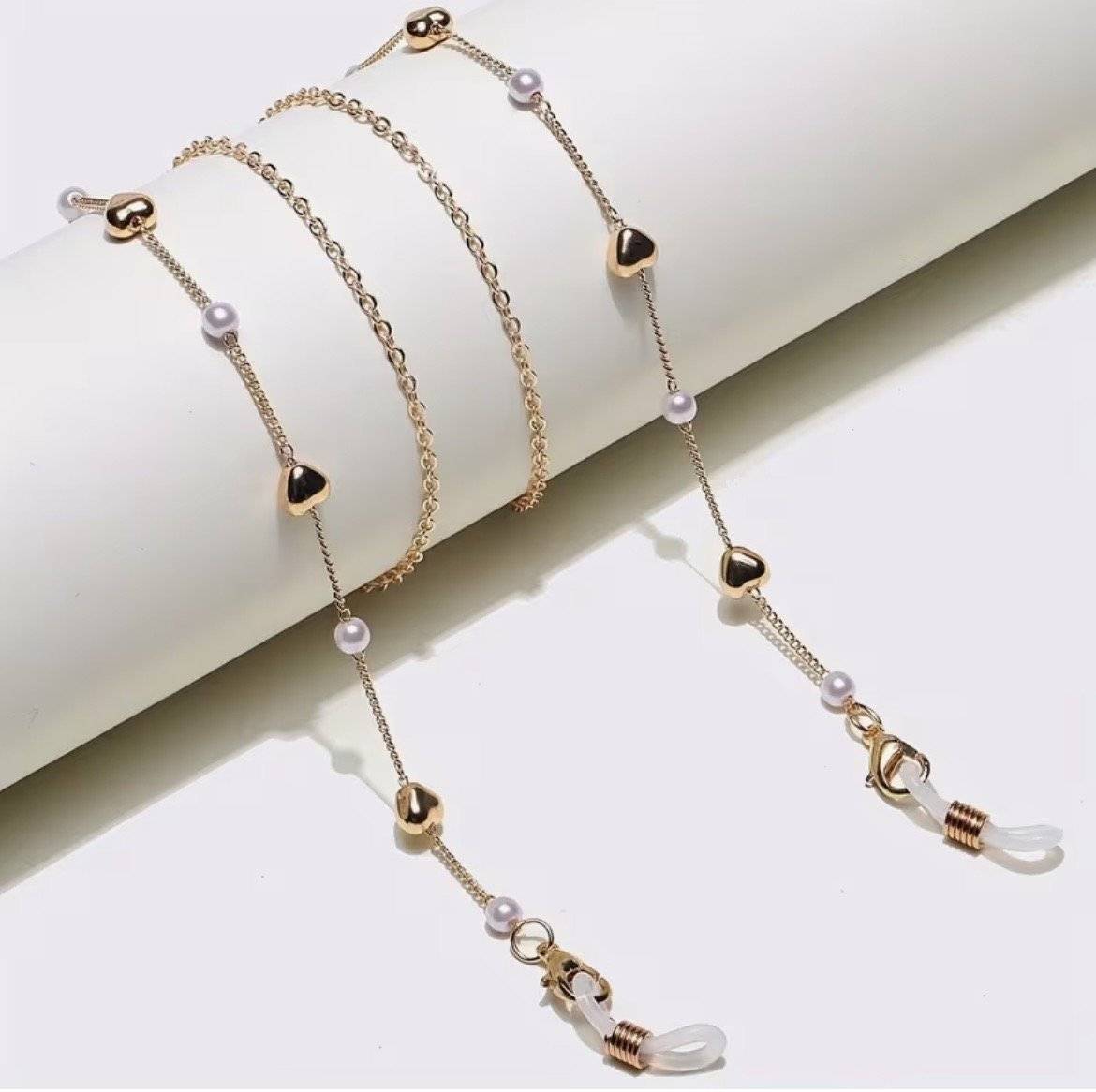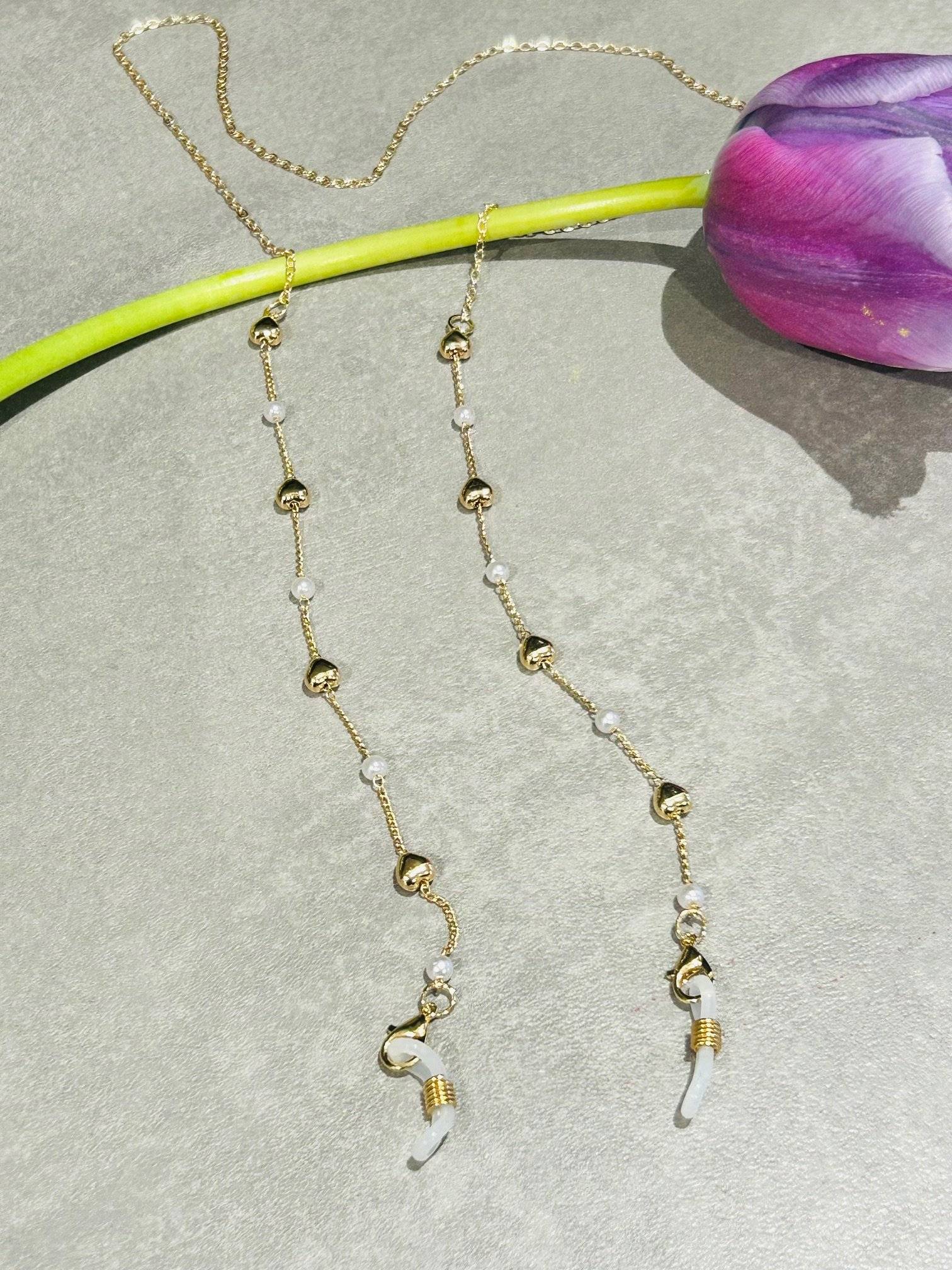 Lanț ochelari auriu cu inimioare si perlute albe