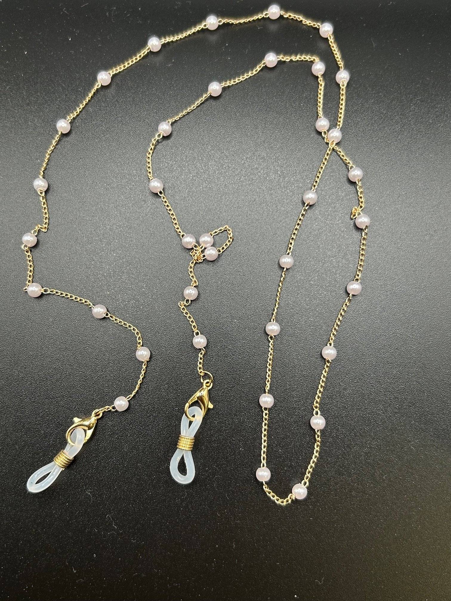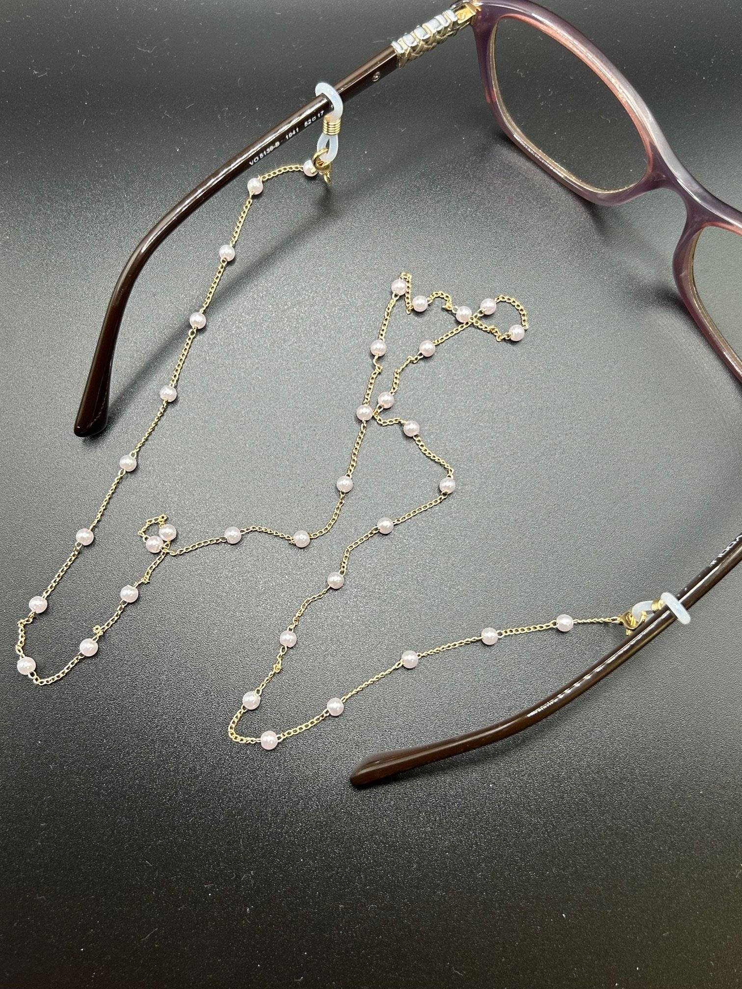 Lanț de ochelari finuț, elegant, versatil din aliaj auriu cu perluțe mici albe, lungimea de cca.70 cm.