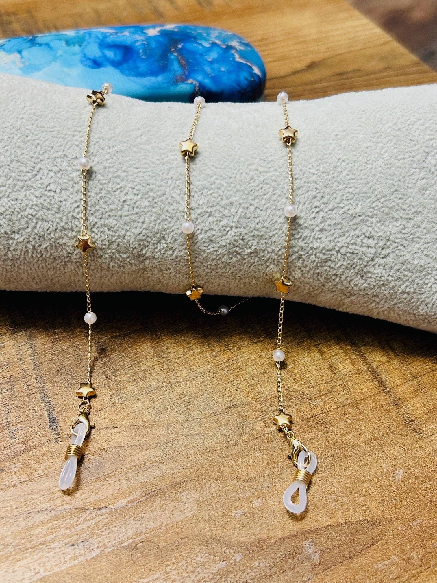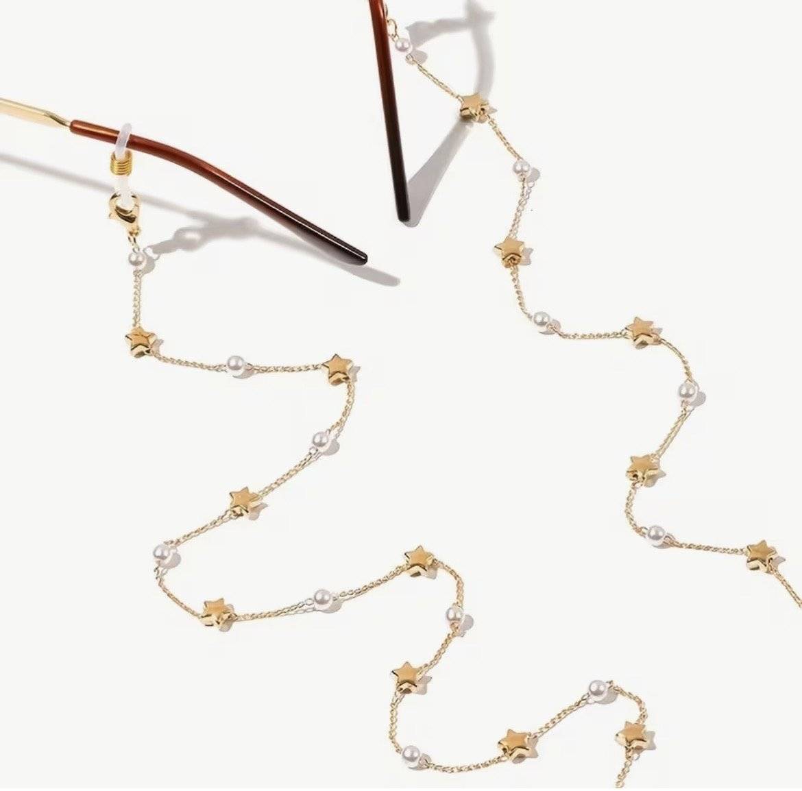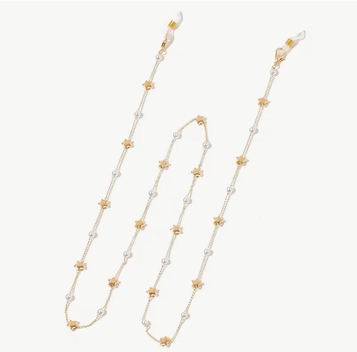 Lanț de ochelari finuț, elegant, versatil din aliaj auriu cu steluțe si perluțe albe, cu lungimea de cca.72 cm.