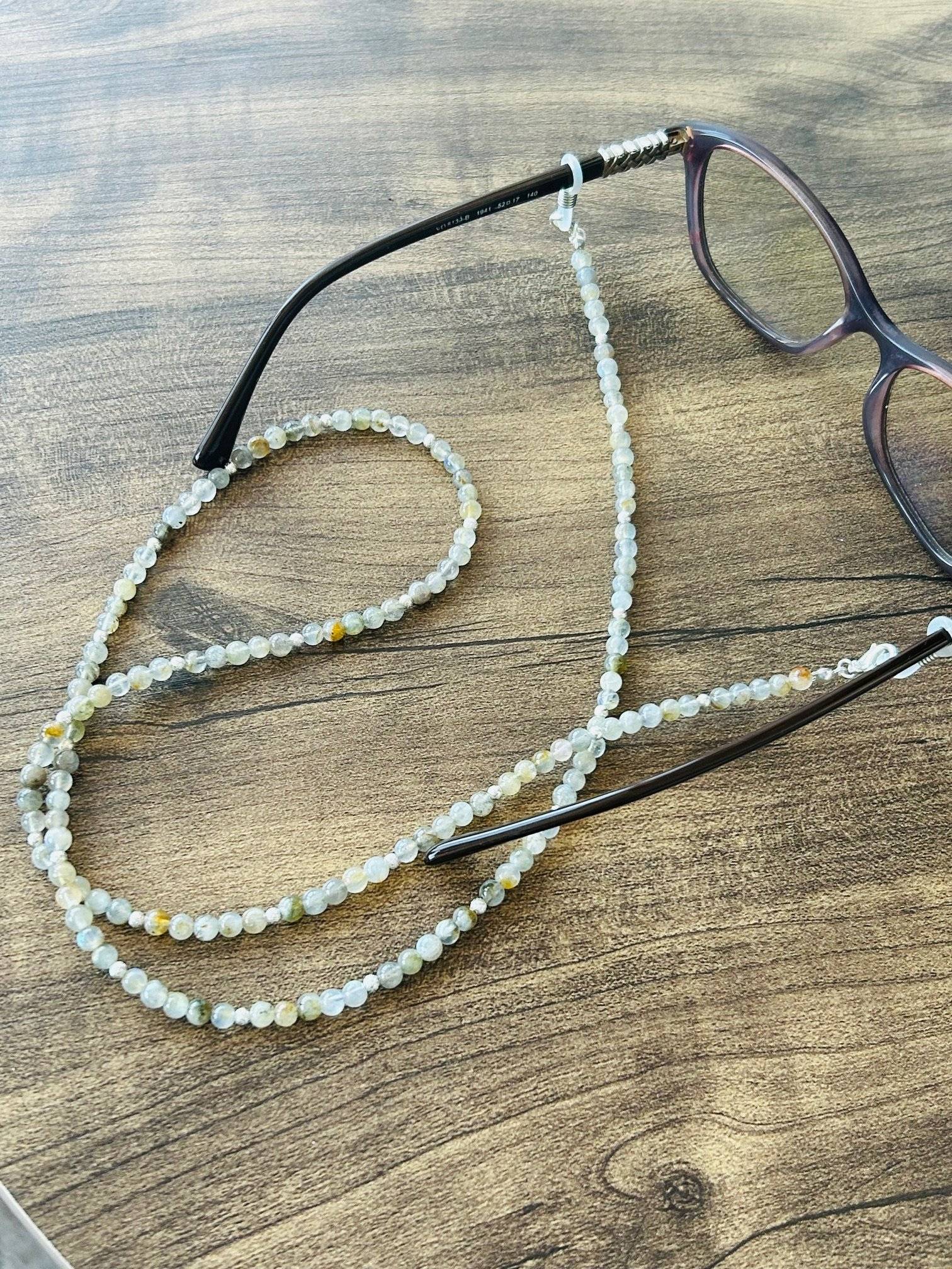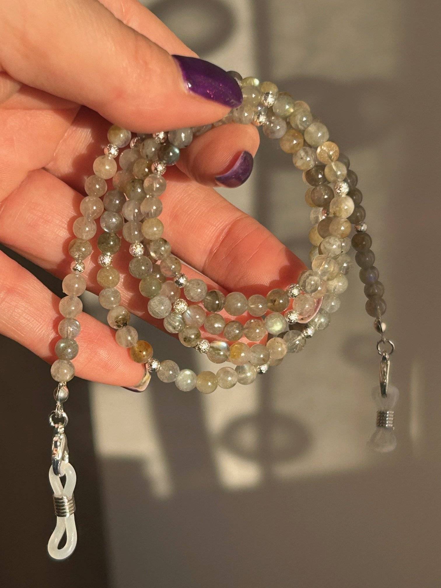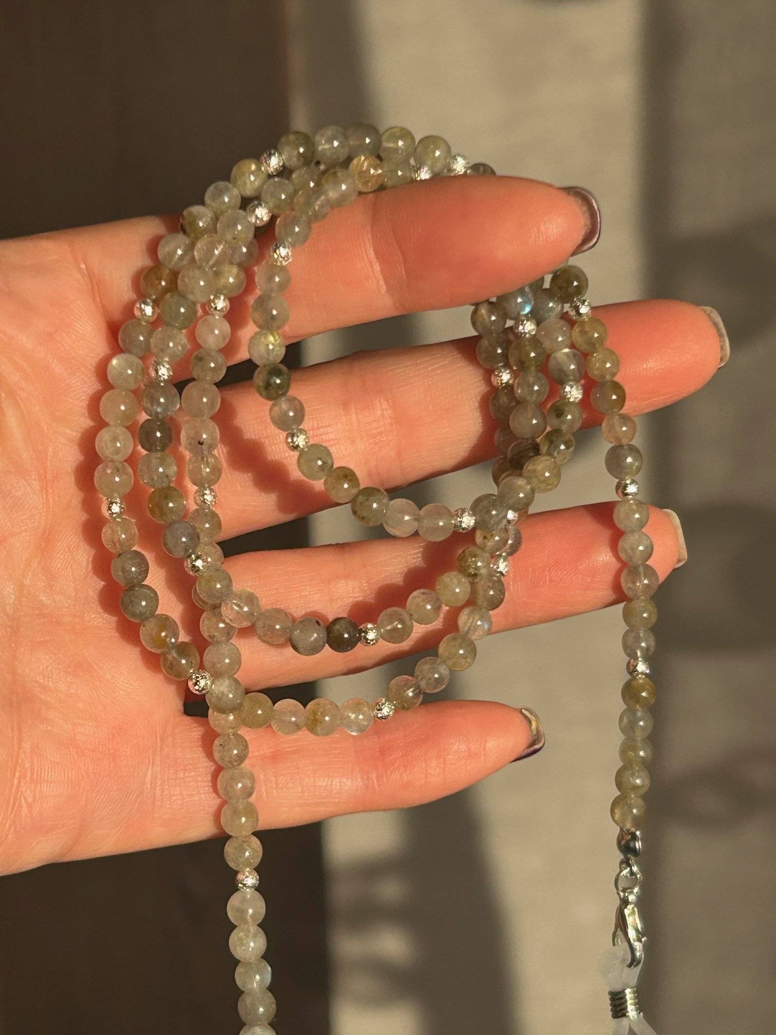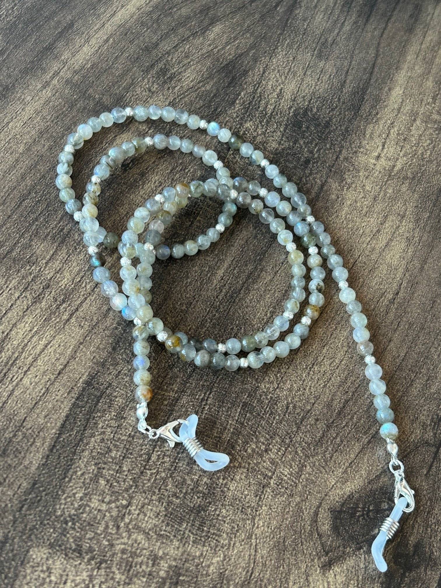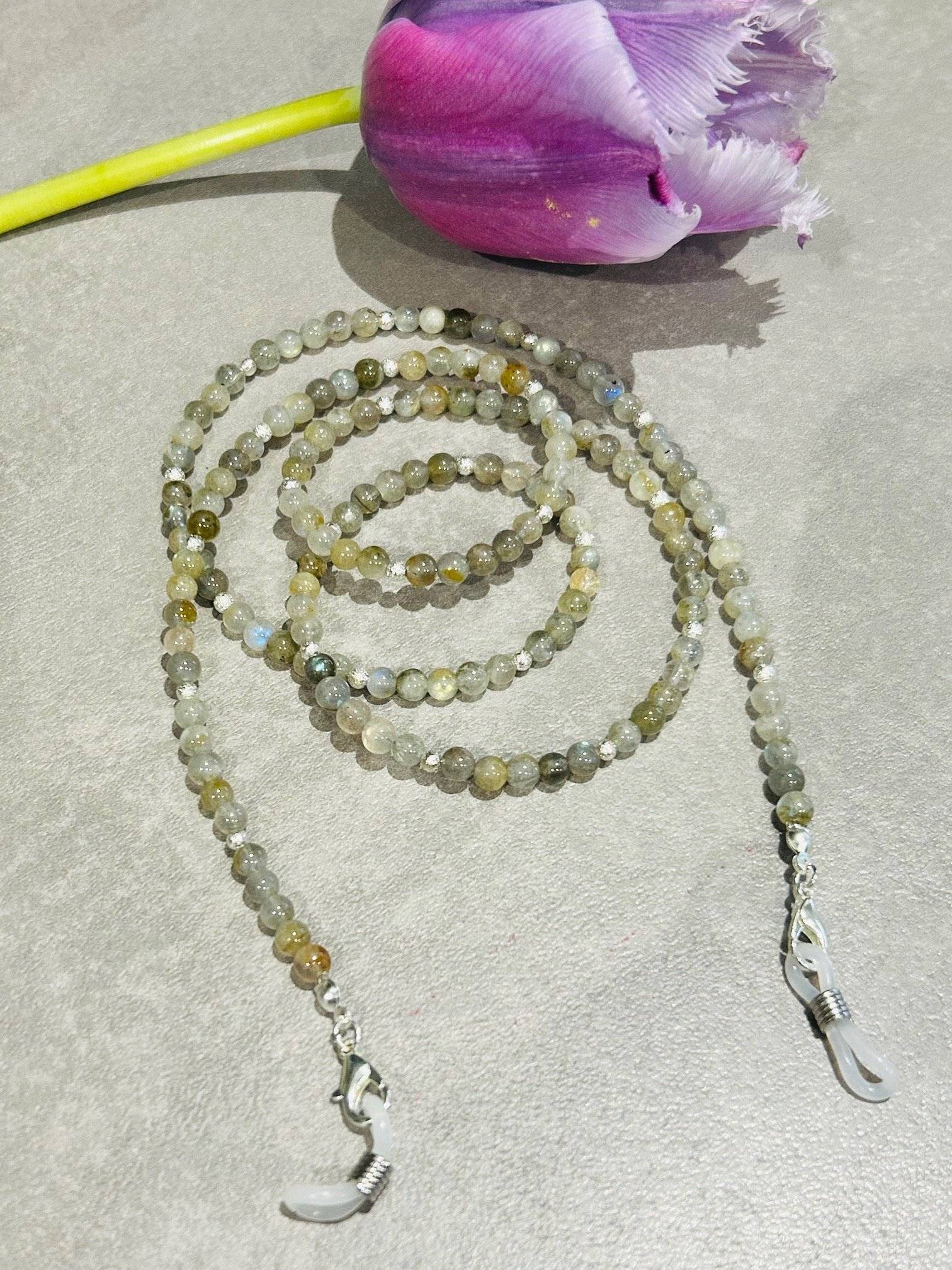 Lanț de ochelari finuț, elegant, versatil confecționat manual din mărgele de LABRADORIT de 4 mm și distanțiere metalice SPARKLEDUST.