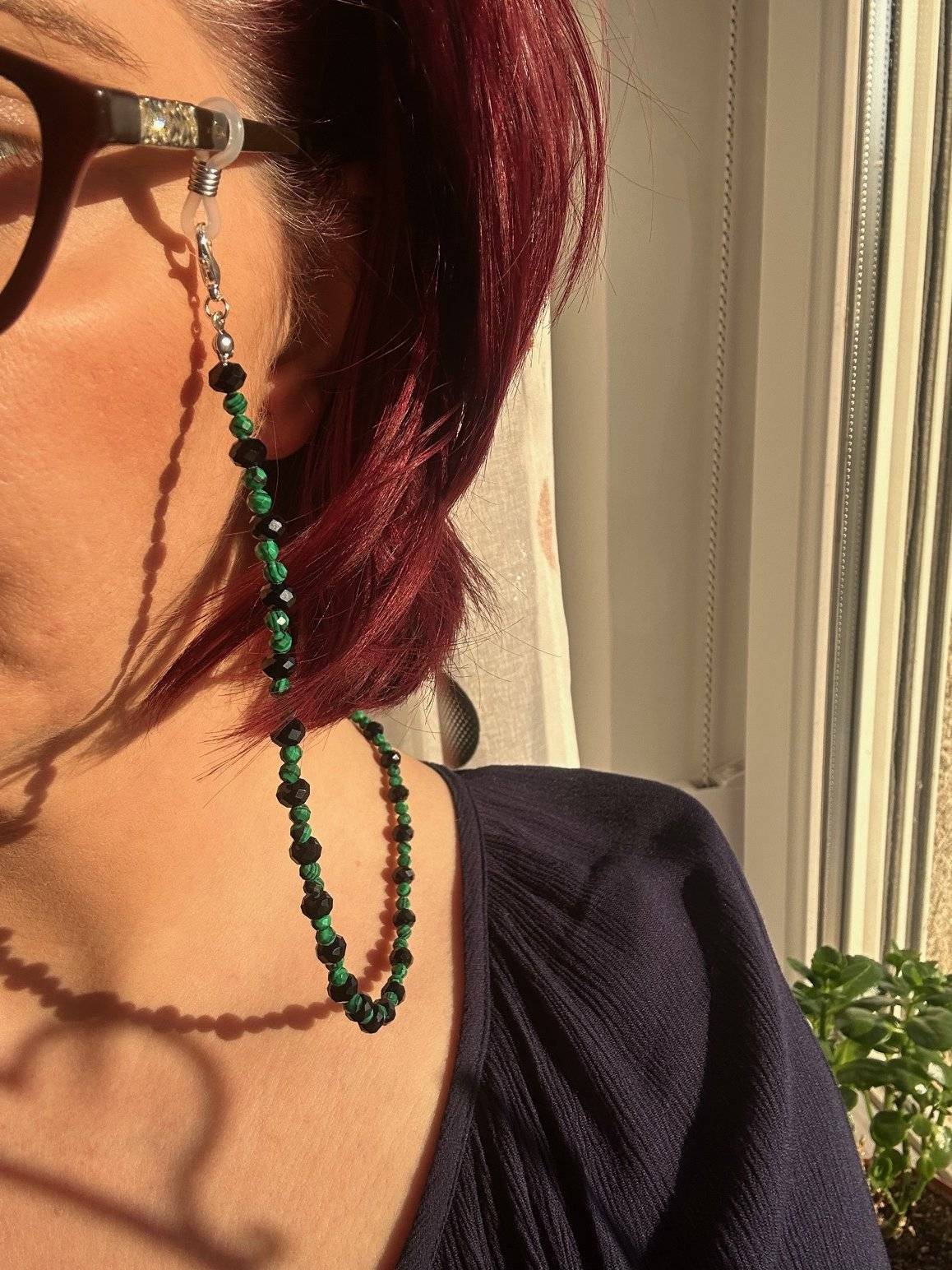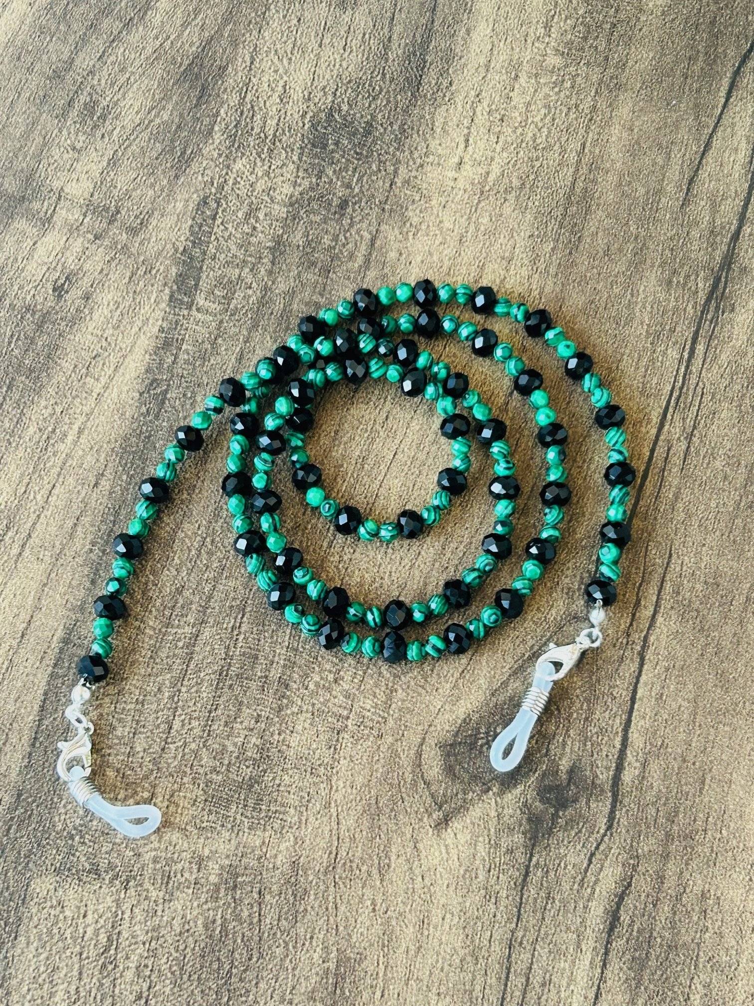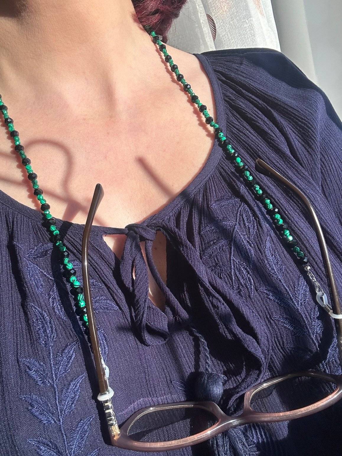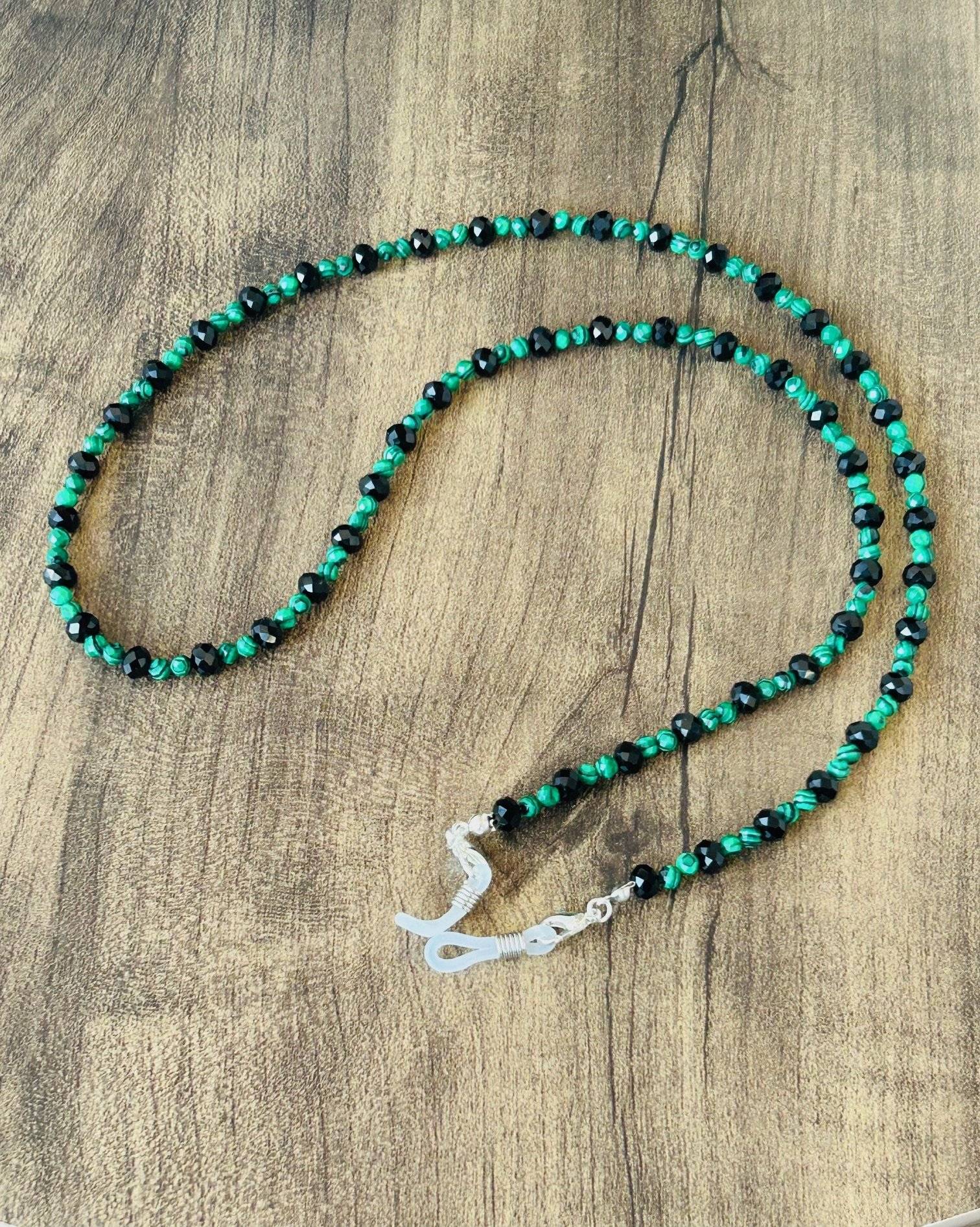 Cochet, versatil, cu o strălucire glamour, lanțul de ochelari este confecționat manual din sfere semiprețioase de malachit fațetat de 4 mm și cristale negre, cu dimensiunea de 6x8 mm.
