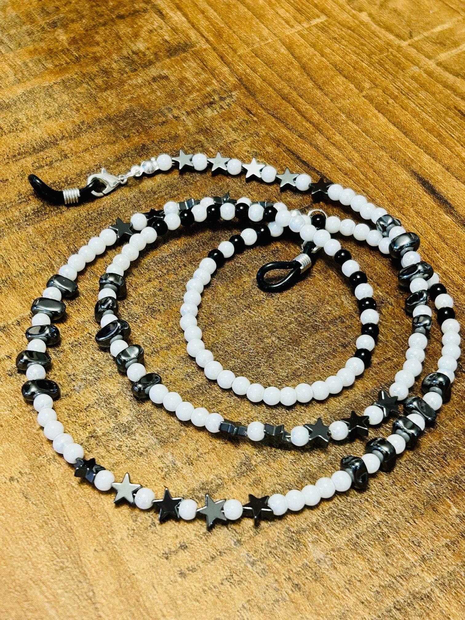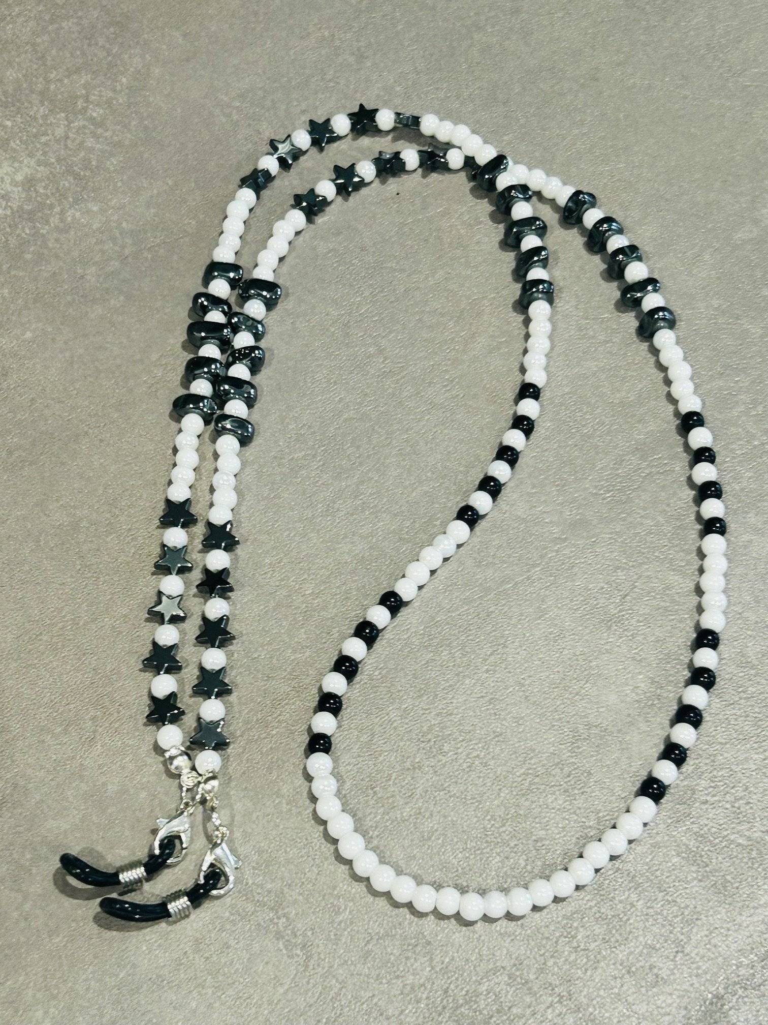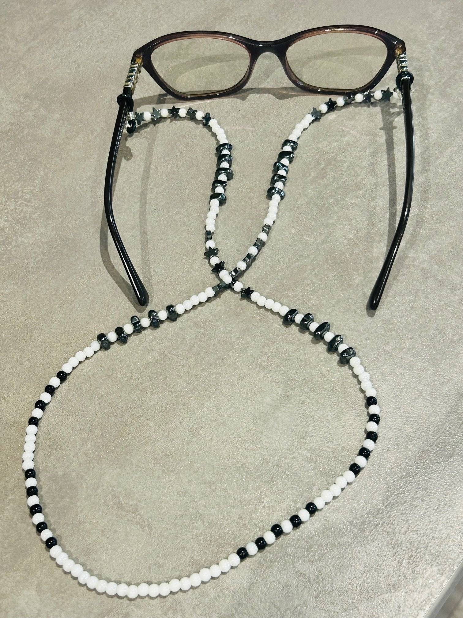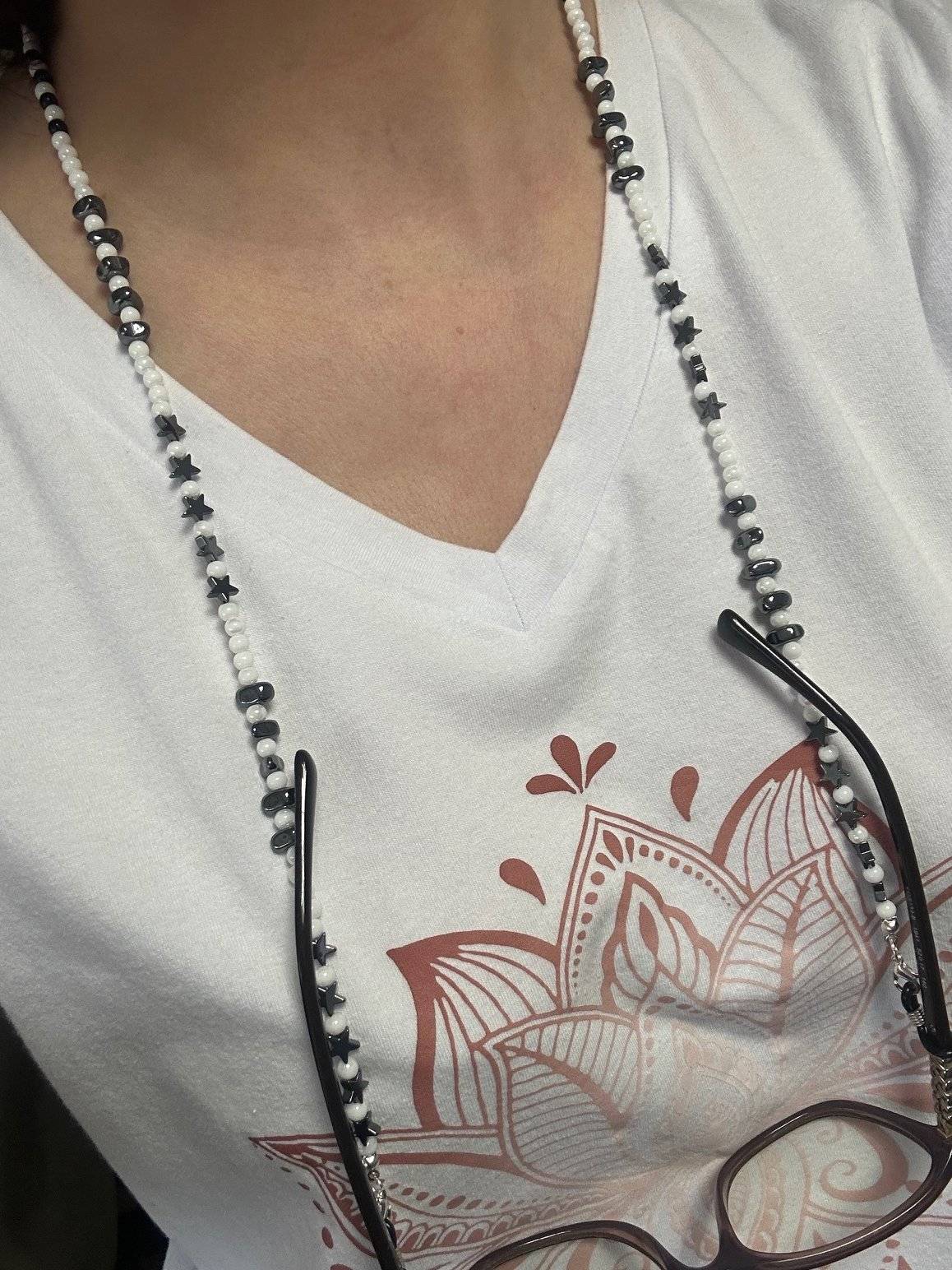 Lanț de ochelari modern, versatil confecționat manual din perle preciosa alb opac perlat de 4 mm, onix de 4 mm și hematit steluțe/chipsuri cu dimensiuni neregulate.