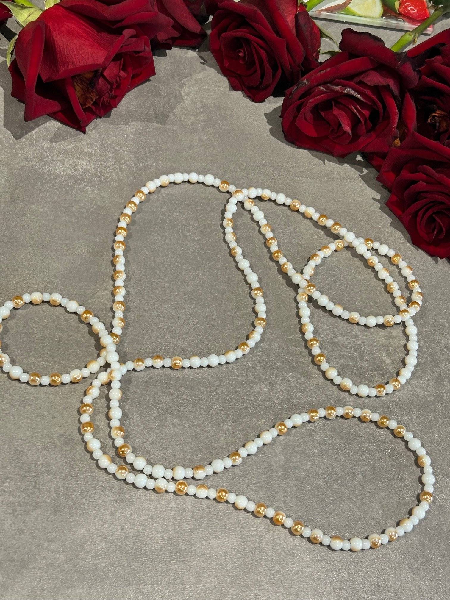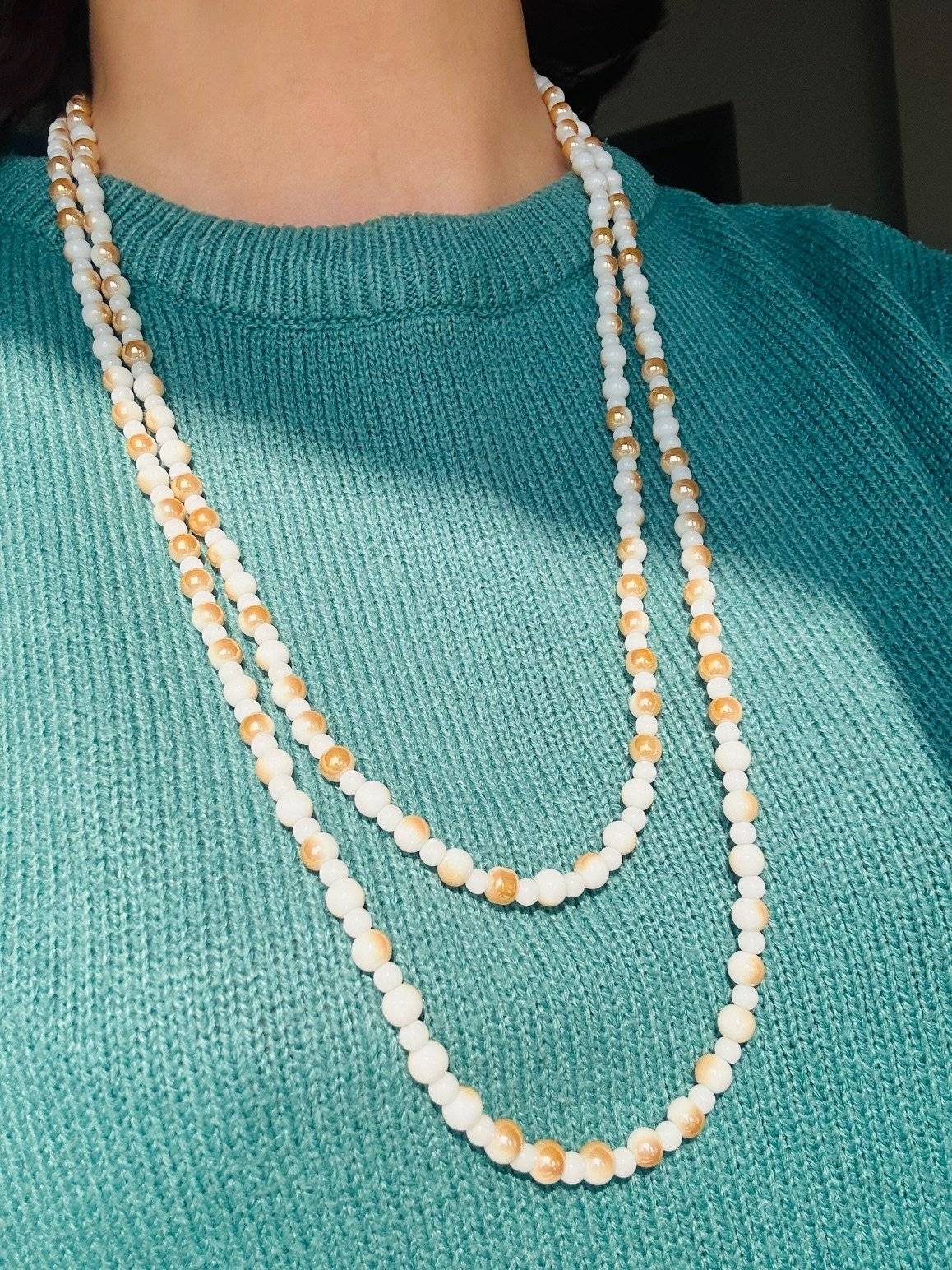 Lungimea șiragului de mărgele este de cca.154 cm, ceea ce dă senzația de abundență și permite purtarea dublat la gât.