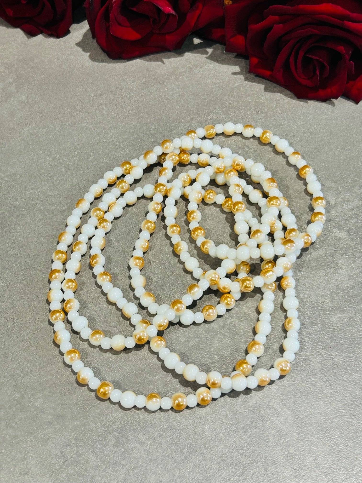 Colierul este confecționat din mărgele de sticlă perlate, culoare alb-auriu, sfere de 6 mm și mărgele de sticlă, culoare alb opac, cu dimensiunea de 4 mm.