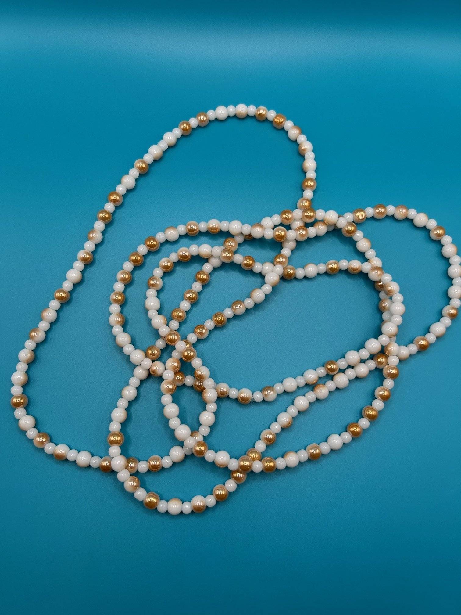 Șiragul este confecționat din mărgele de sticlă perlate, culoare alb-auriu, sfere de 6 mm și mărgele de sticlă, culoare alb opac, cu dimensiunea de 4 mm.